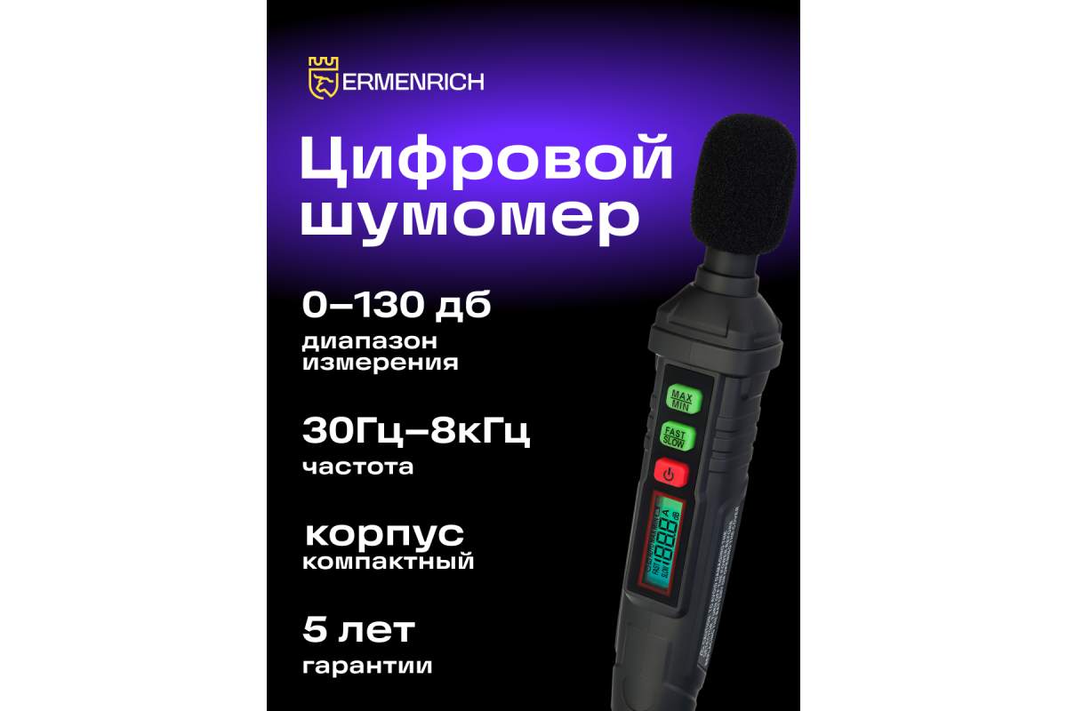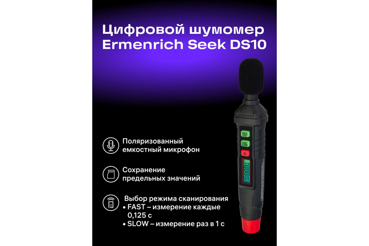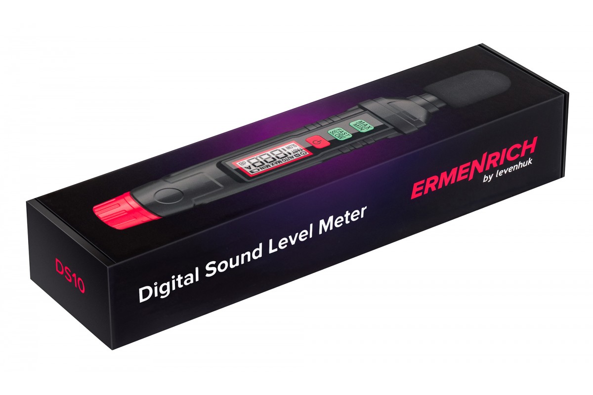Ermenrich Seek DS10 – компактный, практичный цифровой шумомер, который позволяет с высокой точностью определить уровень шума как в помещении, так и вне его. Используется шумомер для измерения уровня звука в бытовых, учебных, промышленных помещениях, например, для контроля за соблюдением условий труда или при тестировании звукоизоляции.
