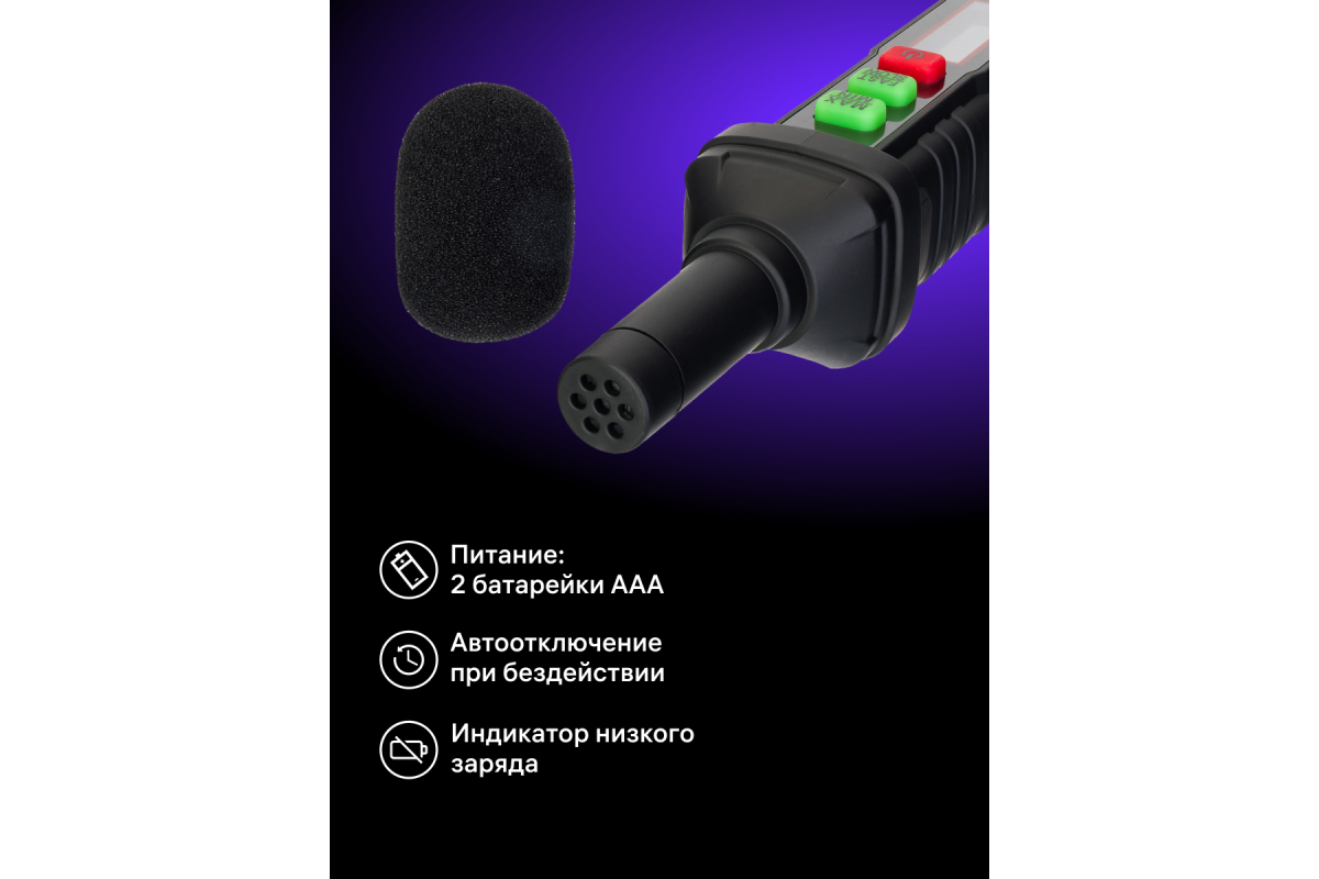 Шумомер имеет небольшие размеры и работает от стандартных батареек (не входят в комплект), что обеспечивает мобильность и оперативность при работе. При этом он позволяет точно замерять уровень звука в диапазоне от 30 до 130 дБ. Функция запоминания предельных значений позволит отслеживать динамику измерений.