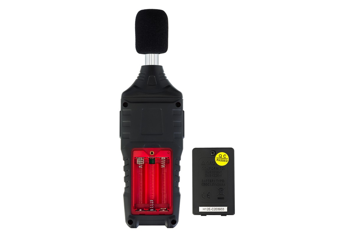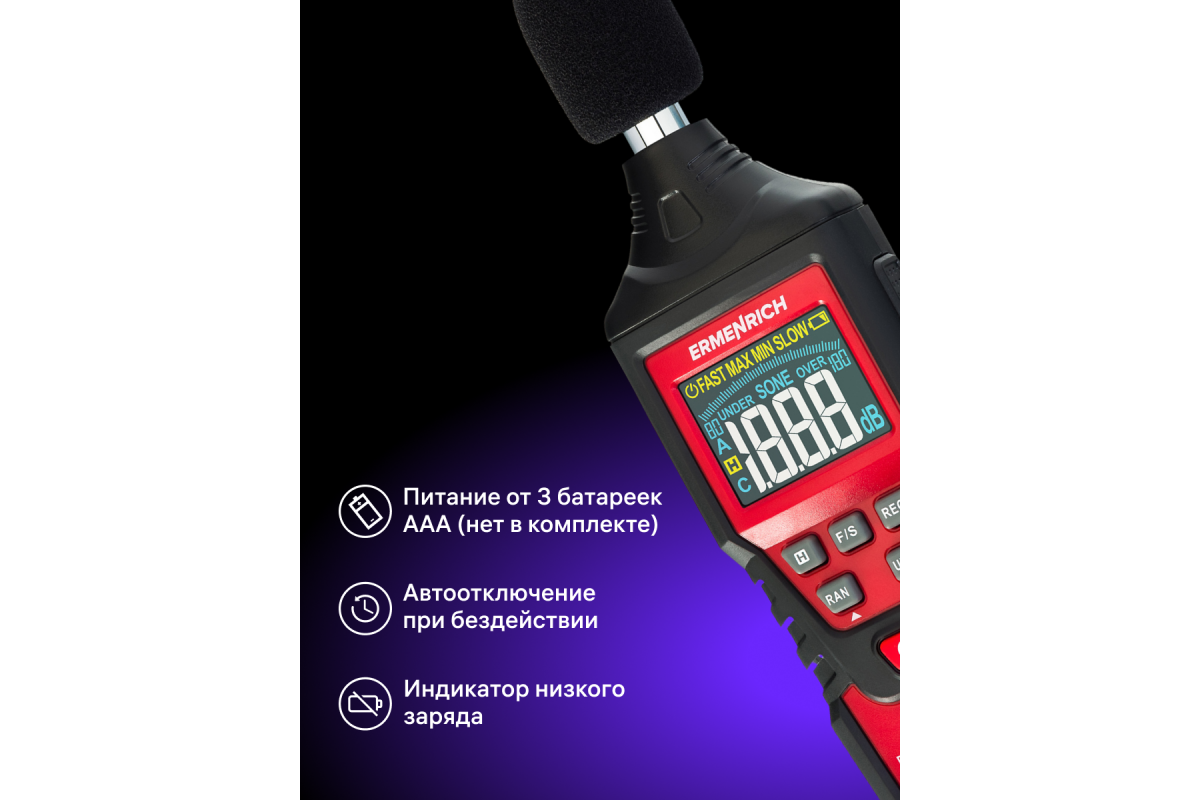 Шумомер работает от стандартных батареек типа ААА (нет в комплекте). Индикатор низкого заряда батареи покажет, когда необходимо заменить элементы питания. А функция автоотключения помогает экономить энергию.