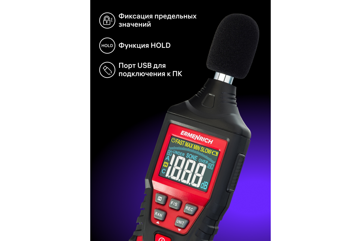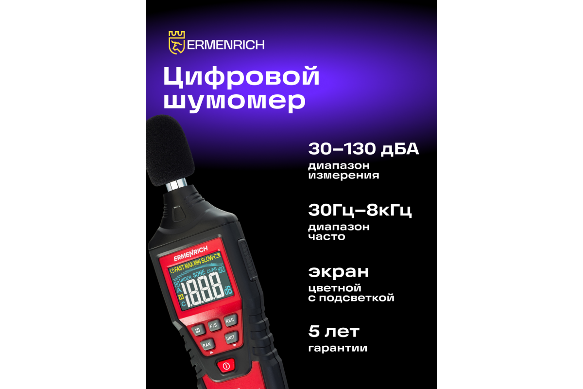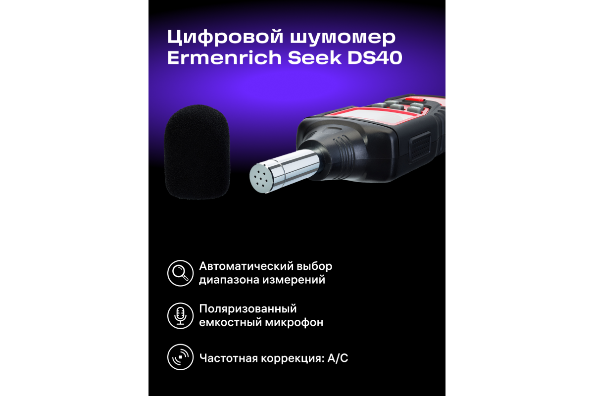 Шумомер Ermenrich Seek DS40 – современный цифровой прибор для измерения уровня звука в помещениях и на улице. Он позволяет быстро и точно определить уровень шума в диапазоне 30–130 дБ. Шумомер может использоваться для обеспечения необходимых условий труда, проживания, контроля производственных процессов и многого другого.