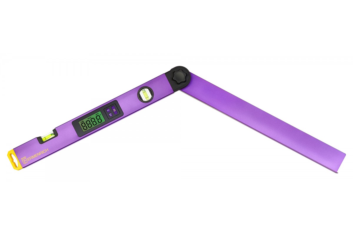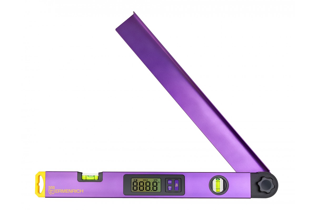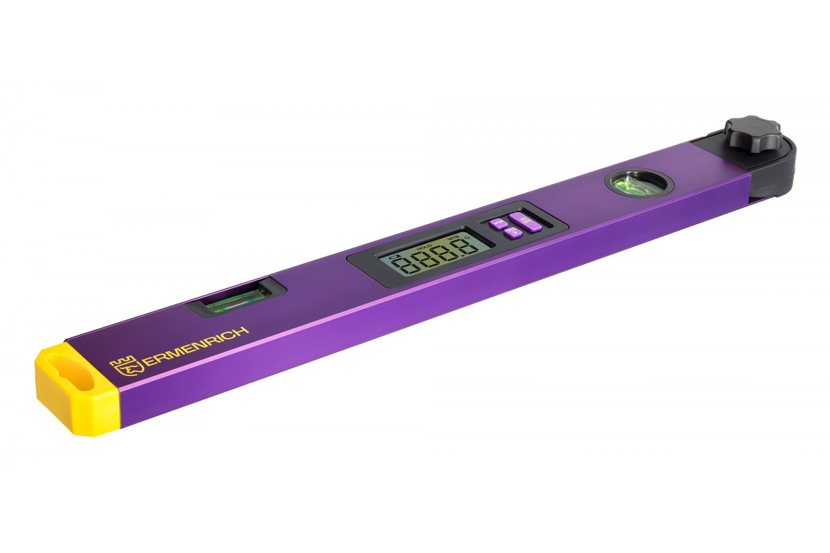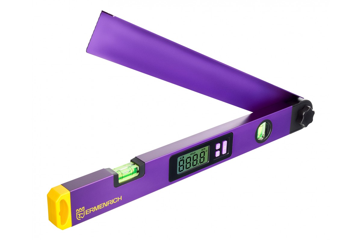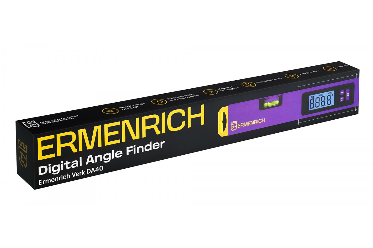 Угломер Ermenrich Verk DA40 проводит измерения в диапазоне 0–230 градусов. Корпус дополнен двумя встроенными пузырьковыми уровнями для точного позиционирования и отличается высокой прочностью: материалами для него послужили алюминий и ABS-пластик. Среди других преимуществ прибора – автоматическая калибровка и функция установки на ноль. Работает угломер от стандартной 9-вольтовой батарейки типа «Крона». Предусмотрена опция автоотключения, помогающая продлить срок работы прибора от одной батарейки.
