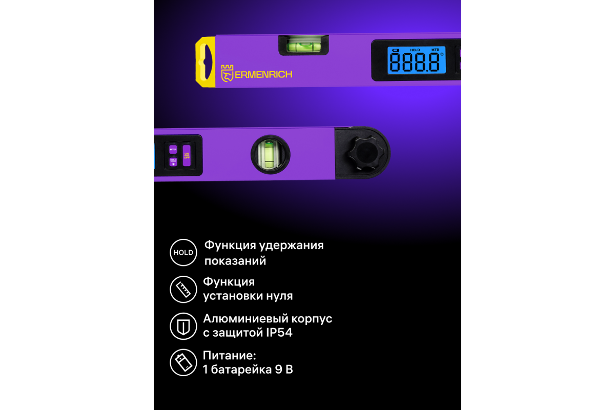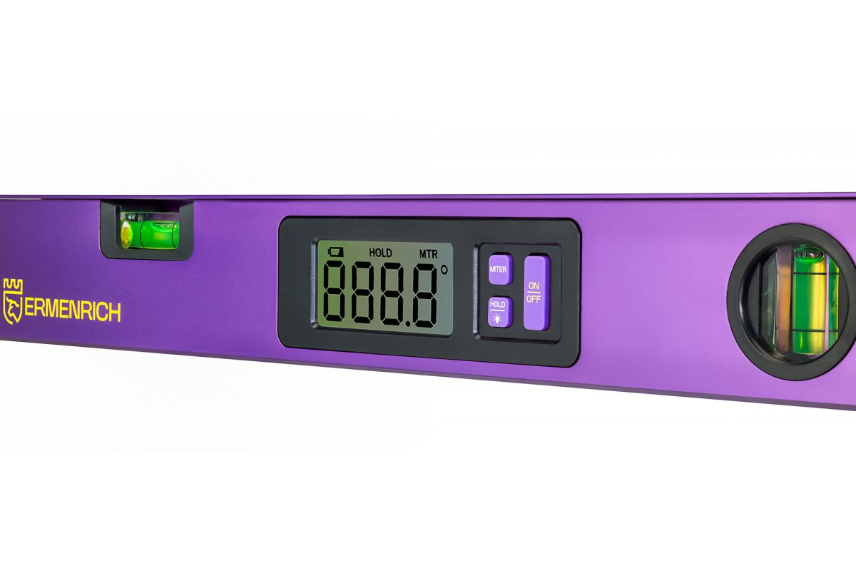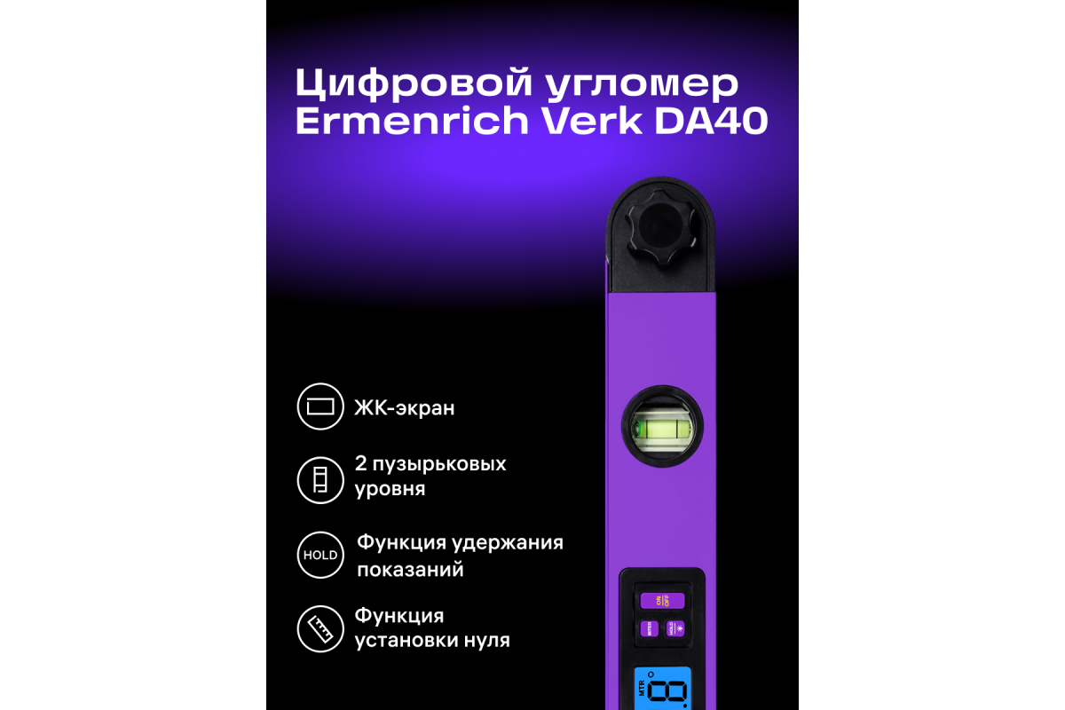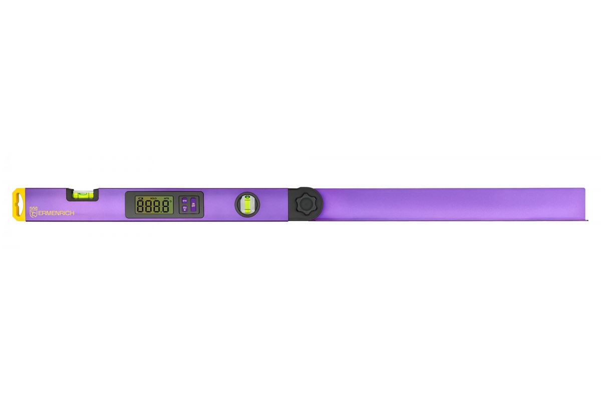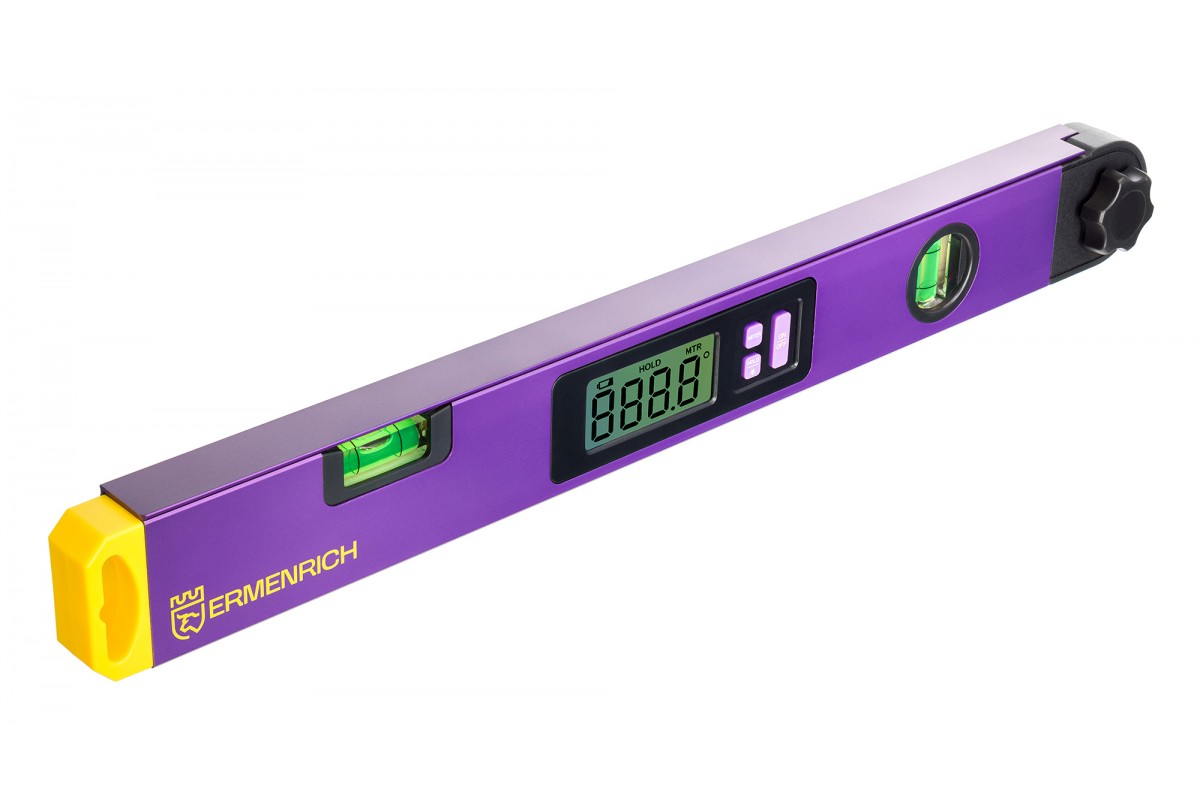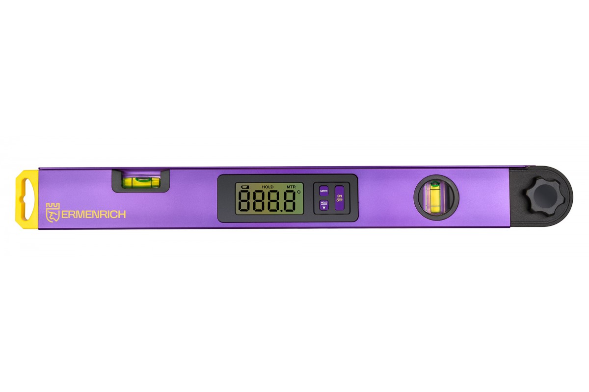 Угломер Ermenrich Verk DA40 проводит измерения в диапазоне 0–230 градусов. Корпус дополнен двумя встроенными пузырьковыми уровнями для точного позиционирования и отличается высокой прочностью: материалами для него послужили алюминий и ABS-пластик. Среди других преимуществ прибора – автоматическая калибровка и функция установки на ноль. Работает угломер от стандартной 9-вольтовой батарейки типа «Крона». Предусмотрена опция автоотключения, помогающая продлить срок работы прибора от одной батарейки.