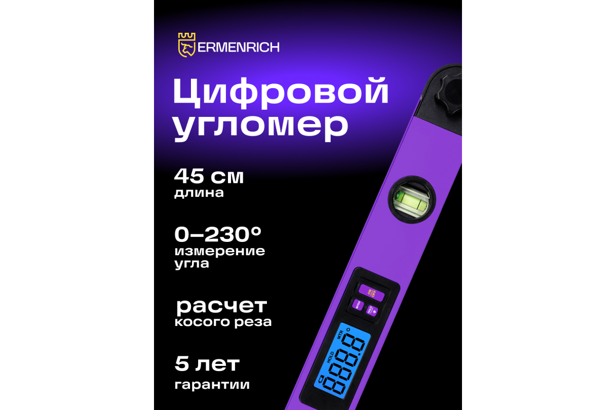 Ermenrich Verk DA40 – это цифровой угломер, который станет надежным помощником строителя, мастера по ремонту или монтажу оборудования. Прибор служит для точного измерения углов между поверхностями, а также может использоваться при распиловке длинных заготовок благодаря режиму расчета угла распила. Чтобы запустить этот режим, необходимо сохранить измеренное значение угла с помощью опции «Hold», а затем преобразовать его в величину угла среза, которая выставляется на торцовочной пиле. Управление функциями осуществляется с помощью удобных кнопок рядом с ЖК-экраном.