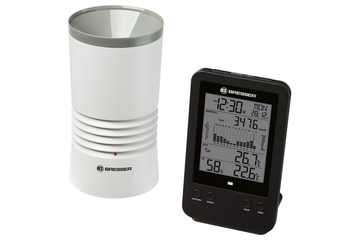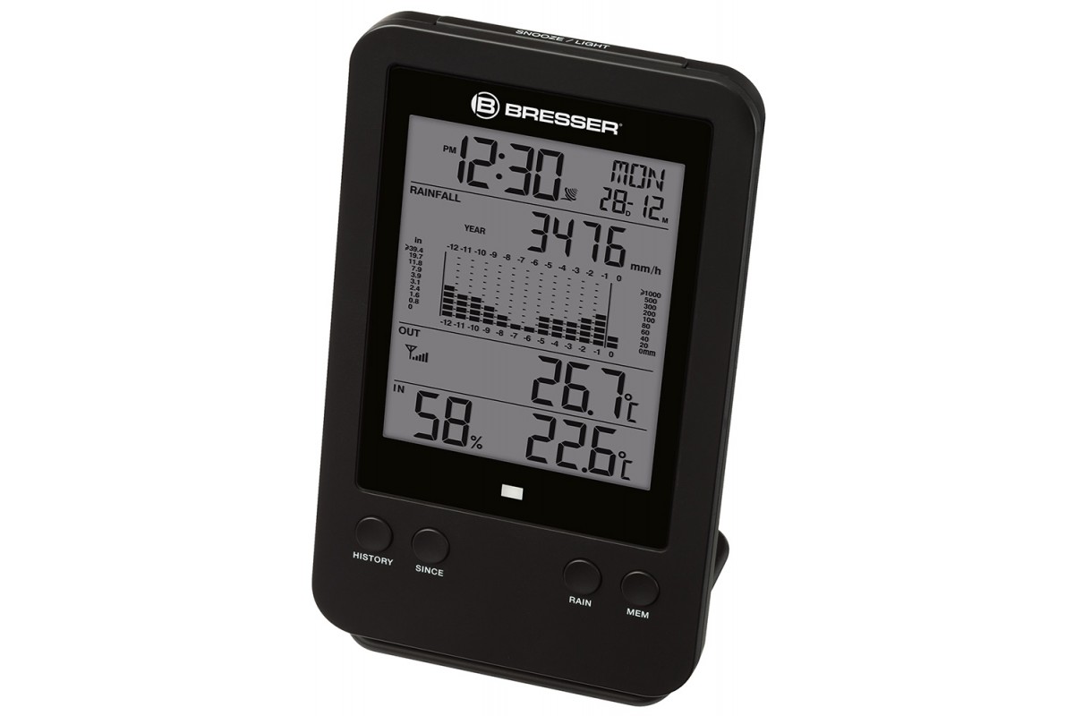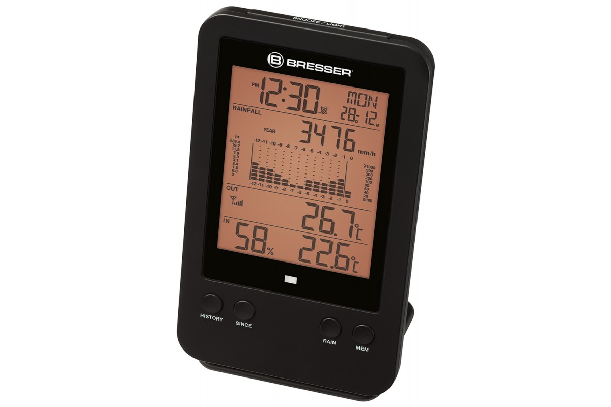Метеостанция Bresser с профессиональным дождемером – это возможность следить за погодой за окном и, в частности, за уровнем осадков. Внешний датчик не только определяет количество выпавших осадков, но и сохраняет его в памяти. На экран метеостанции выводится гистограмма за час, день, неделю, месяц или год. Кроме того, метеостанция измеряет влажность воздуха, температуру внутри и снаружи помещения, а также показывает время, дату и день недели. Есть встроенная функция будильника.