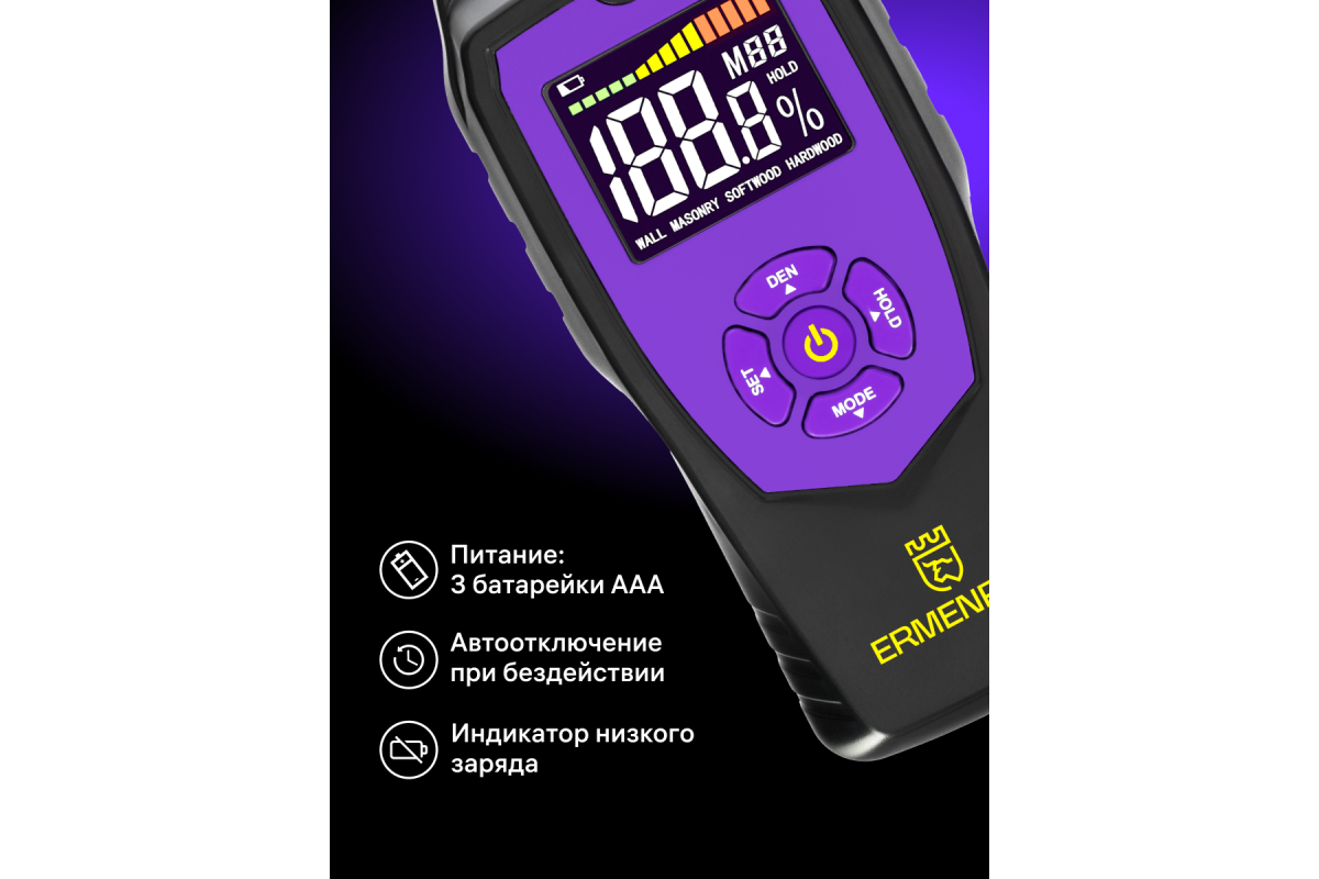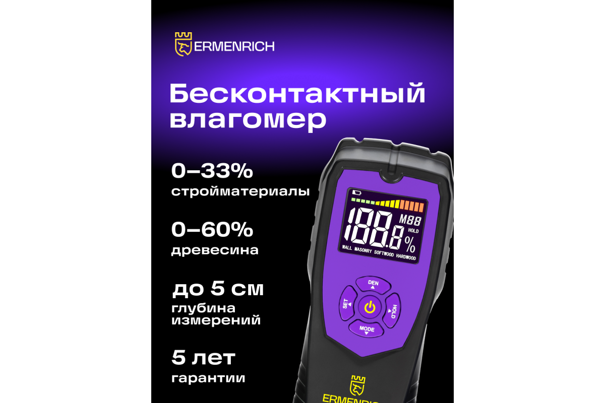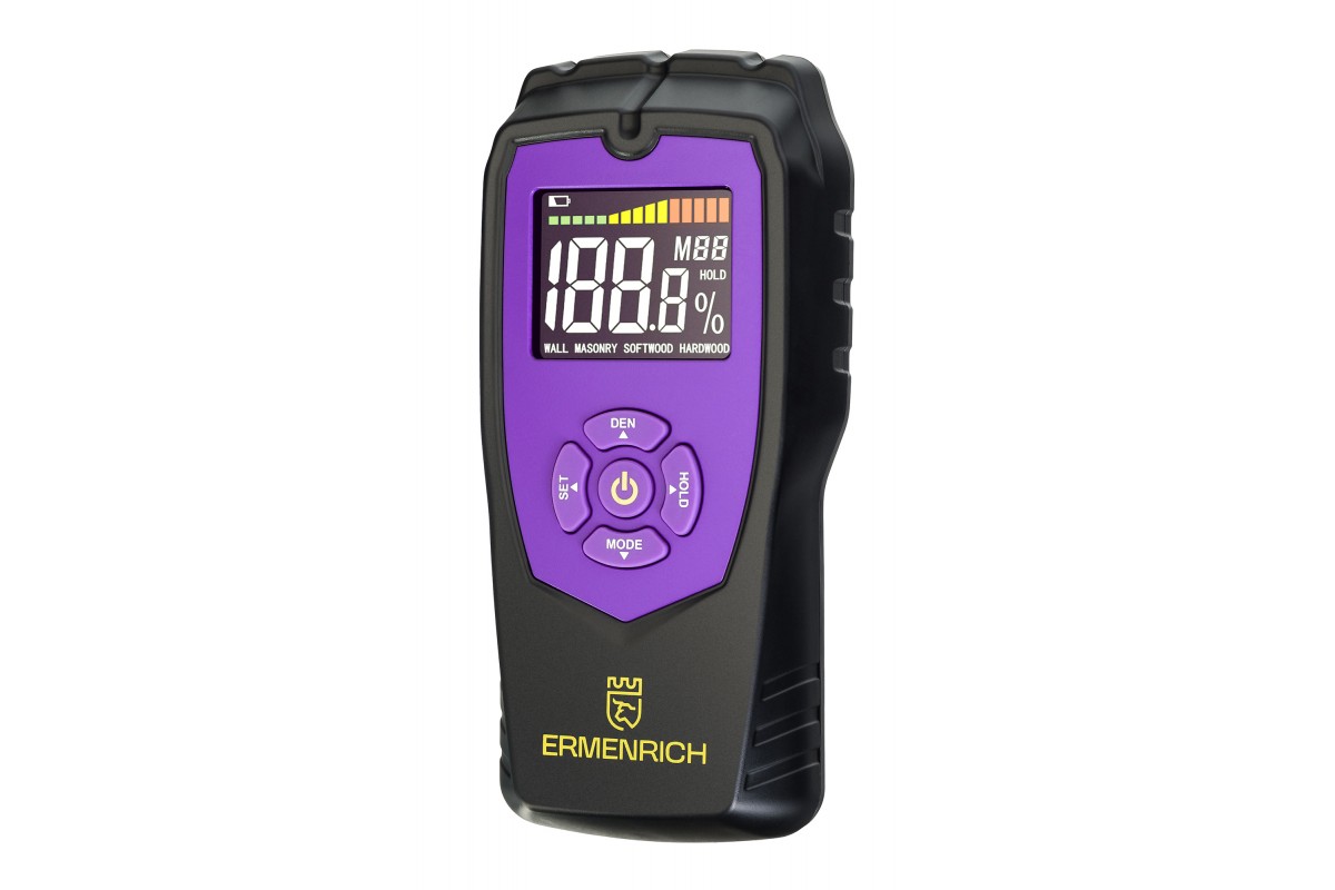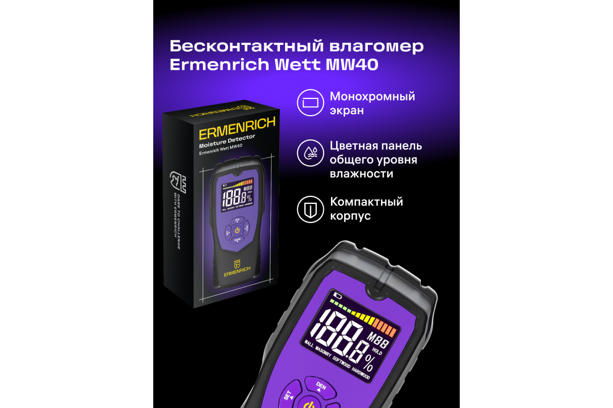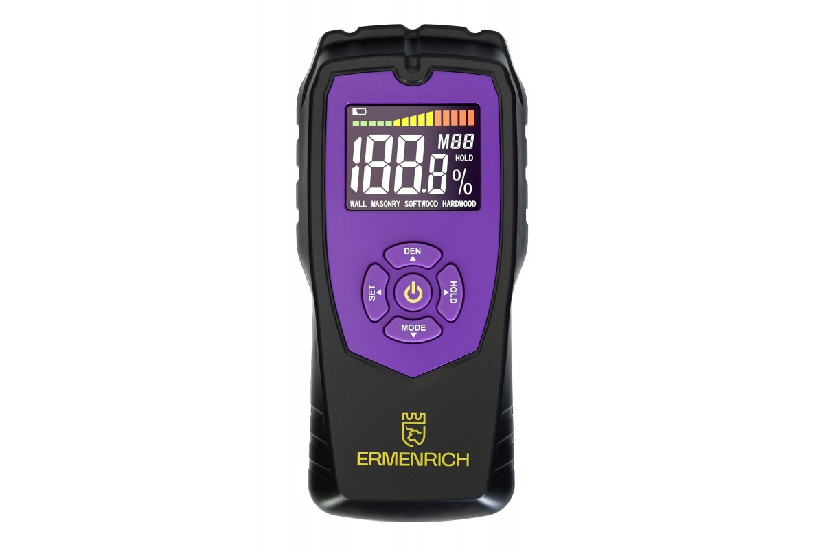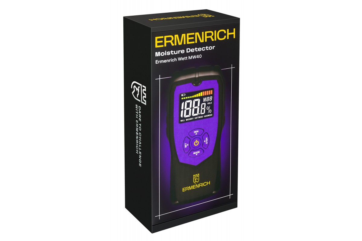 Датчик влажности Ermenrich Wett MW40 – это переносной влагомер, который найдет свое применение на деревообрабатывающем производстве, в столярной мастерской, на строительной площадке и даже дома: он поможет закупить качественные материалы и выполнить ремонт. Этот влагомер поможет определить уровень влажности самых разных материалов: древесины, бетона, картона, гипсокартона и проч.