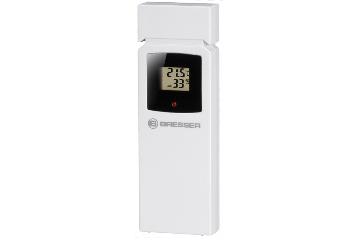 Этот трехканальный датчик работает на частоте 433 МГц и может использоваться как дополнительный внешний датчик для некоторых метеостанций Bresser. Он измеряет температуру и влажность воздуха в месте, где расположен, и передает измерения по радиоканалу на расстояние до 30 метров. У датчика есть встроенный монохромный экран, возможно настольное или настенное размещение.