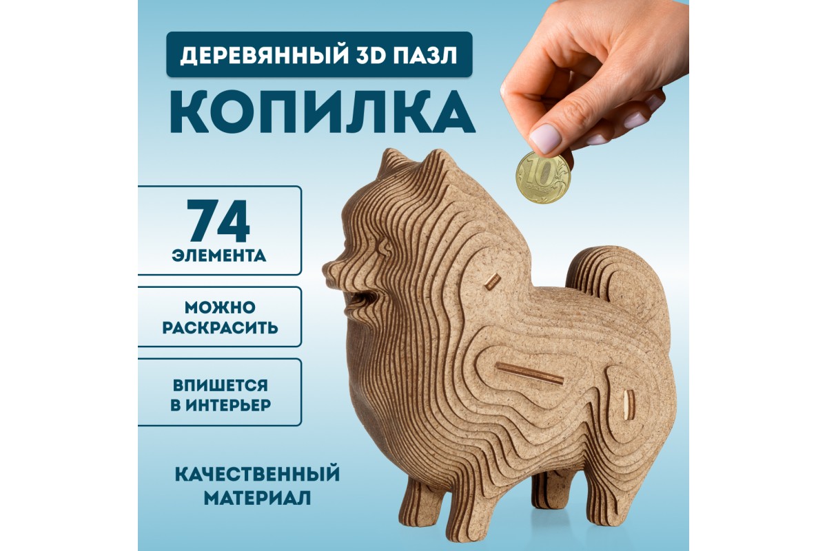 Деревянный 3D пазл копилка EWA Собачка — это интерьерный 3D конструктор, изготовленный из экологичной древесины (хдф - ДВП высокой плотности). Это прекрасный подарок для любителей 3D конструкторов и моделирования, позволяет развить мелкую моторику рук, усидчивость и концентрацию внимания. 3d пазл из дерева понравится каждому, подойдет и для детей, и для взрослых.