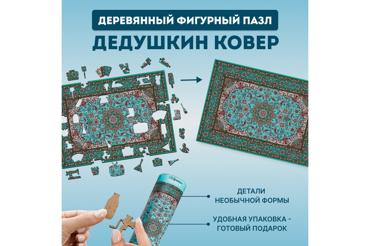 Деревянный фигурный пазл EWA Дедушкин ковер 39x28 см -отличный подарок и ребенку нового времени и человеку советского воспитания. Пока вы предадитесь ностальгии, ваши дети с любопытством будут рассматривать фигурные детали ввиде телефонного аппарата, банки или другой бытовой утвари СССР.