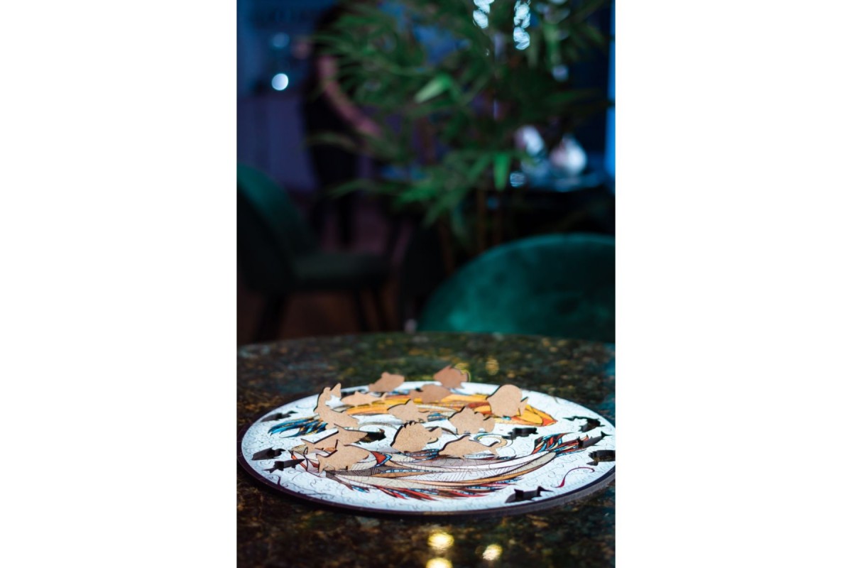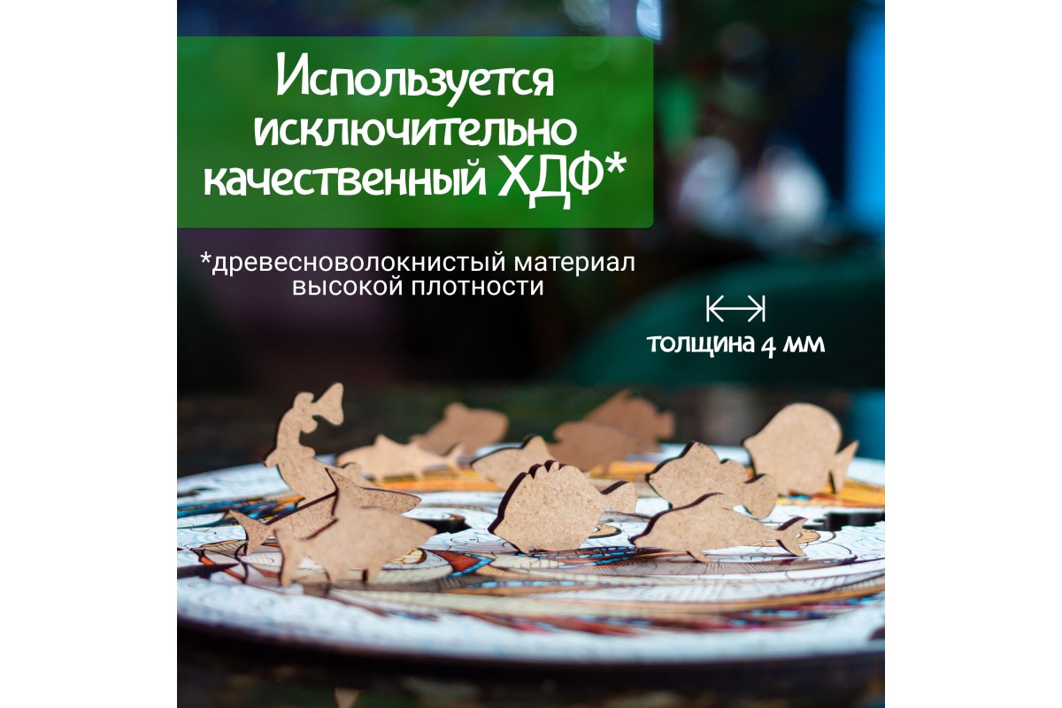 Сам пазл выполнен из экологичного МДФ, с применением высокоточного лазера. Благодаря этому все детали идеально подходят друг к другу. Каждый кусочек приятно держать в руках и ощущать слегка уловимый аромат дерева.