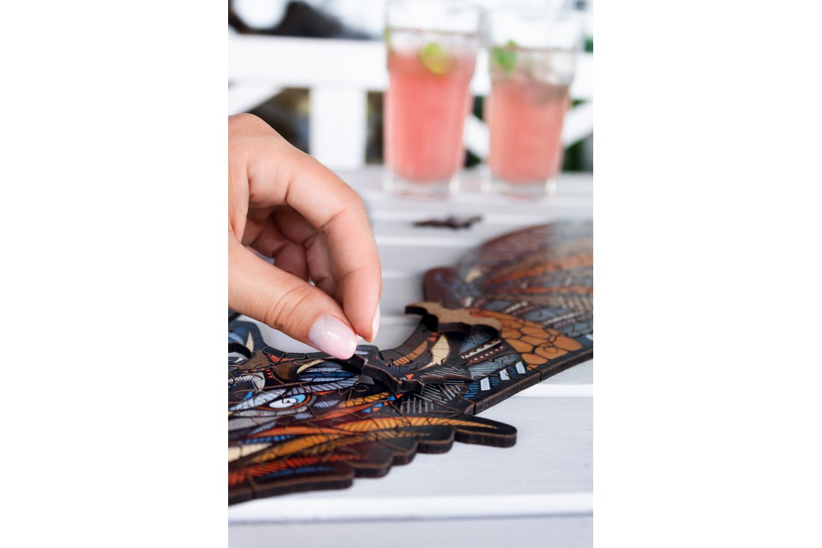 Сам пазл выполнен из экологичного МДФ, с применением высокоточного лазера. Благодаря этому все детали идеально подходят друг к другу. Каждый кусочек приятно держать в руках и ощущать слегка уловимый аромат дерева.
