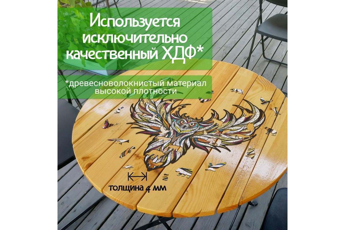 Сам пазл выполнен из экологичного МДФ, с применением высокоточного лазера. Благодаря этому все детали идеально подходят друг к другу. Каждый кусочек приятно держать в руках и ощущать слегка уловимый аромат дерева.