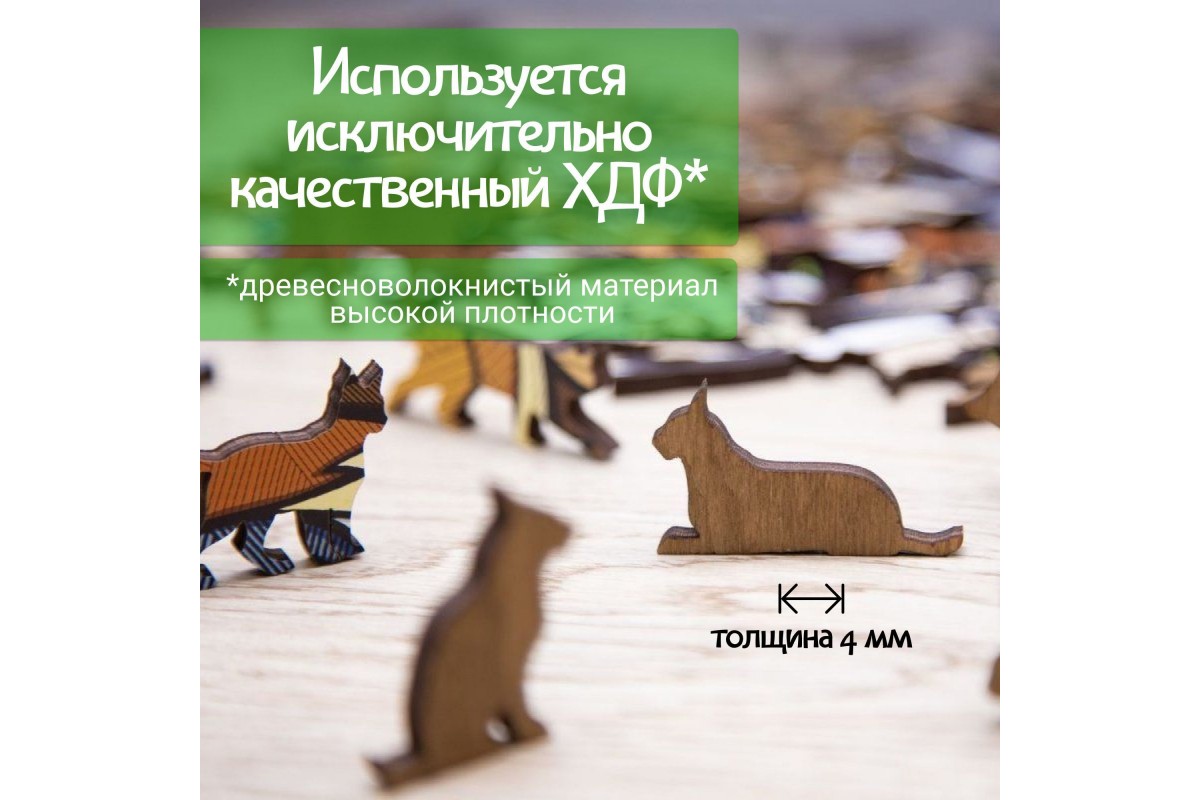 Сам пазл выполнен из экологичного МДФ, с применением высокоточного лазера. Благодаря этому все детали идеально подходят друг к другу. Каждый кусочек приятно держать в руках и ощущать слегка уловимый аромат дерева.