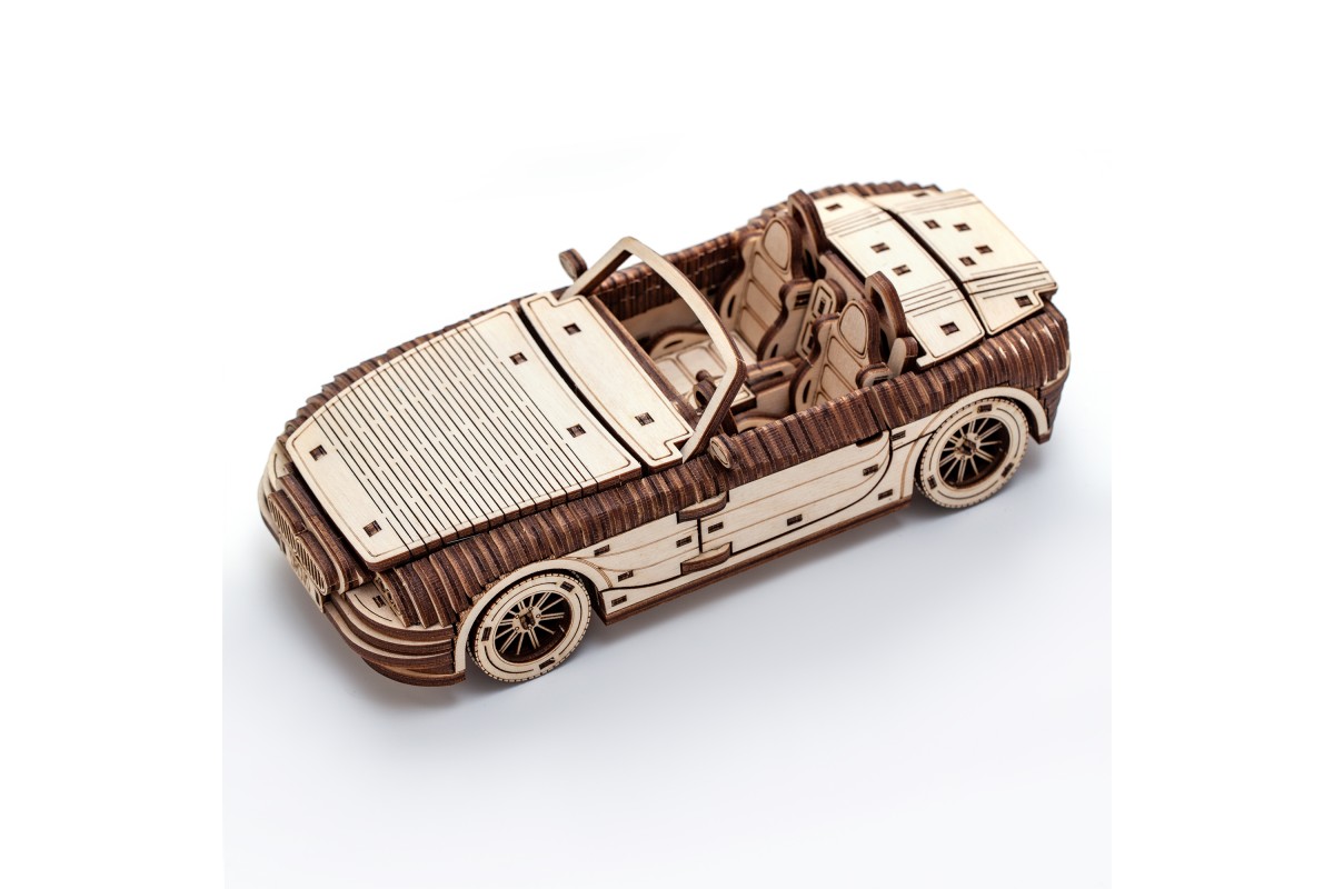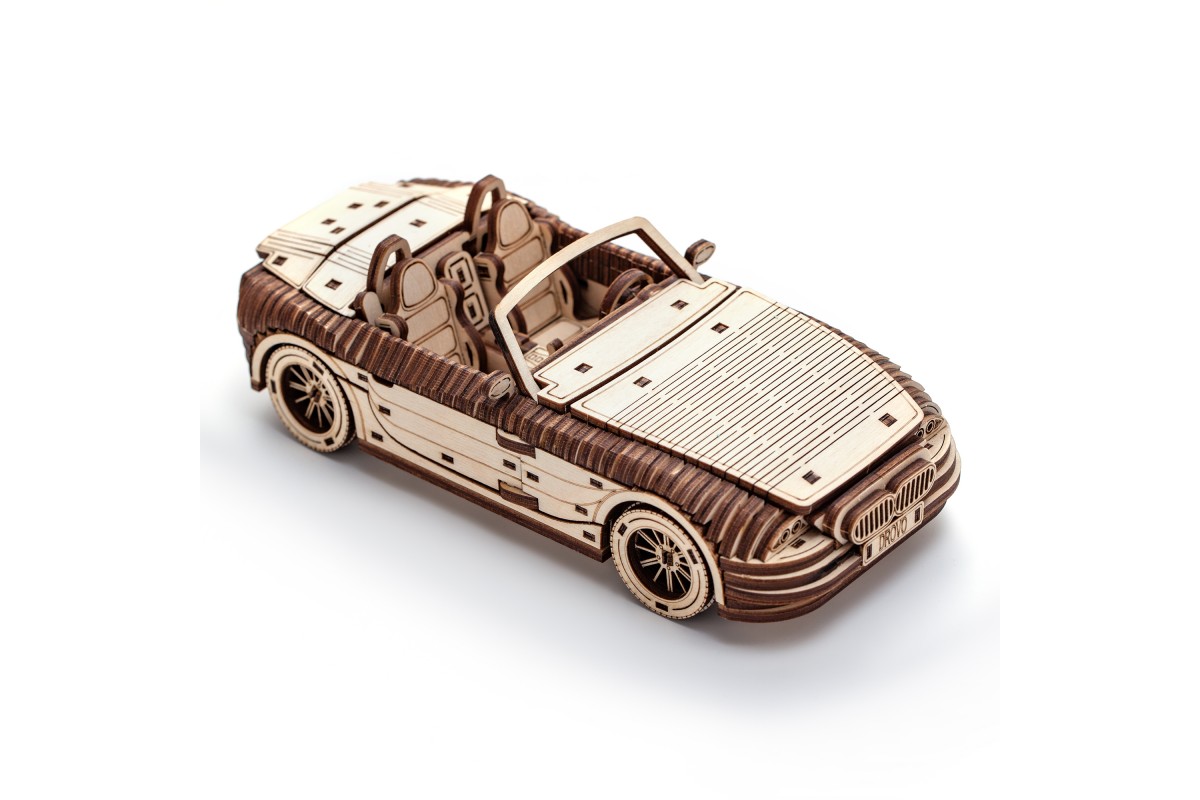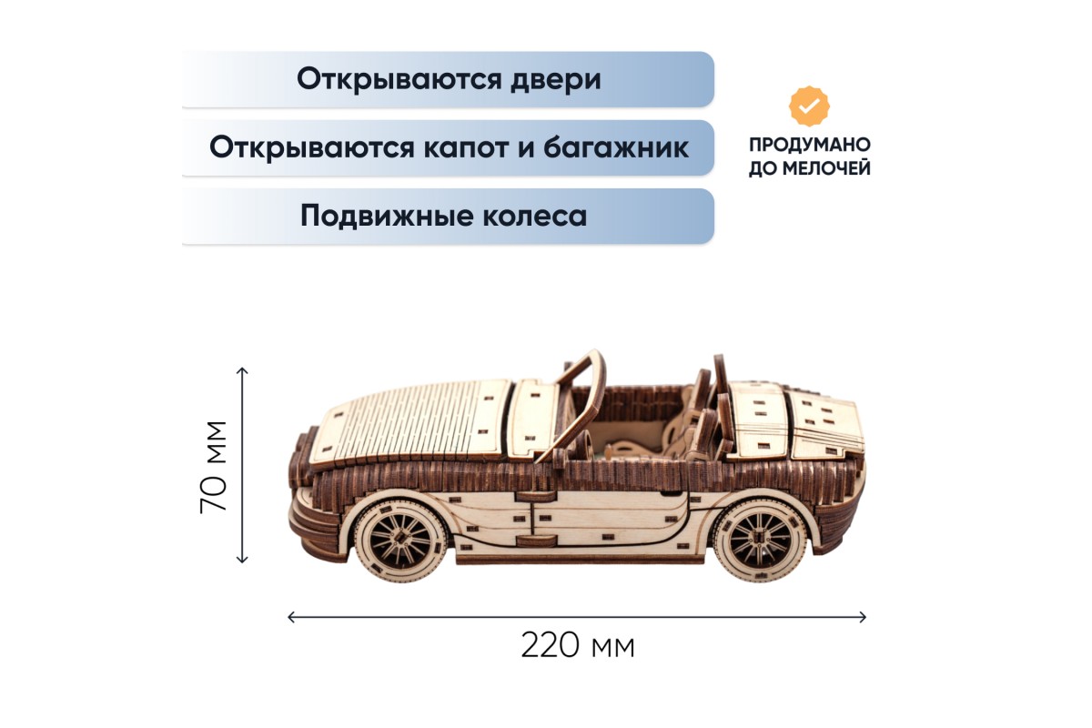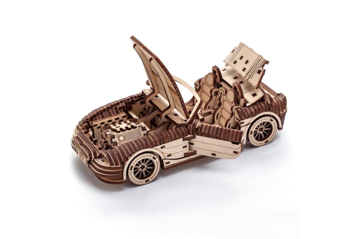 Сборная модель из дерева представляет собой кабриолет с большой детализацией, у которого открываются двери, капот и багажник, а так же крутятся колеса. А, чтобы играть с детьми было еще веселее вы можете раскрасить модель в любимые цвета.