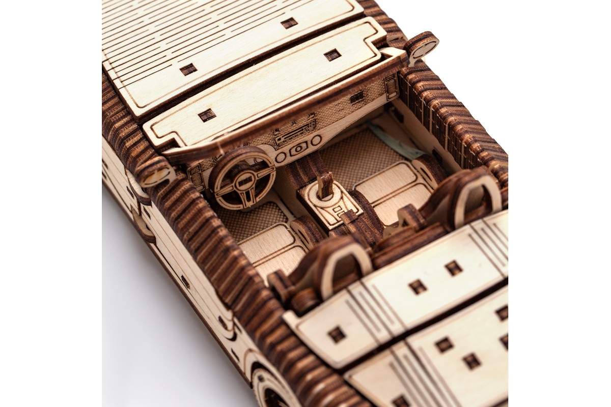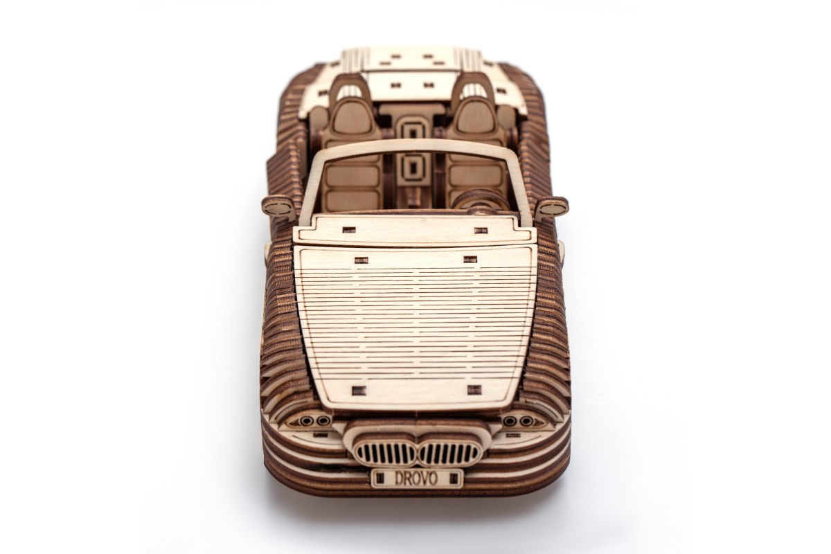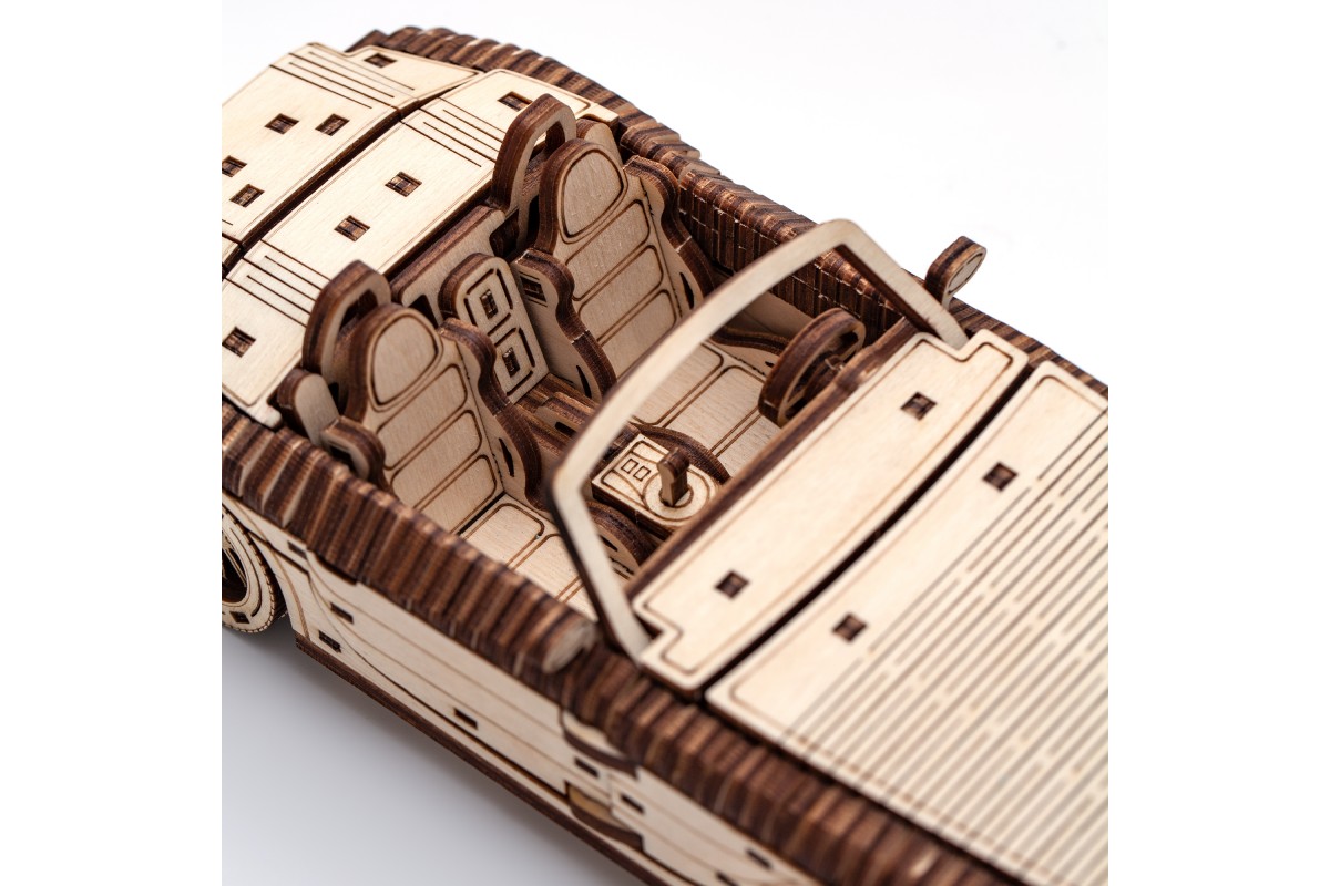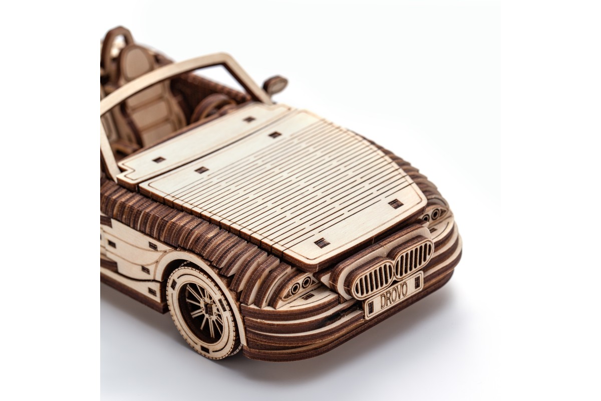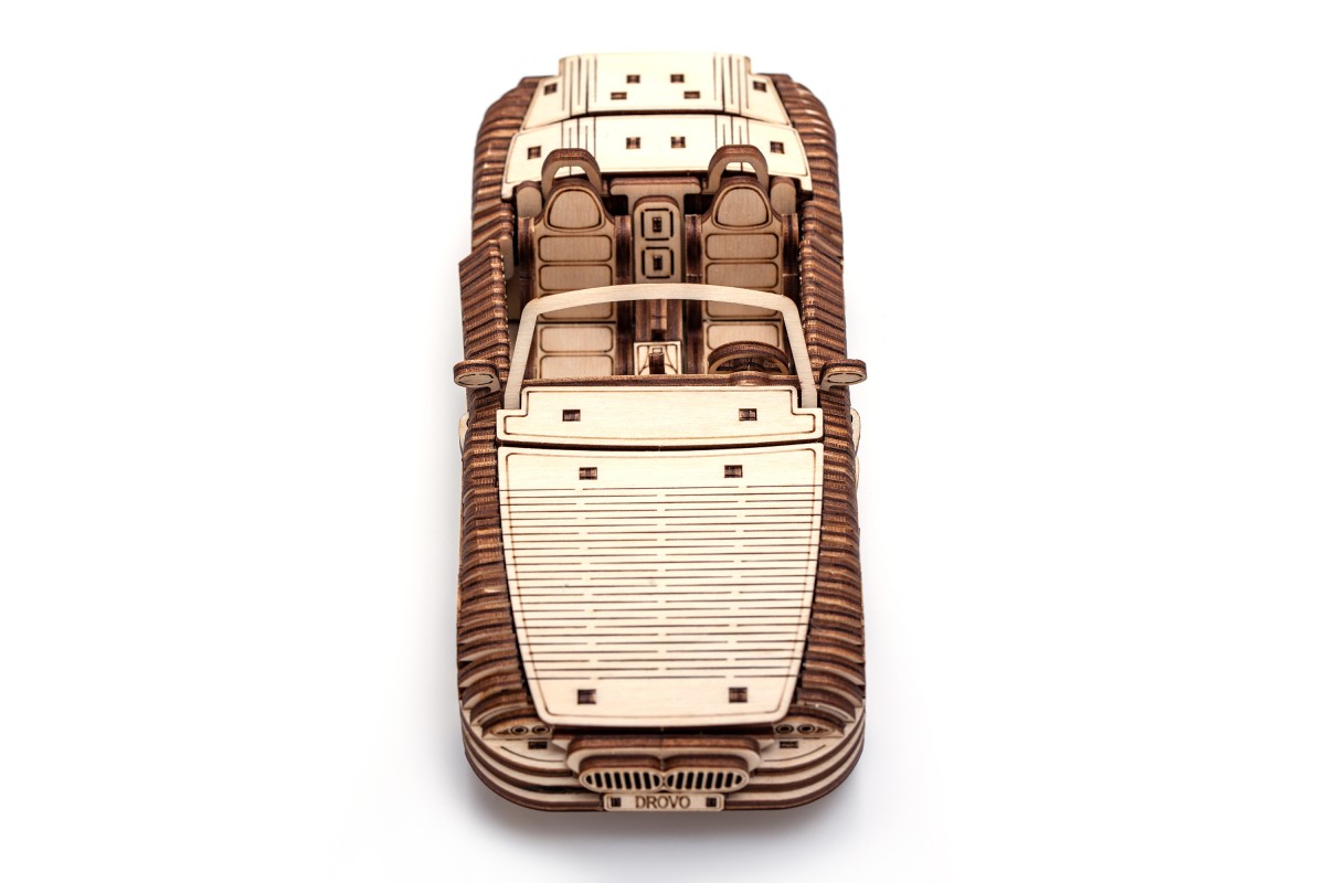 Сборная модель из дерева представляет собой кабриолет с большой детализацией, у которого открываются двери, капот и багажник, а так же крутятся колеса. А, чтобы играть с детьми было еще веселее вы можете раскрасить модель в любимые цвета.