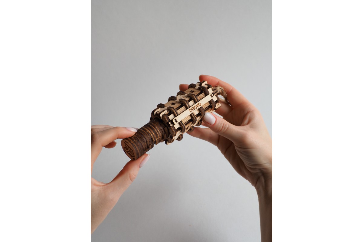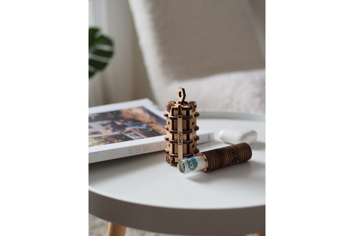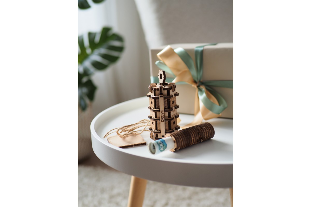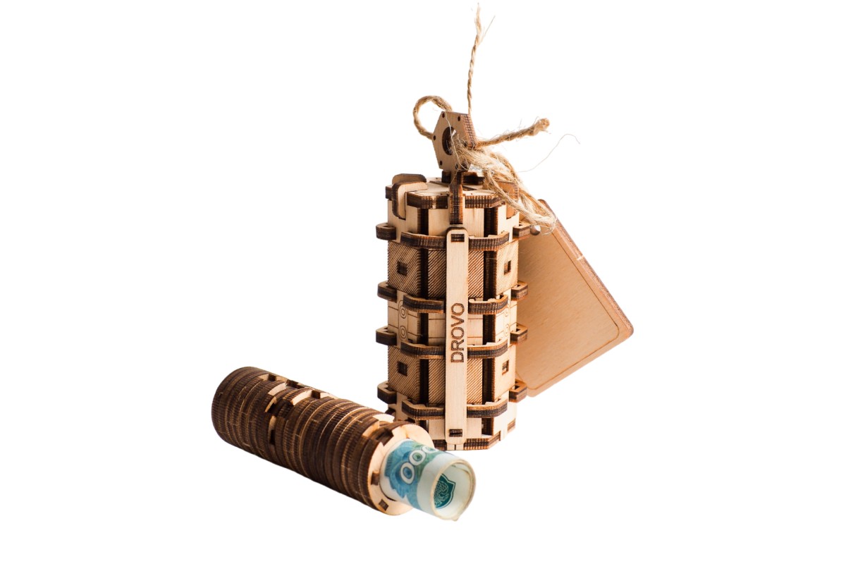 Сборная модель из дерева представляет собой колбу, куда можно положить свернутые купюры или секретное послание.Нужно догадаться как его открыть, вращая по лабиринту колбу, в которой лежат купюры. В комплекте есть ярлычок, на котором можно написать имя или пожелание, и нить, чтобы привязать бирку к изделию.