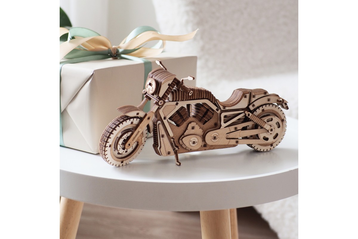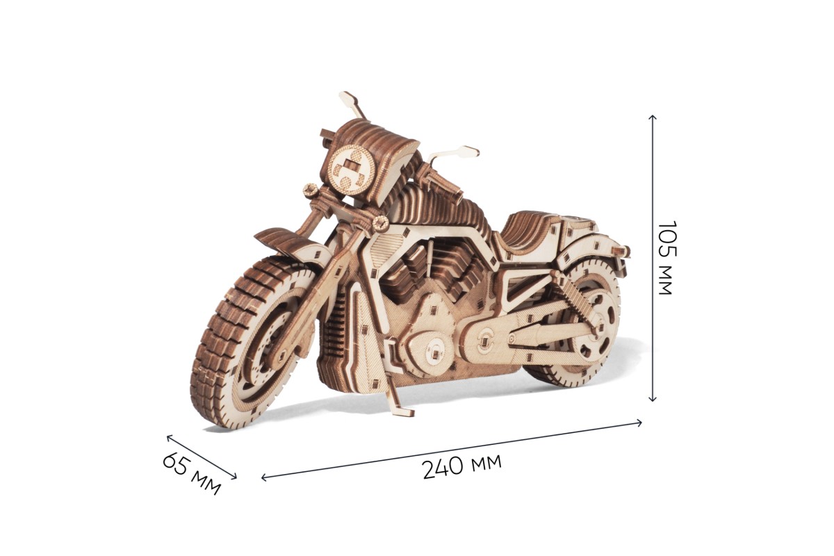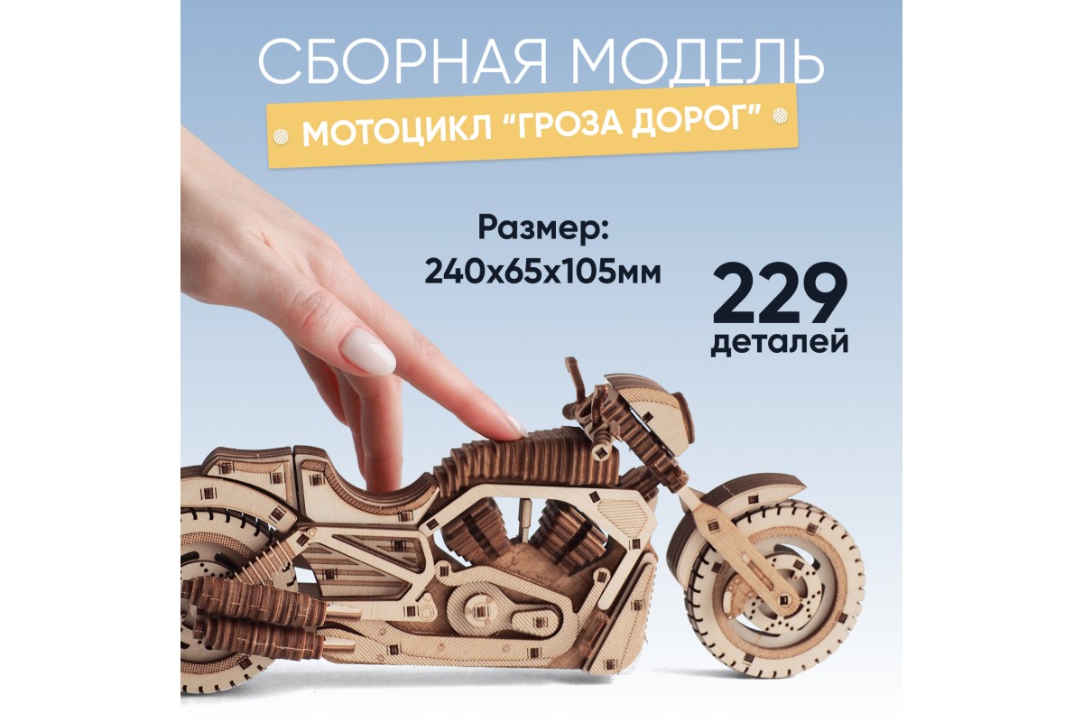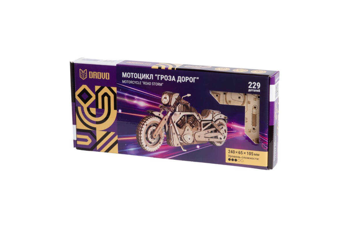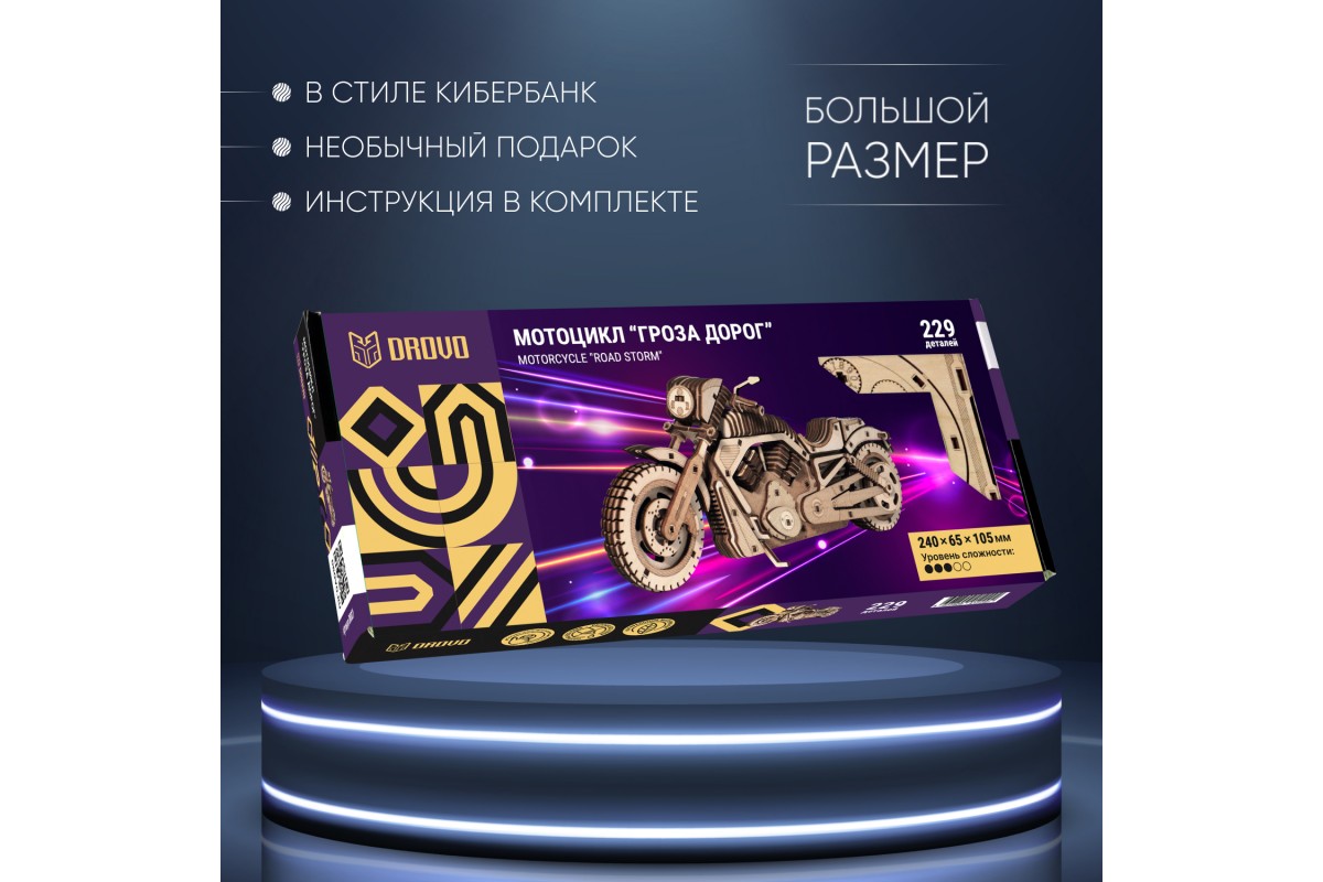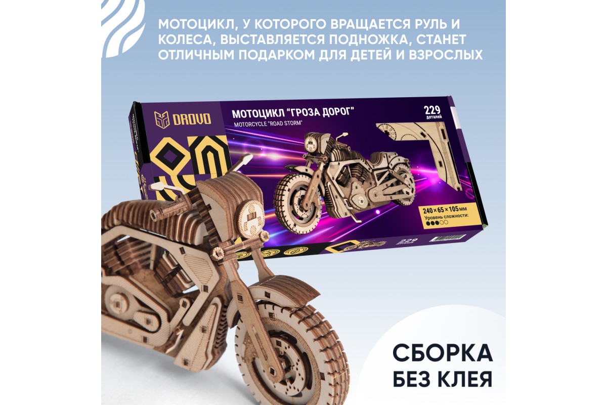 Деревянный конструктор DROVO Мотоцикл "Гроза дорог" - прекрасный подарок для ребенка и взрослого человека, который любит собирать автомобили и другую технику, на любой праздник.