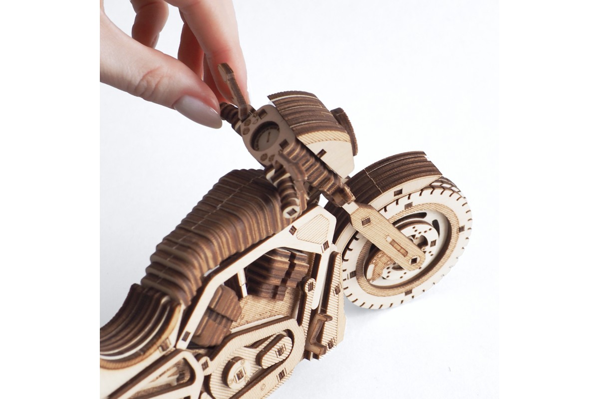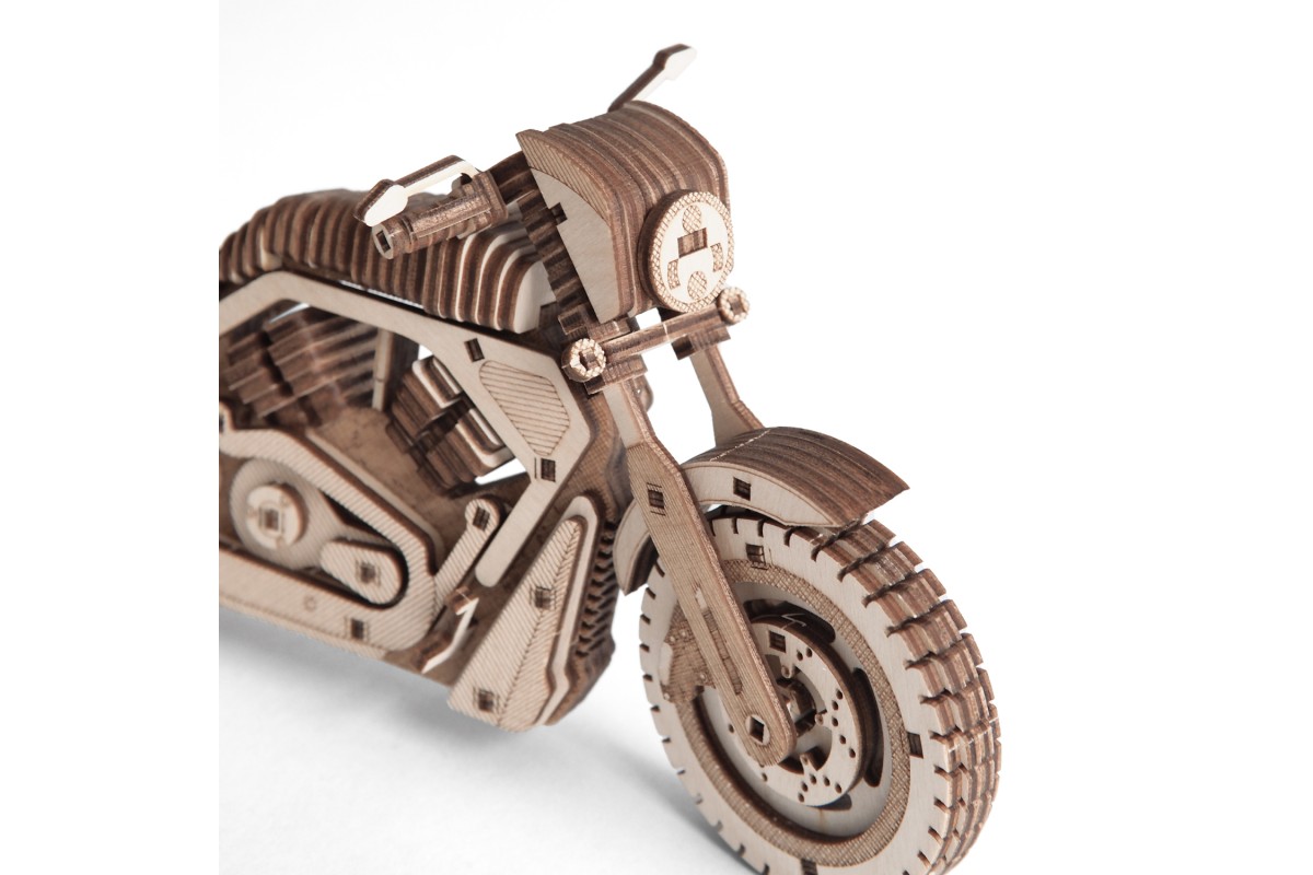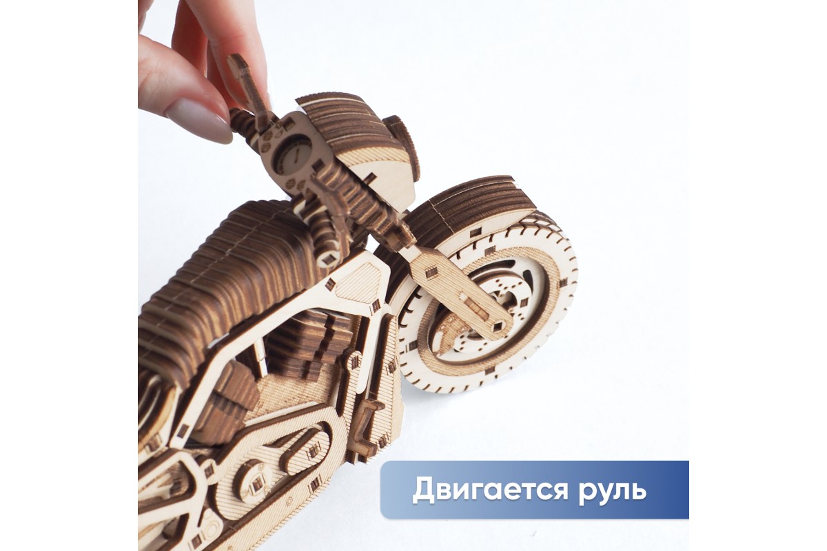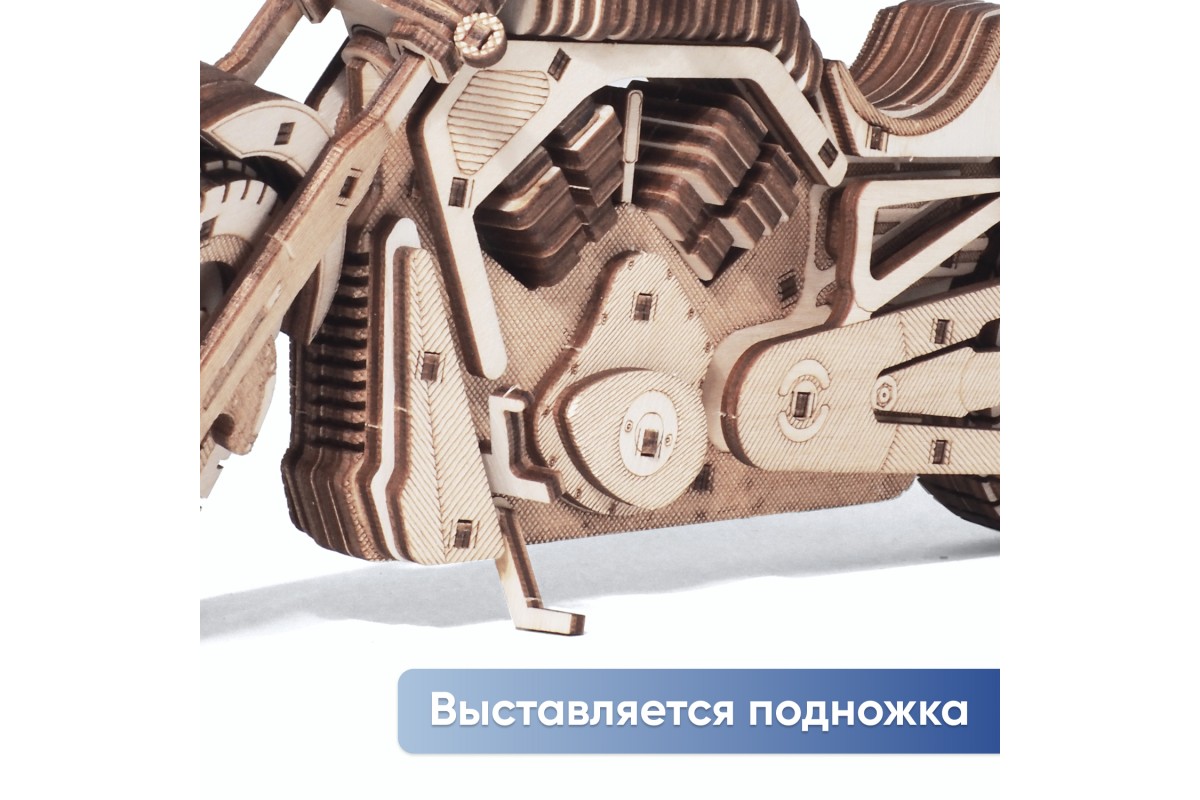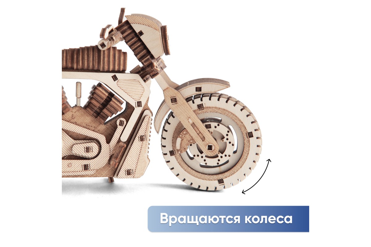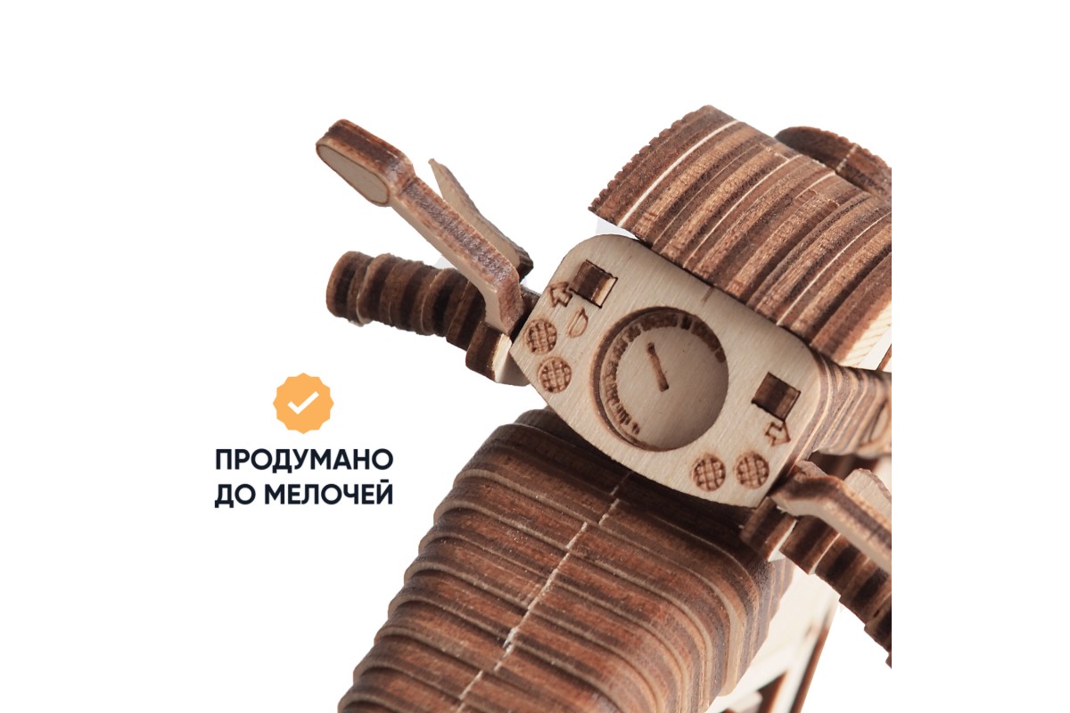 Сборная модель из дерева обладает высокой детализацией, тут и приборная панель, и зеркала, и номерной знак. У собранной модели мотоцикла вращается руль и колеса, выставляется подножка.