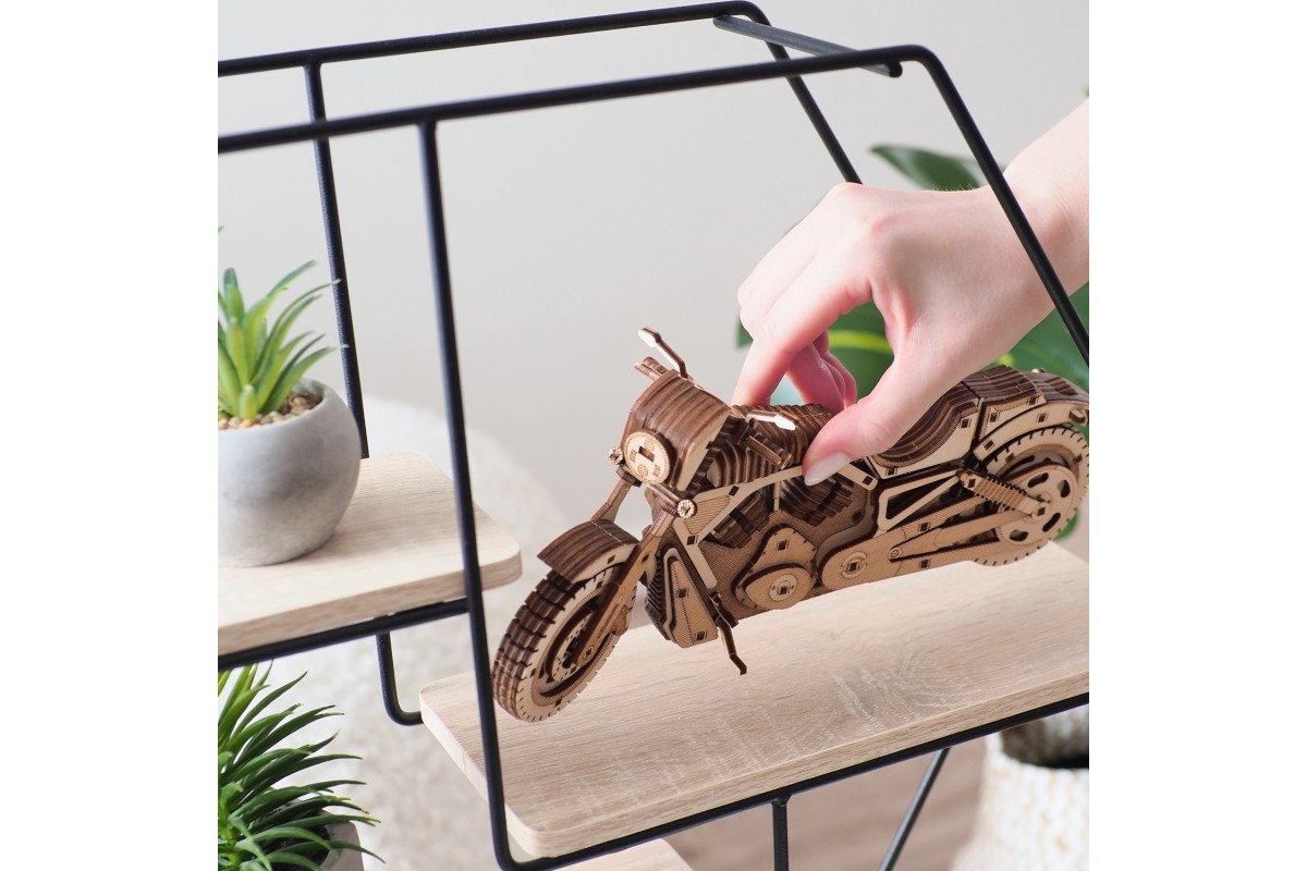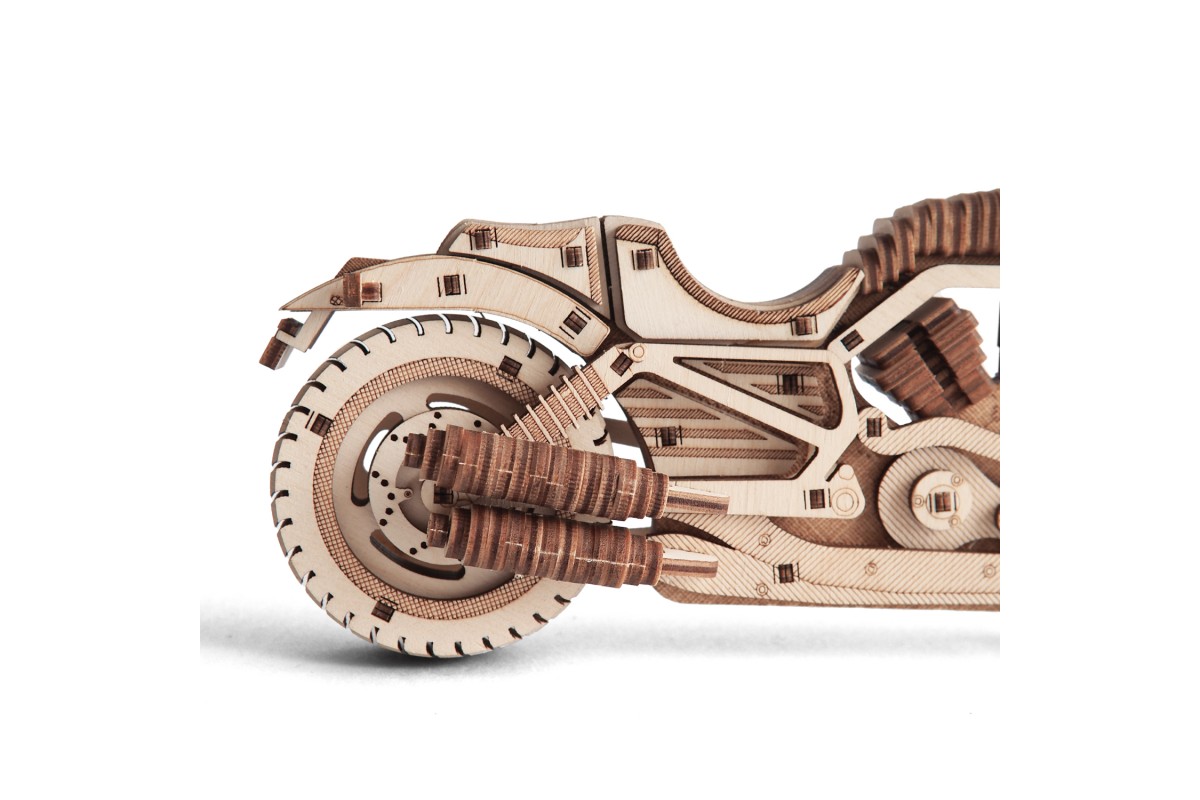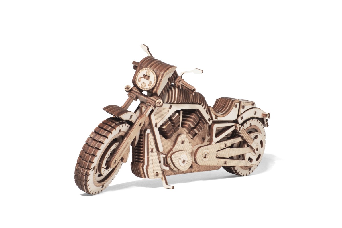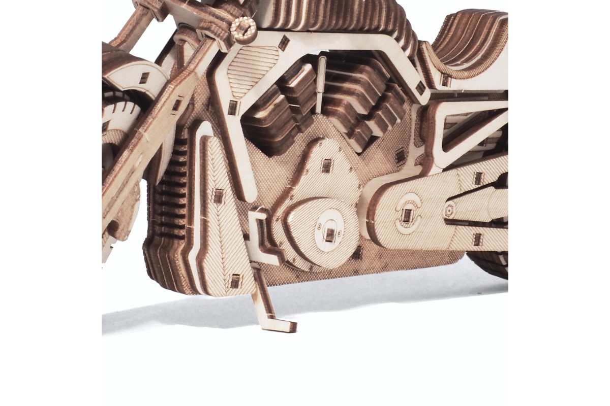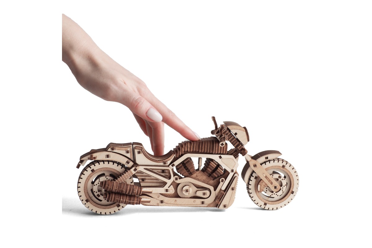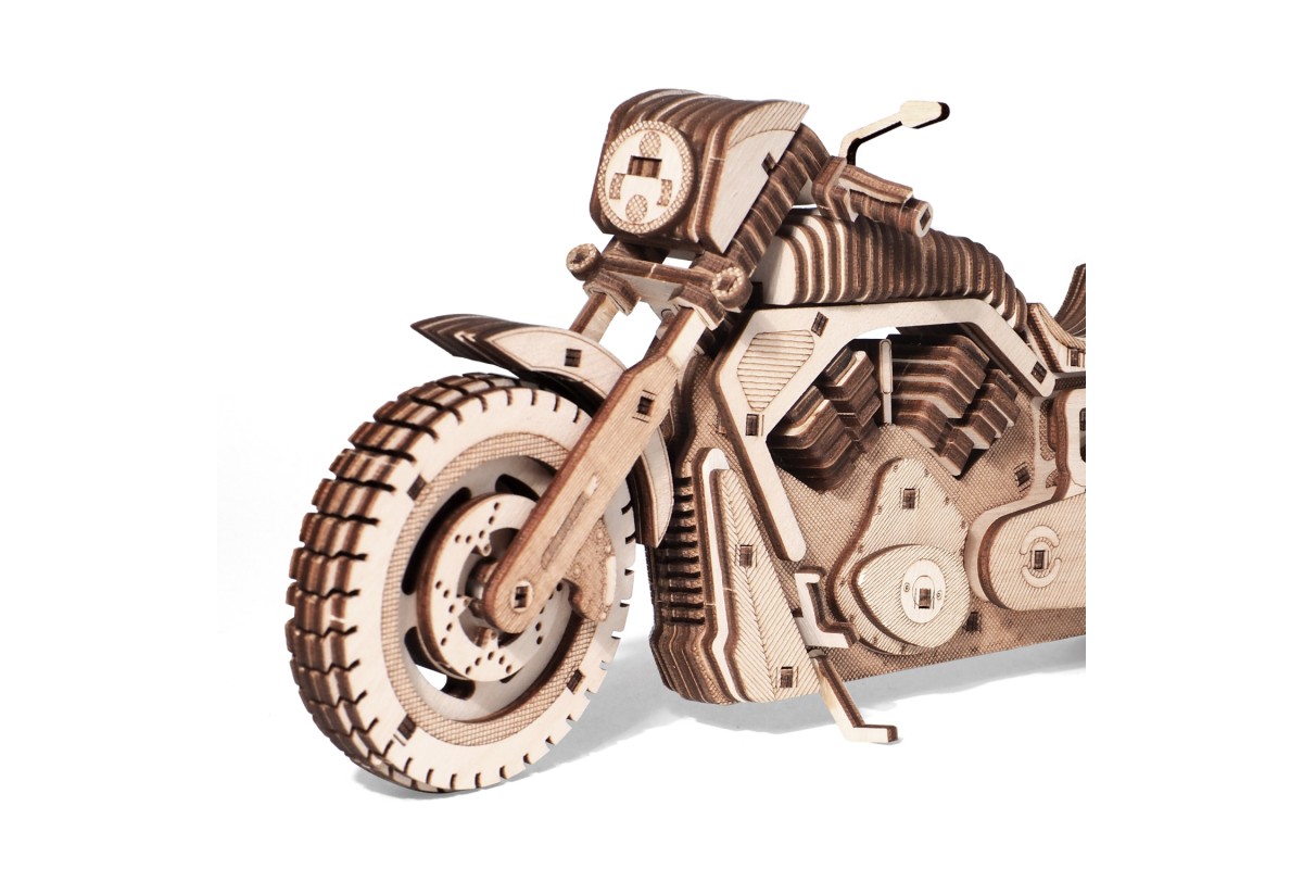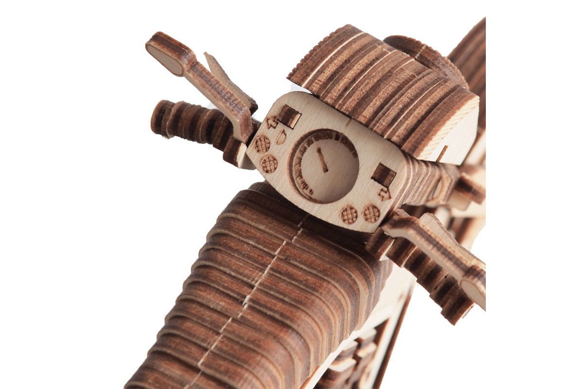 Сборная модель из дерева обладает высокой детализацией, тут и приборная панель, и зеркала, и номерной знак. У собранной модели мотоцикла вращается руль и колеса, выставляется подножка.
