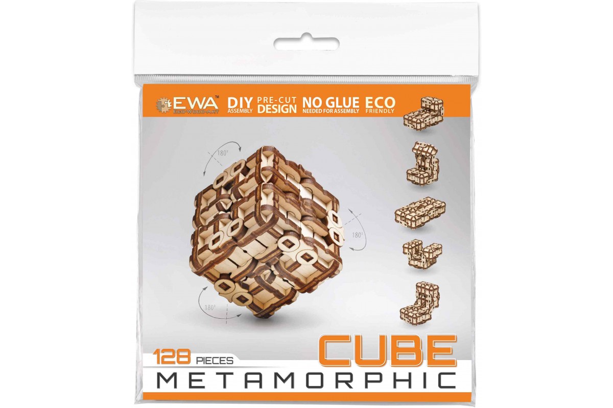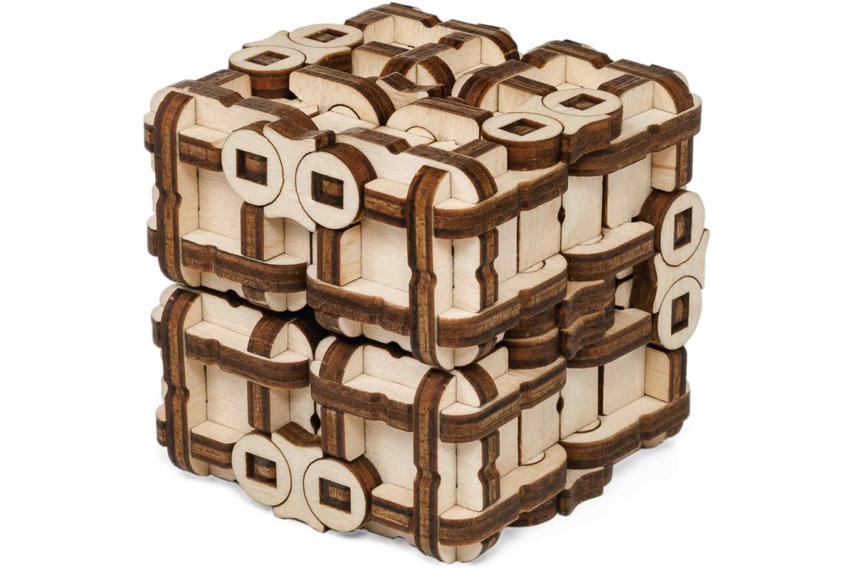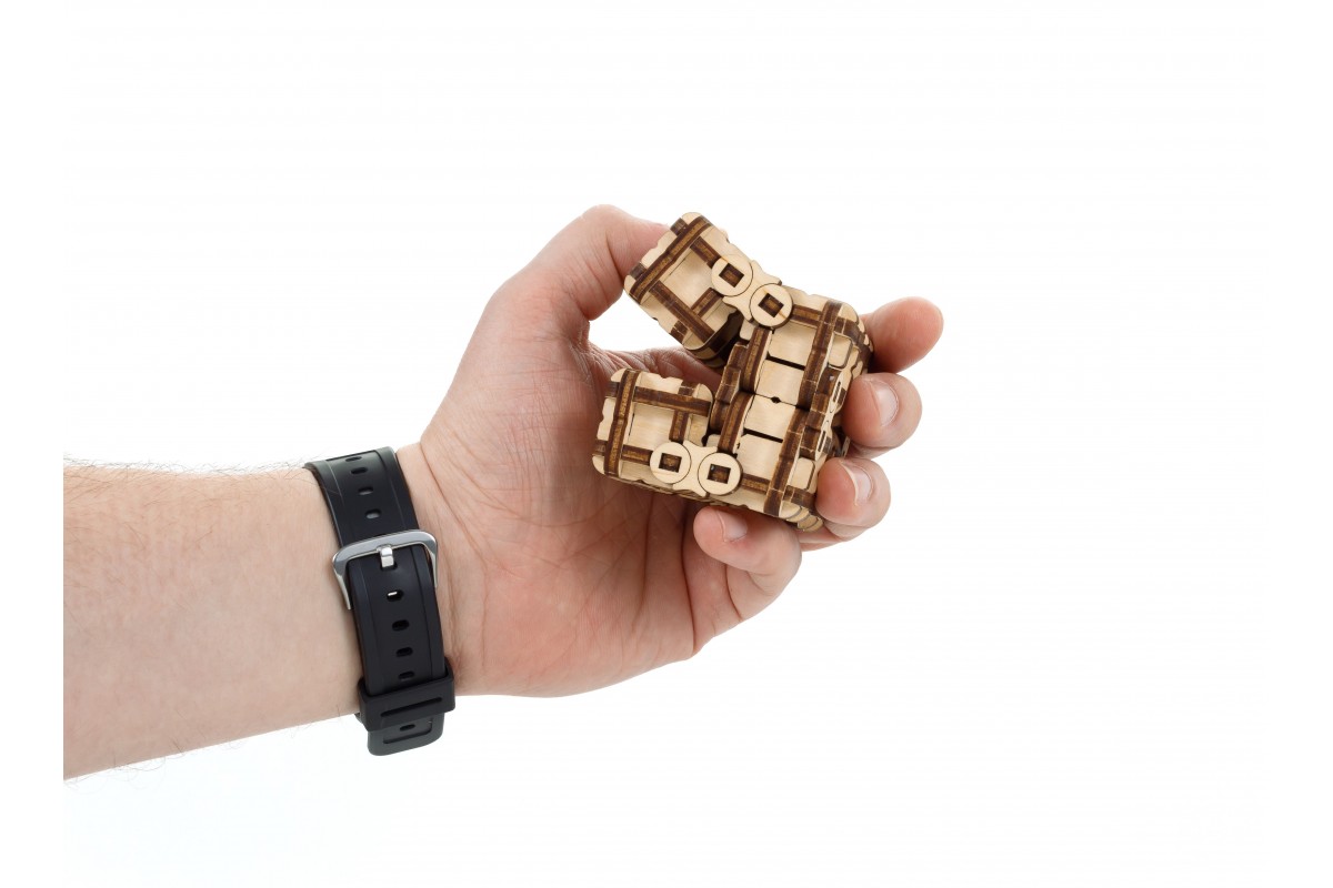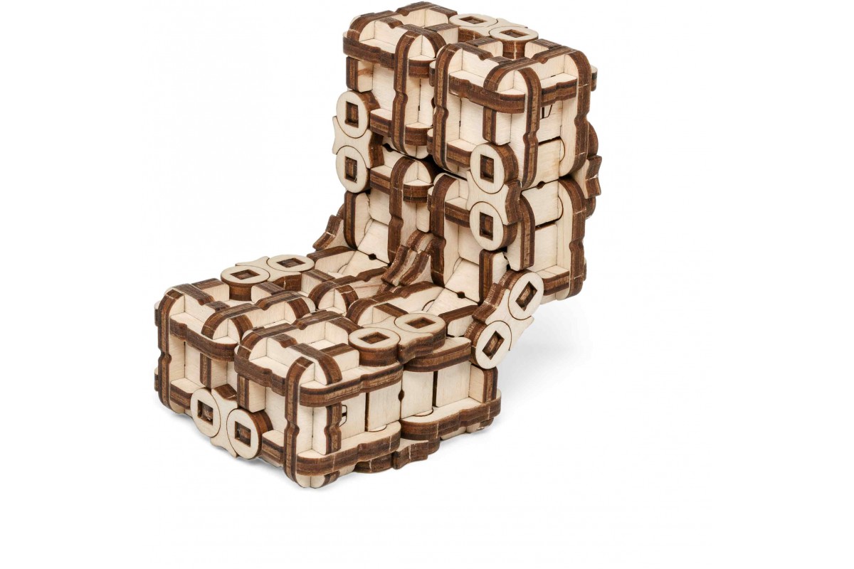 Деревянная головоломка Метаморфик куб — это игрушка из фанеры, которую можно собрать самому. Она состоит из 8 одинаковых деревянных кубиков. Блоки соединяются друг с другом с помощью креплений, которые расположены в углах каждого куба.