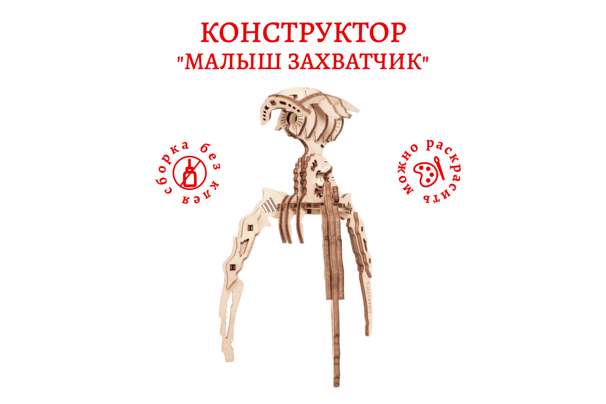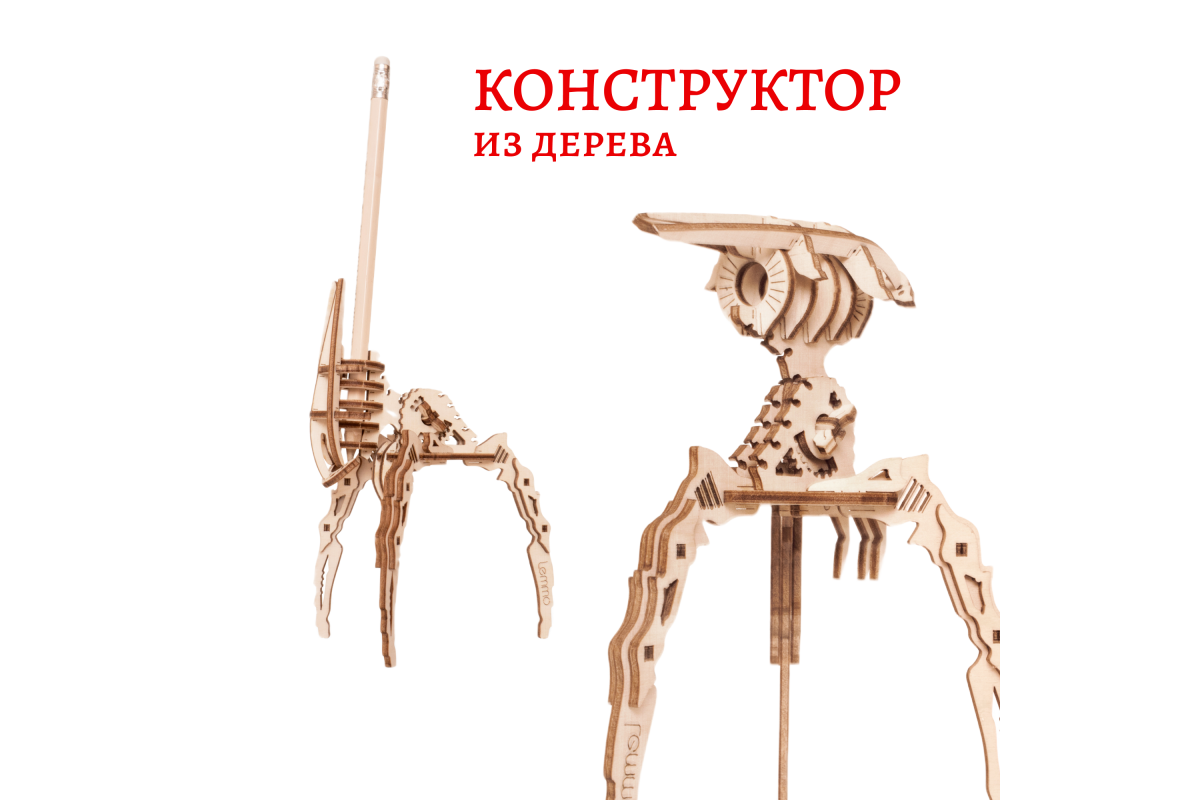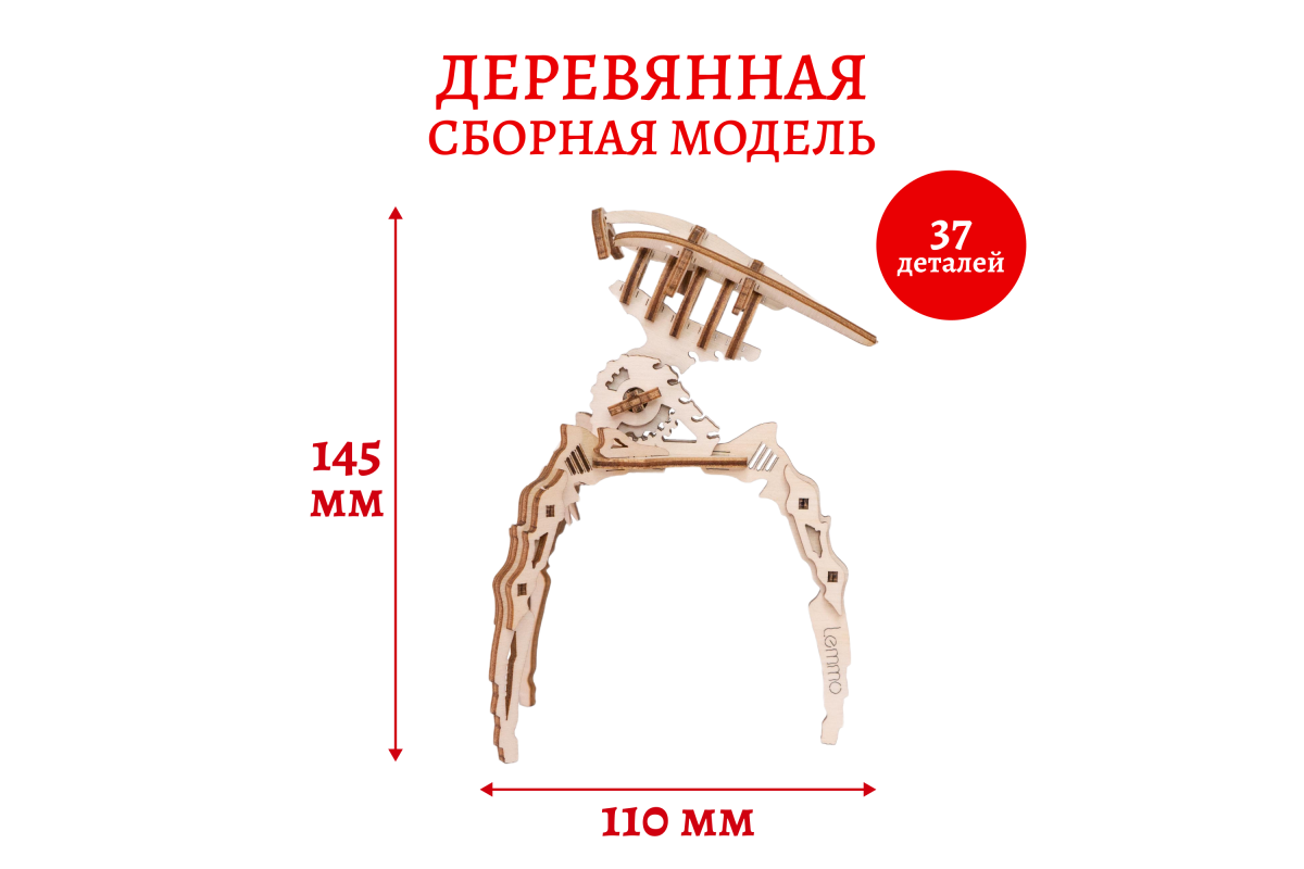 Деревянный конструктор Lemmo "Малыш Захватчик" - младший брат популярной сборной модели светильника "Захватчик Миров". Конструктор Робот - лучший подарок для мальчика, девочки и взрослых, любителей фильма "Война миров". Захватит в плен любую планету и ваши сердца! Деревянный конструктор выполнен в точности как в фильме, вы можете собирать его с детьми и пересматривать сюжет. У собранной модели двигается и фиксируется «голова». Деревянную модель можно использовать как подставку для пишущих предметов и, при желании, раскрасить акриловыми красками.