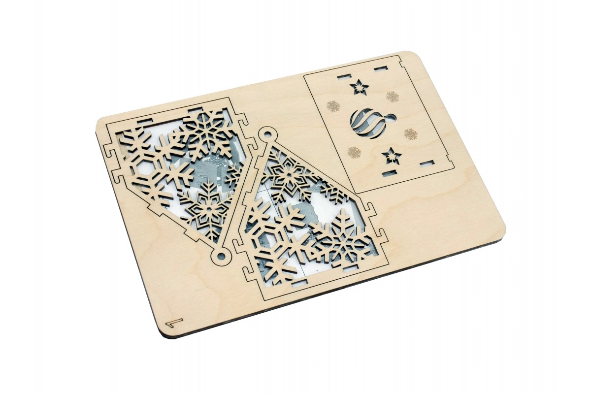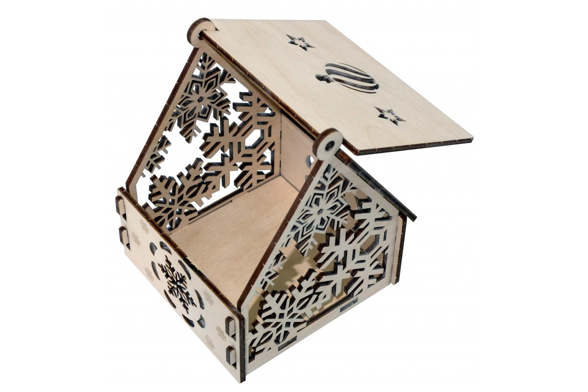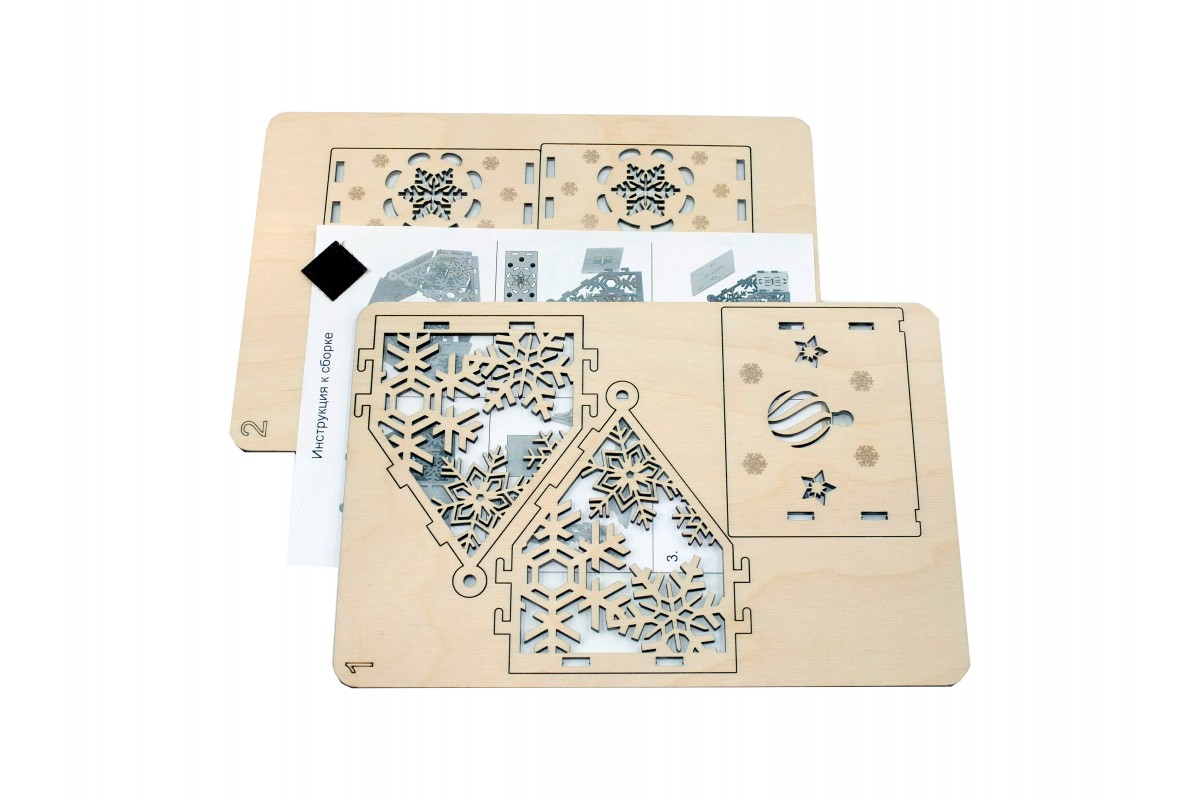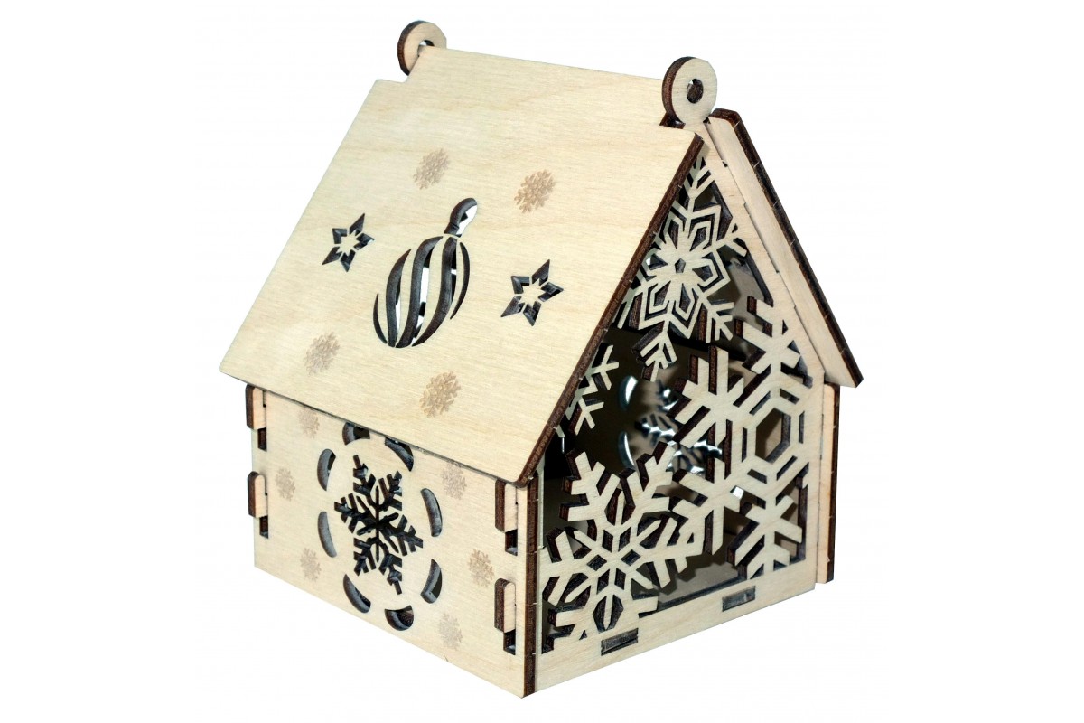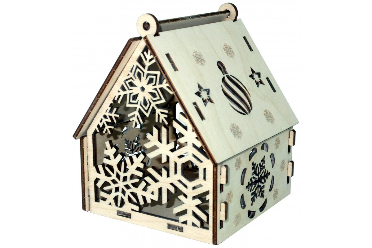 Конструктор "Домик Снежинка" изготовлен из березовой фанеры, старательно отшлифован и готов к сборке. Собирается без клея, но для надежности можно подклеить с помощью клея ПВА. В деталях используется новогодняя тематика. Снежинка по стенкам выглядят потрясающе. Раскрасьте домик и он станет классный елочной игрушкой.