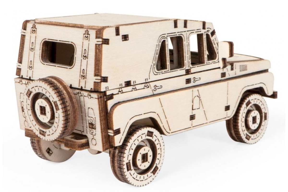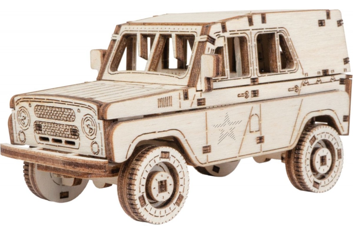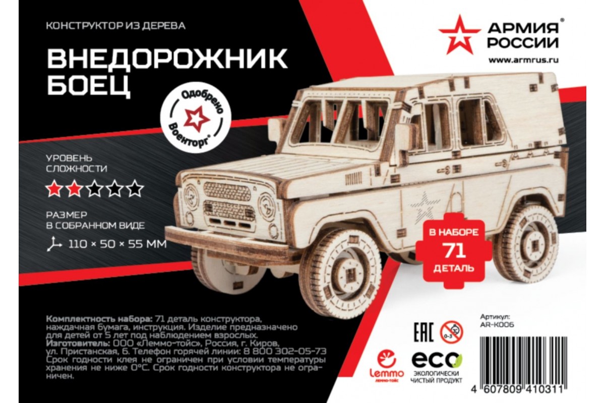 Деревянный конструктор и сборная модель из дерева Автомобиль Внедорожник "Боец" Армия России для детей и взрослых. Все детали выполнены из качественной древесины и имеют сильный насыщенный запах дерева. Готовы к сборке. Детали находятся на специальных плашках и необходимо только выдавить пальцем нужную деталь.