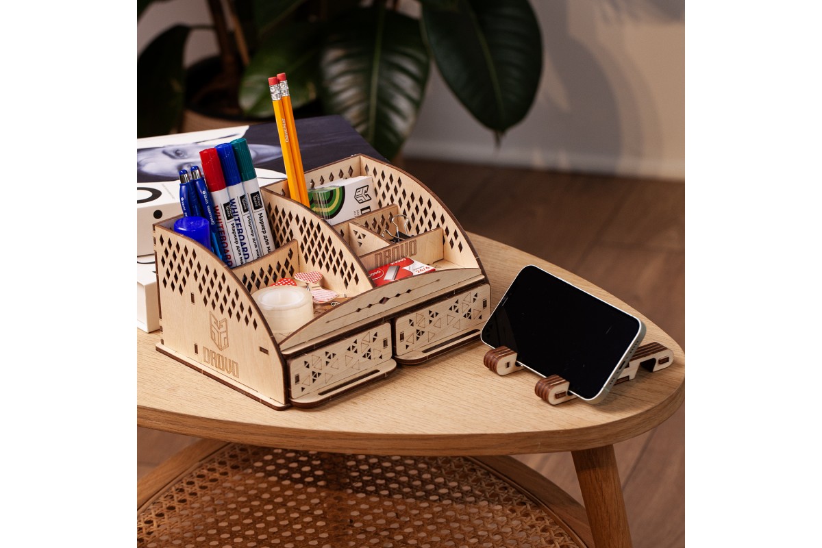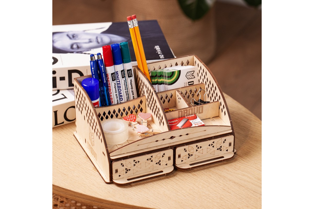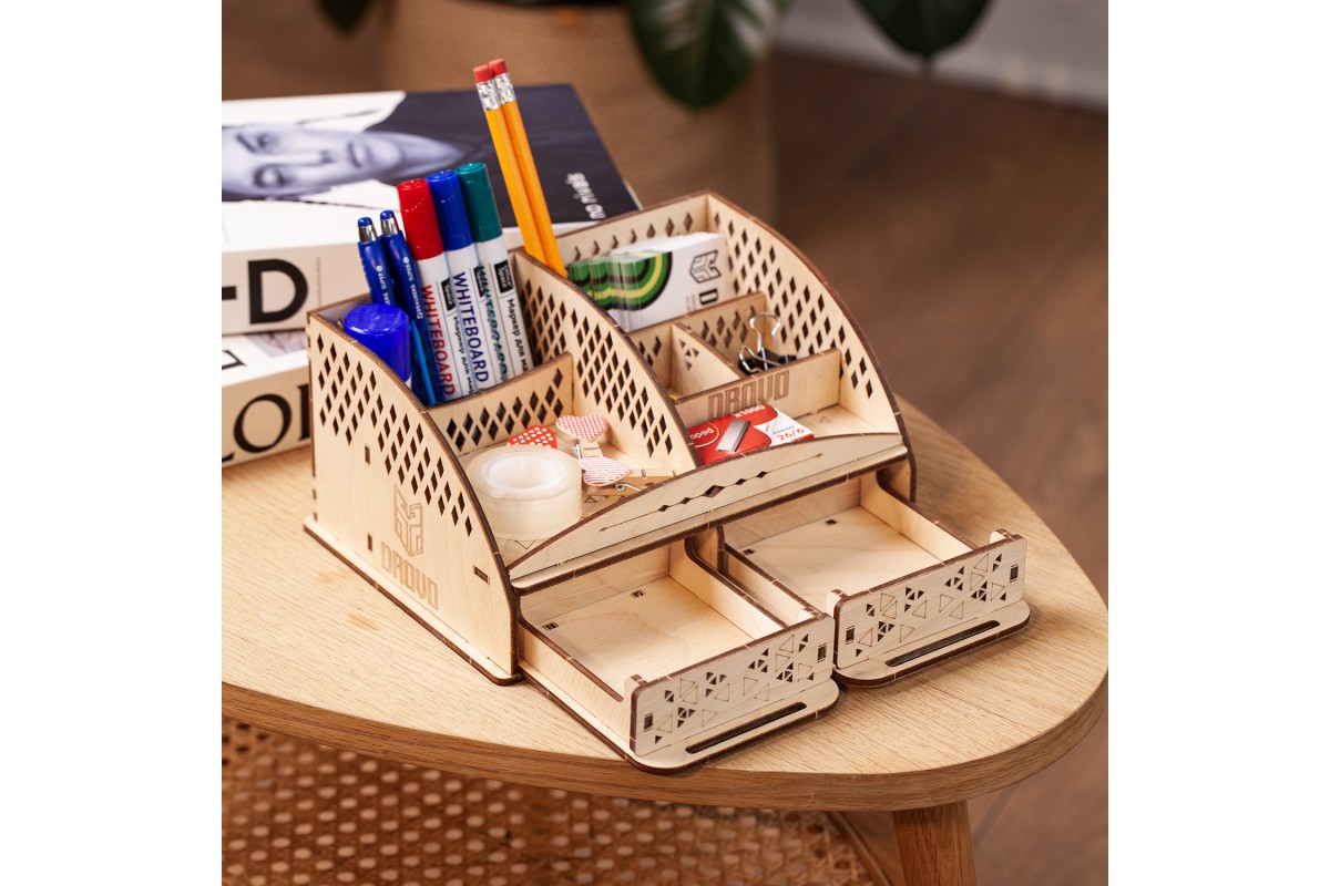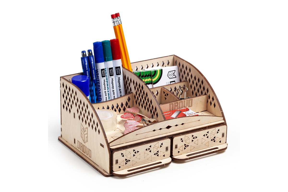 Сборная модель для хранения карандашей и другой канцелярии имеет множество удобных отделений, а так же два выдвижных ящика. Органайзер из фанеры будет хорошо смотреться в интерьере дома и офиса.