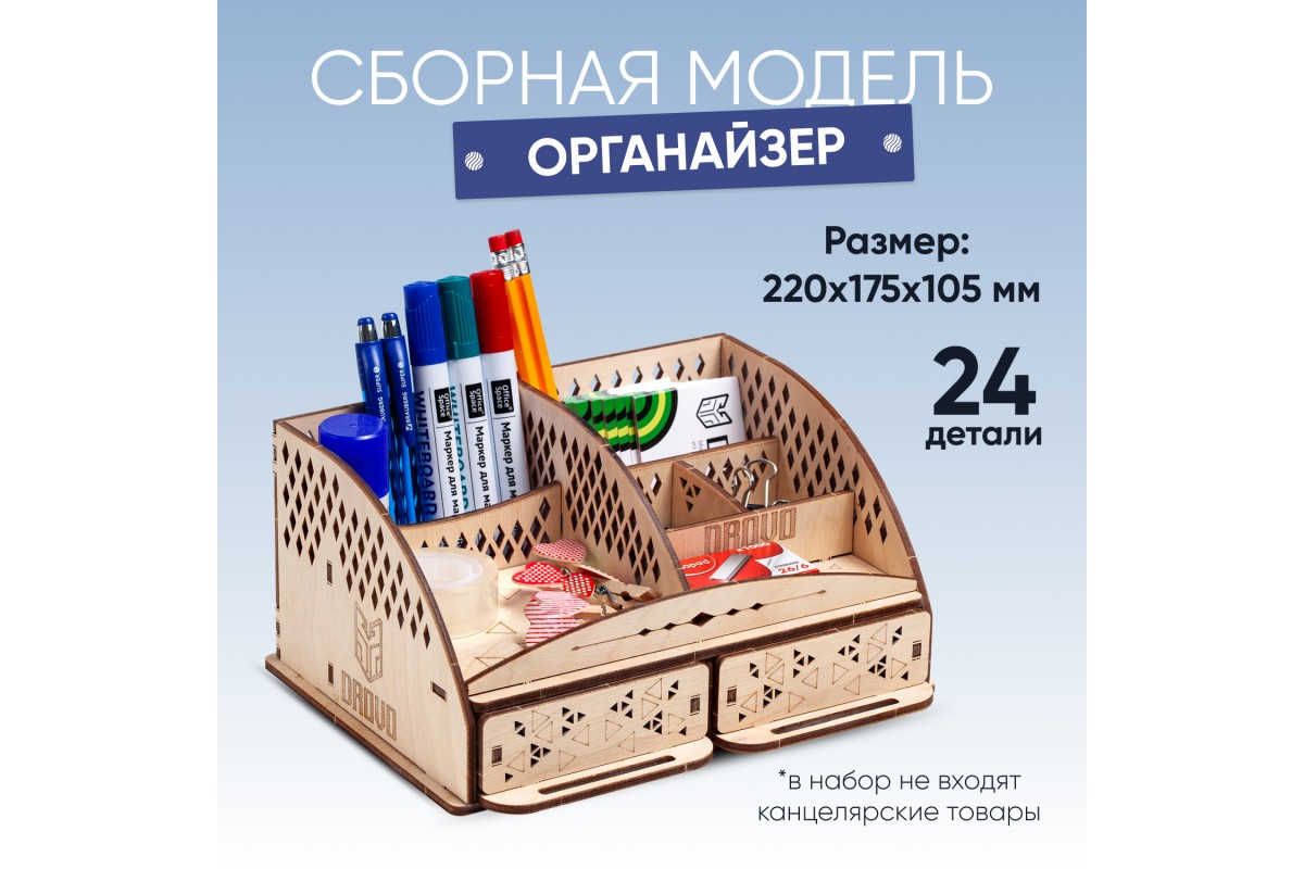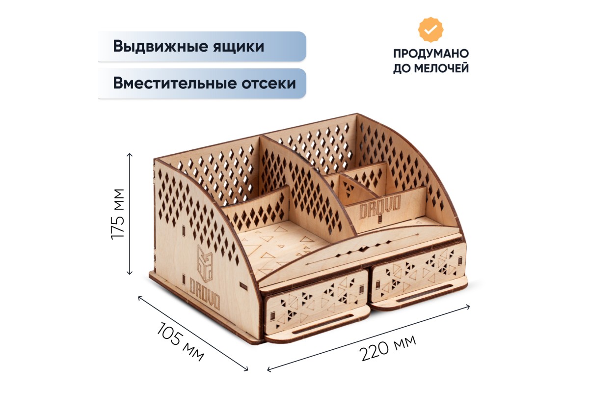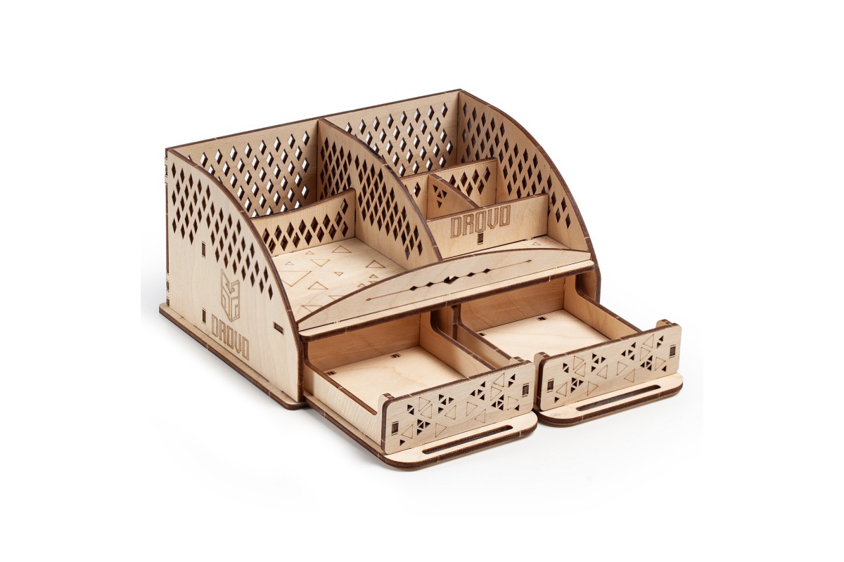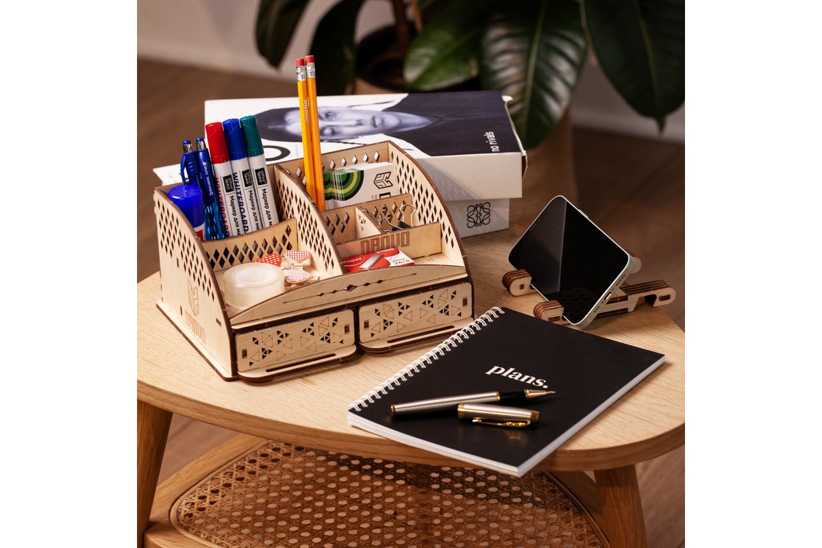 Сборная модель для хранения карандашей и другой канцелярии имеет множество удобных отделений, а так же два выдвижных ящика. Органайзер из фанеры будет хорошо смотреться в интерьере дома и офиса.