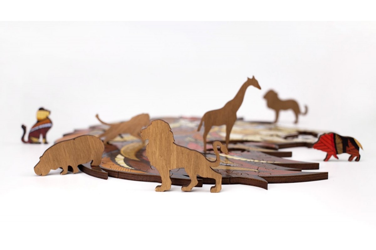 Собирая этот замечательный пазл, вы увидите, что каждый кусочек имеет свою форму, детали в виде африканских животных (львиц, жирафов, слоников, бегемотиков). Процесс сборки настолько увлекательный, что вы не заметите, как пролетит время. Такой пазл будет интересен в любом возрасте.