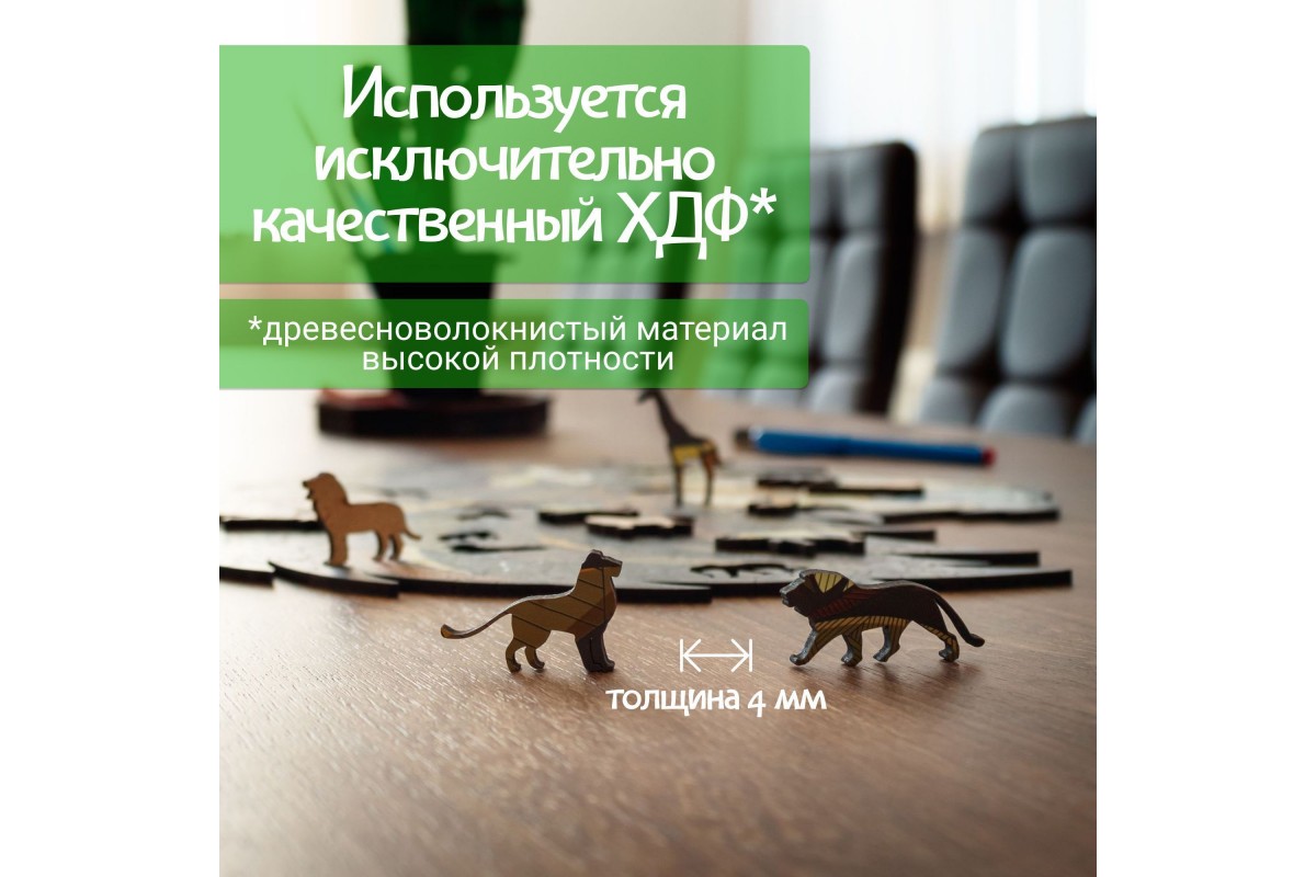 Сам пазл выполнен из экологичного МДФ, с применением высокоточного лазера. Благодаря этому все детали идеально подходят друг к другу. Каждый кусочек приятно держать в руках и ощущать слегка уловимый аромат дерева.