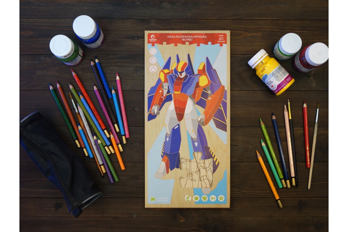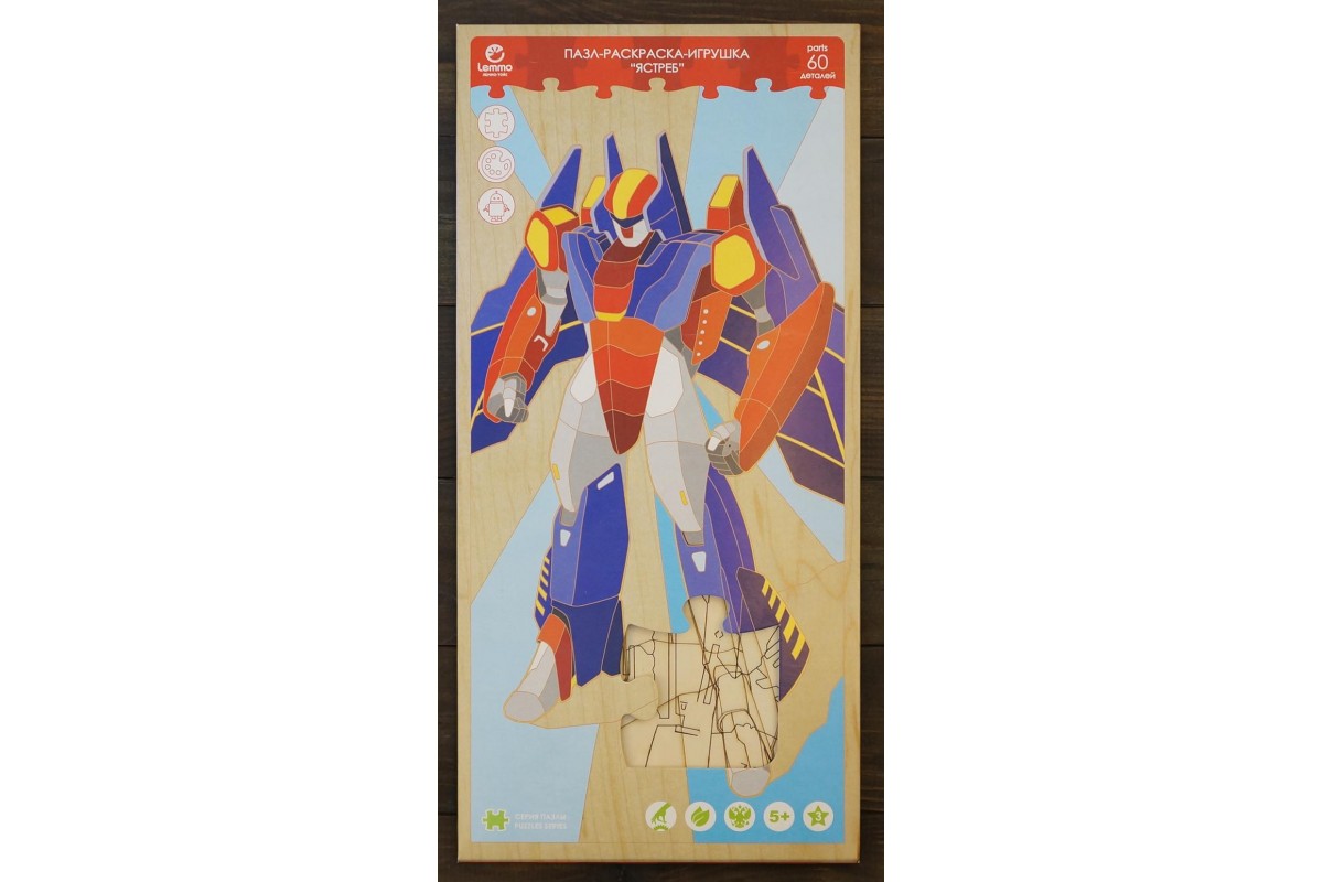 Развивающая игра "Трансформер Ястреб" - это не только деревянный пазл, но и красивая раскраска из дерева, а также сборная модель и деревянный конструктор.