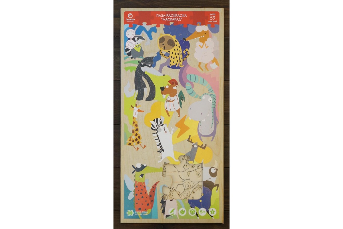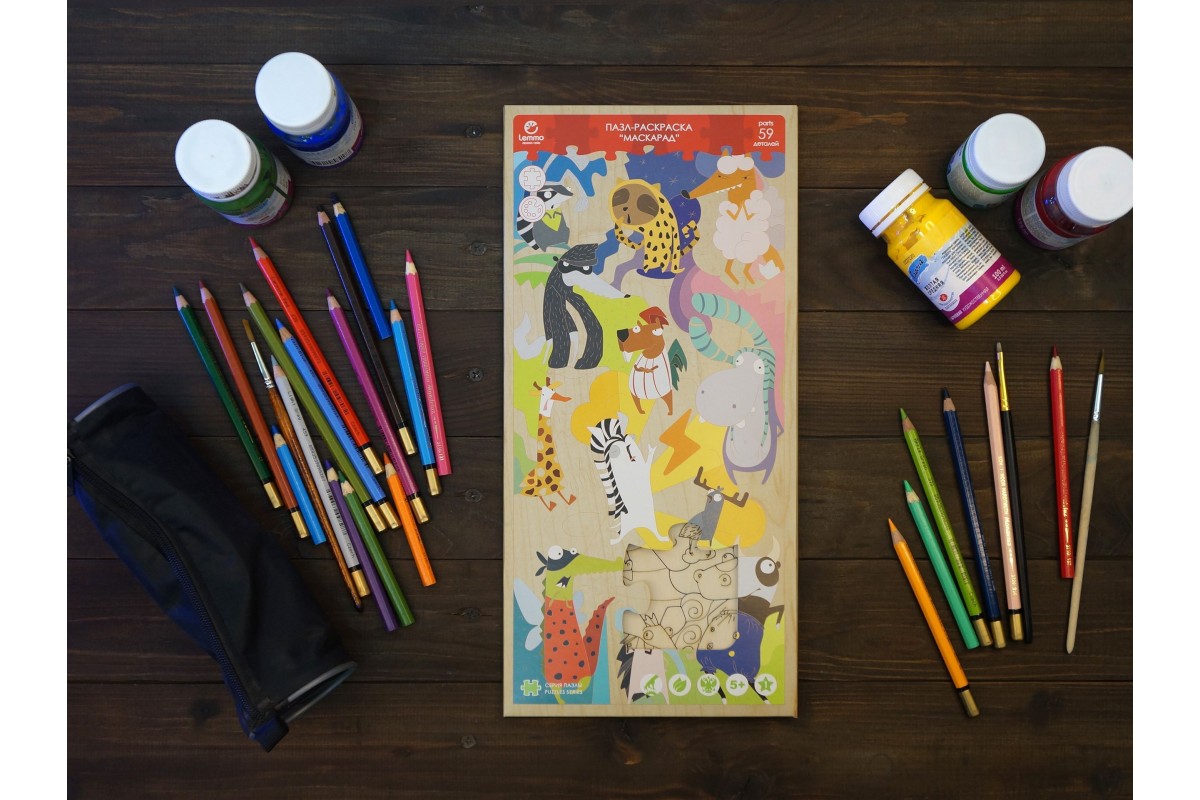 Развивающая игра "Маскарад - это не только деревянный пазл, но и красивая раскраска из дерева.