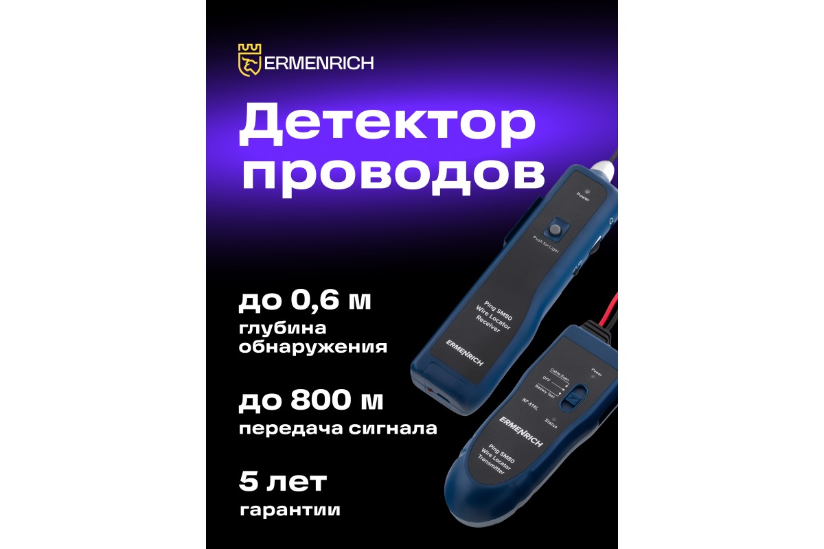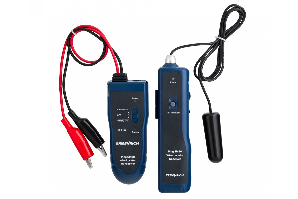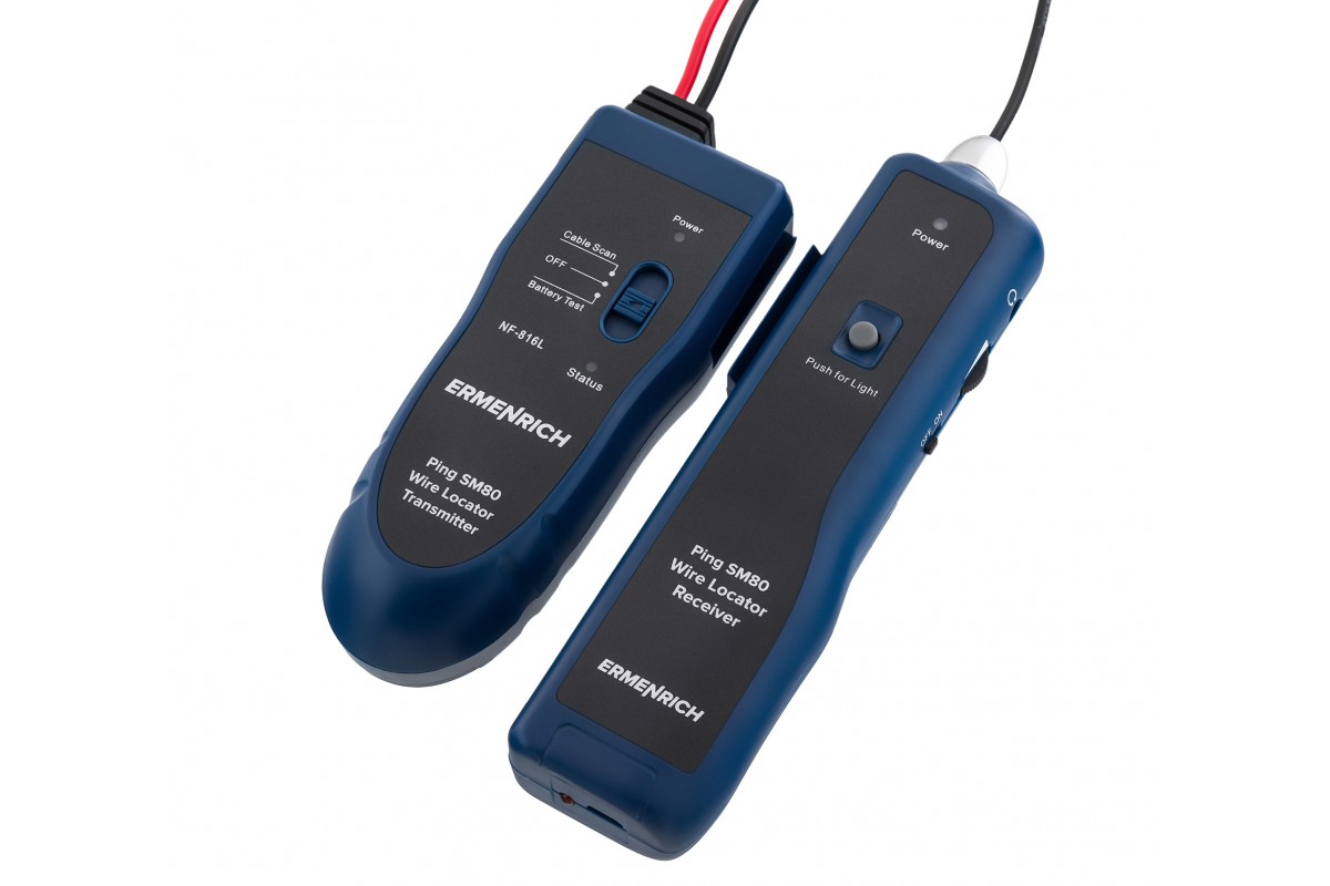 У детектора нет дисплея, управление осуществляется с помощью переключателей и кнопок на передатчике и приемнике. Детектор Ermenrich Ping SM80 работает с кабелями длиной до 800 м. При обнаружении объекта звучит тоновый сигнал. Для работы при сильном шуме сигнал можно не услышать, поэтому в комплекте предусмотрены наушники. Аудиоразъем 3,5 мм для наушников расположен на приемнике. Для питания используются литиевые аккумуляторы емкостью 1500 мАч с зарядкой через кабель microUSB (входит в комплект поставки). Время работы АКБ без подзарядки – примерно 4 часа.