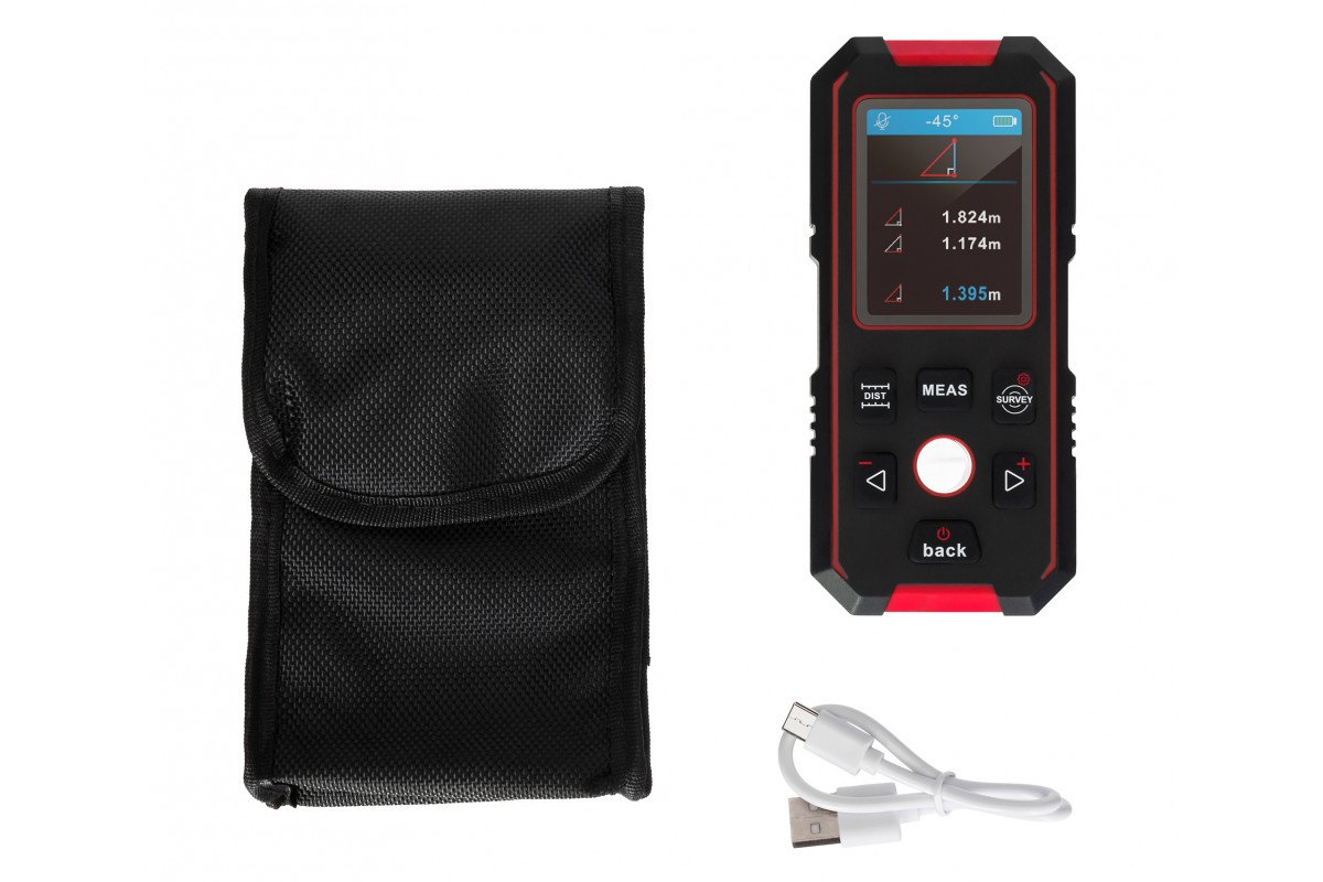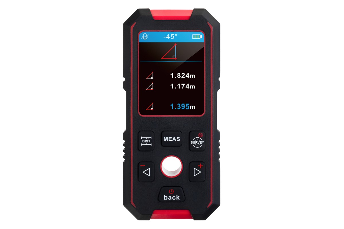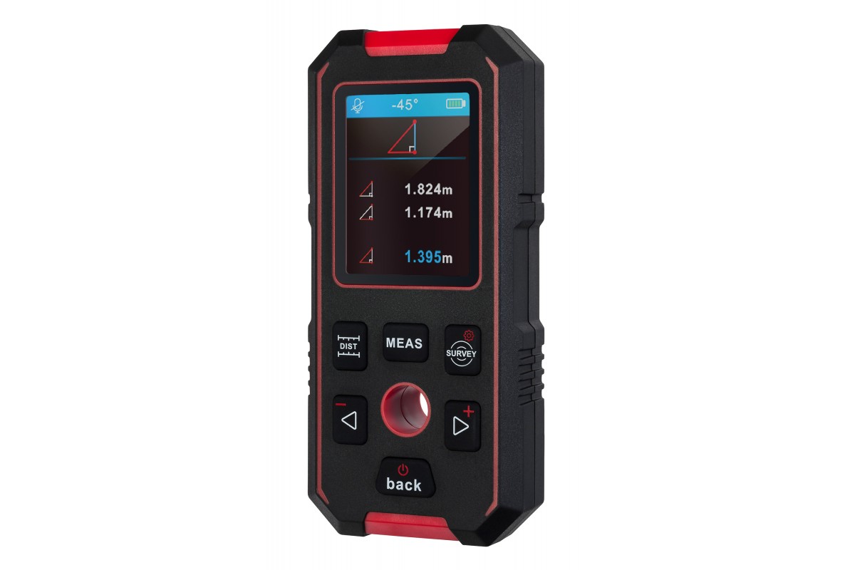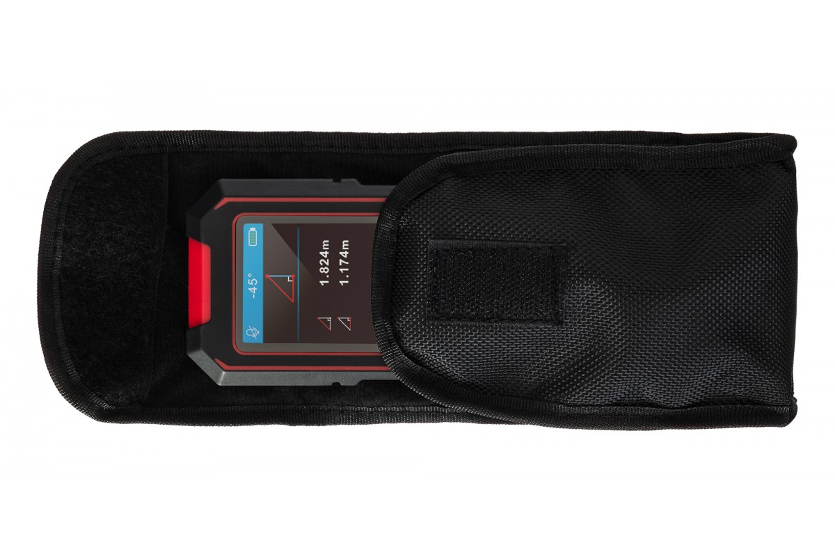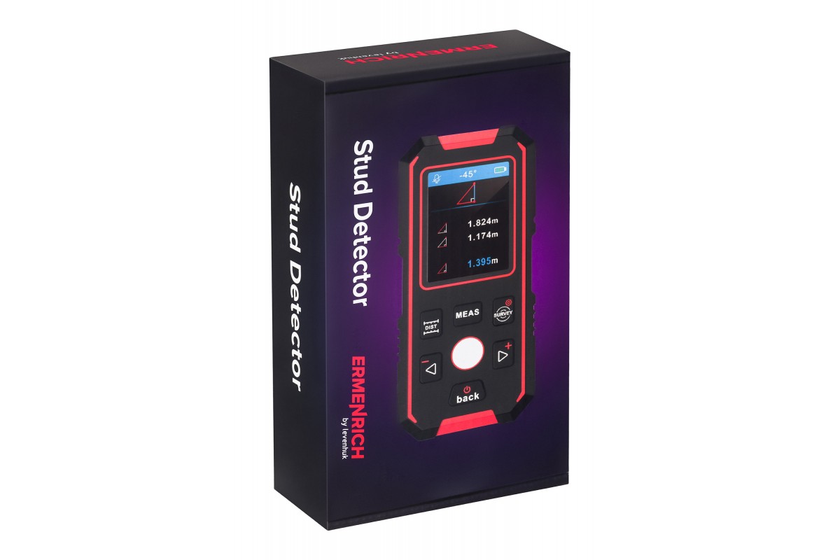 В детекторе Ermenrich Ping SM90 есть функция лазерной рулетки для измерения длины в диапазоне 0,2–40 м, доступно измерение в дюймах и футах. Предусмотрено два режима: единичное измерение или сканирование. Результаты замеров сохраняются во внутренней памяти детектора. По длине, ширине и высоте устройство автоматически вычисляет объем и площадь. С помощью функции «Пифагор» вычисляется длина стороны в прямоугольном треугольнике, например, для определения высоты объекта. Еще одна полезная функция – цифровой уровень для измерения углов от –90° до +90°.