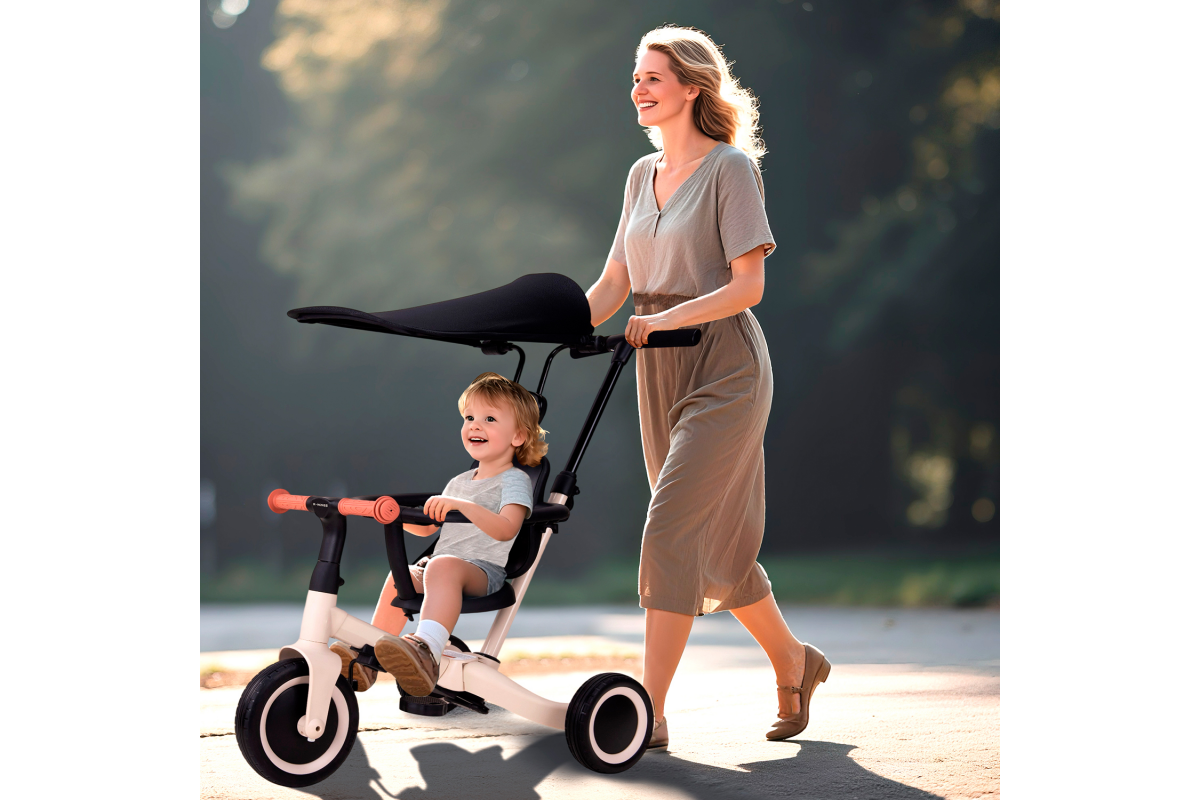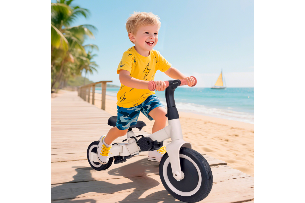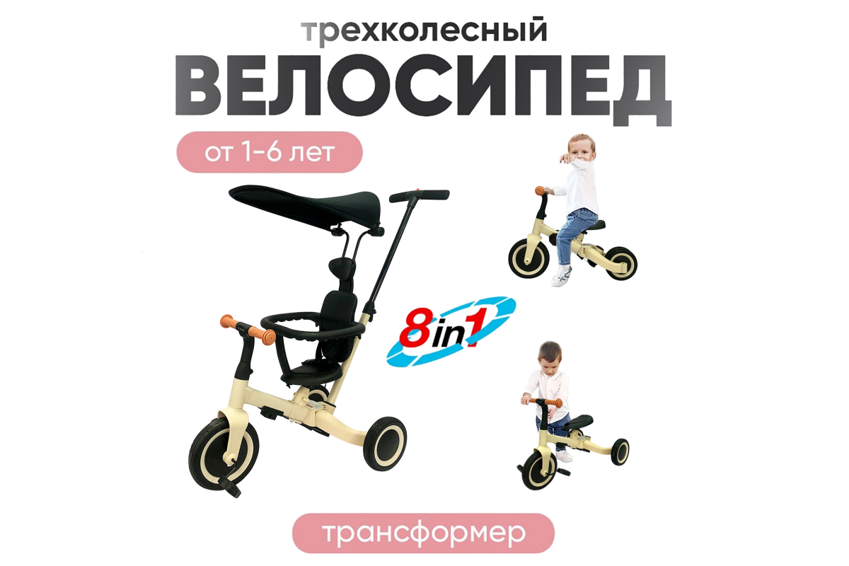 Детский беговел-велосипед 8в1 с крышей и ручкой, бежевый - TR010-BEIGE - это обновленная модель беговела TR008 с боковой поддержкой сиденья и защитным козырьком от солнца. TR0010 - это удобный, универсальный и надежный беговел для детей от 1 до 5 лет, с возможностью становиться велосипедом!