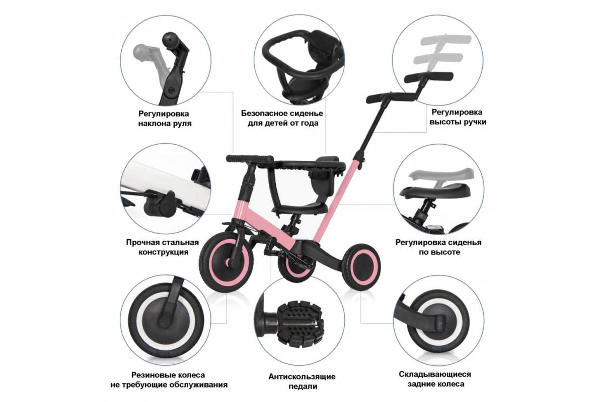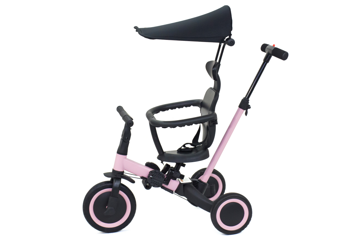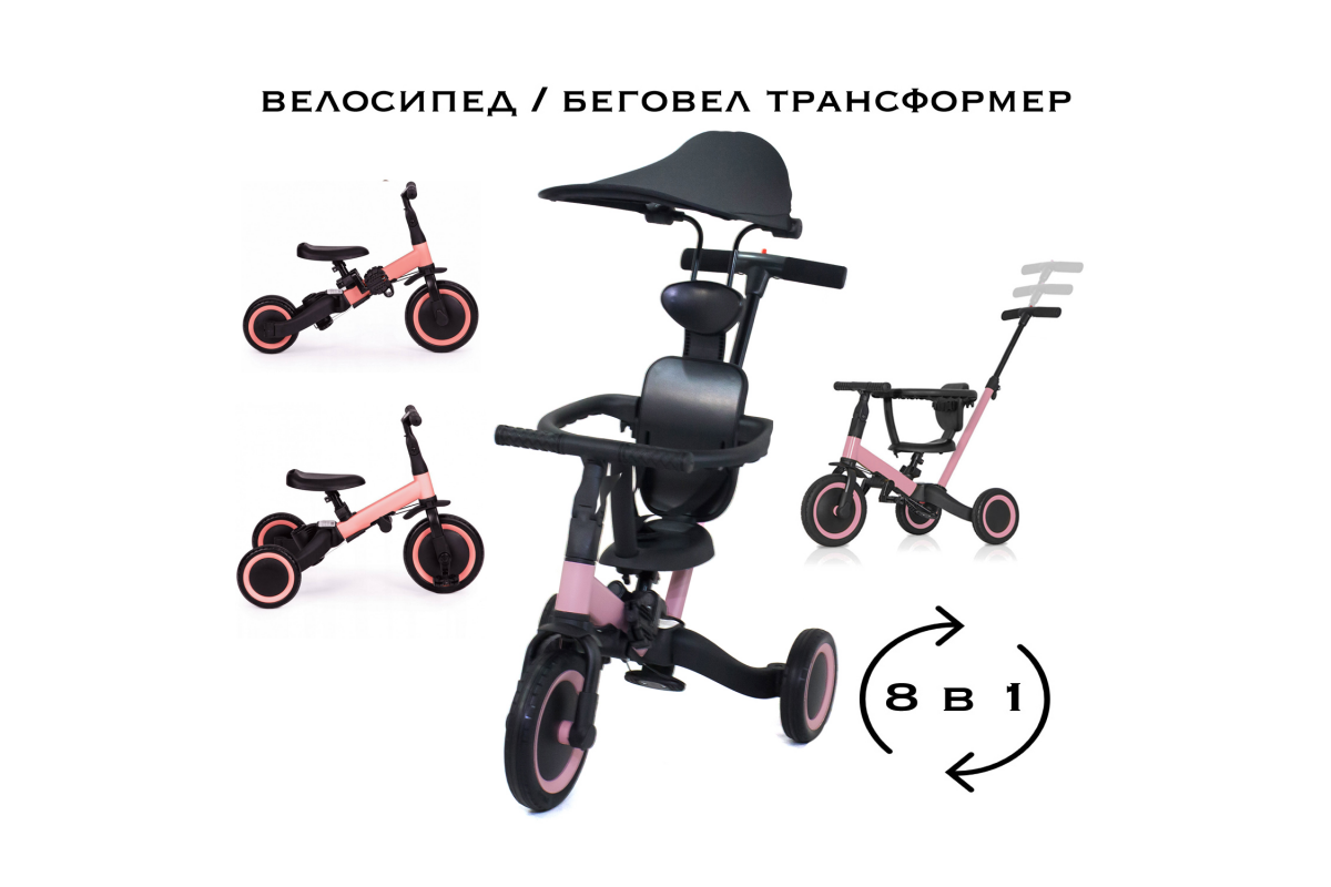 Детский беговел-велосипед 8в1 с крышей и ручкой, розовый - TR008C-PINK - это обновленная модель беговела TR008 с боковой поддержкой сиденья и защитным козырьком от солнца. TR008C - это удобный, универсальный и надежный беговел для детей от 1 до 5 лет, с возможностью становиться велосипедом!