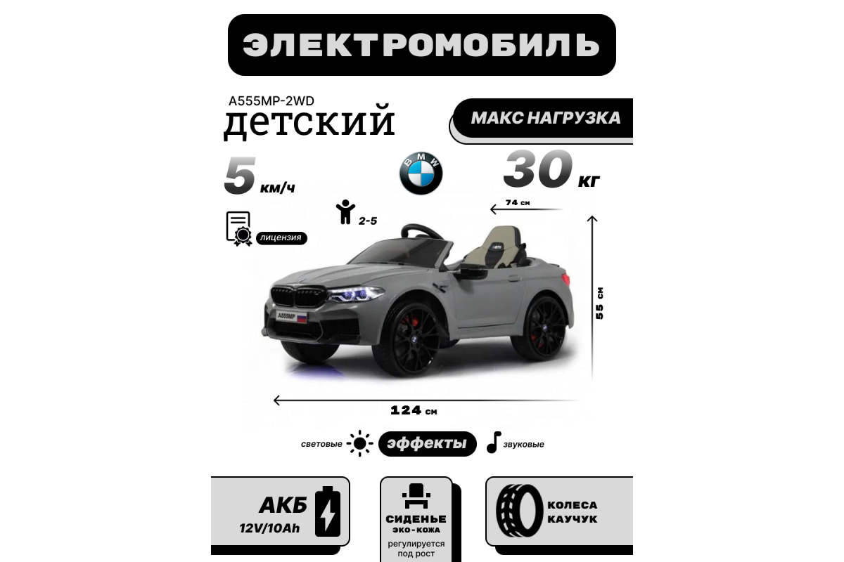 Детский лицензионный электромобиль RiverToys BMW M5 A555MP имеет дистанционное управление. Пульт настраивается по Bluetooth и работает от 2 батареек ААА. Сидение выполнено из перфорированной эко-кожи и оснащено 5-ти точечным ремнем безопасности.