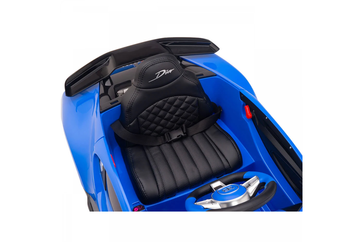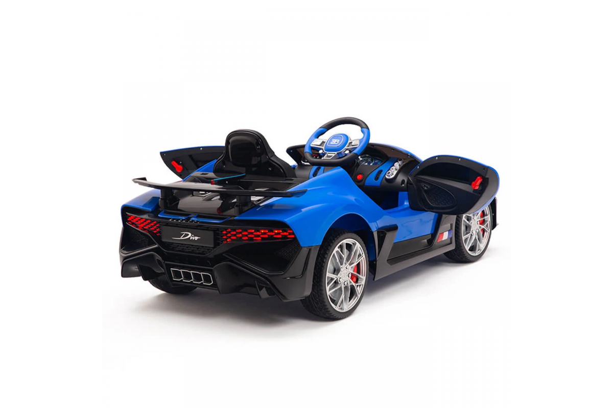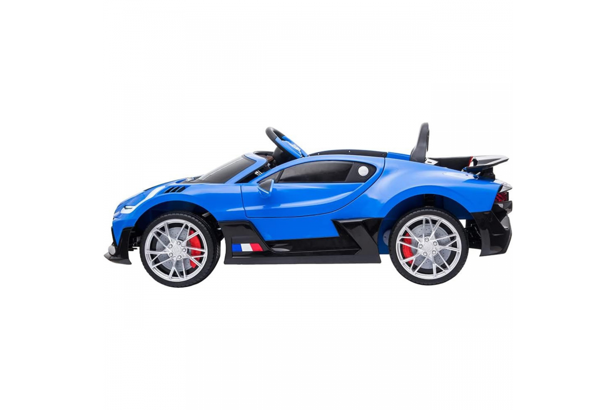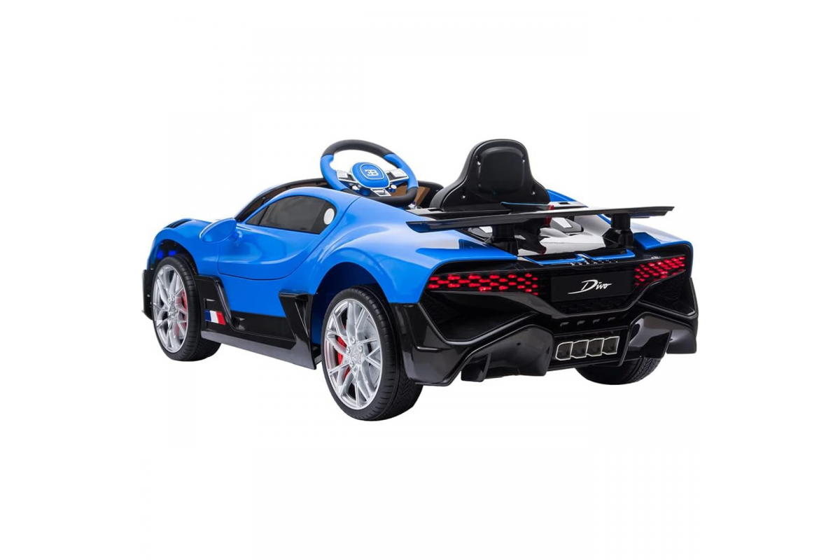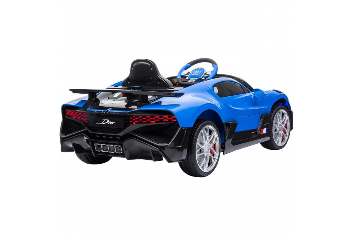 Детский электромобиль Bugatti Divo (синий, 12V) - HL338 - это детский одноместный электромобиль Bugatti Divo по лицензии известного автоконцерна выполнен по стилю легендарной спортивной версии Bugatti. Двухскоростной автомобиль с пультом радиоуправления, у него открываются боковые двери и багажник. Отличие этой модели от других – мягкие резиновые колеса, встроенная магнитола, LEВ подсветка фар и звук мотора, сиденье из перфорированной черной экокожи с логотипом и пульт управления 2.4G.