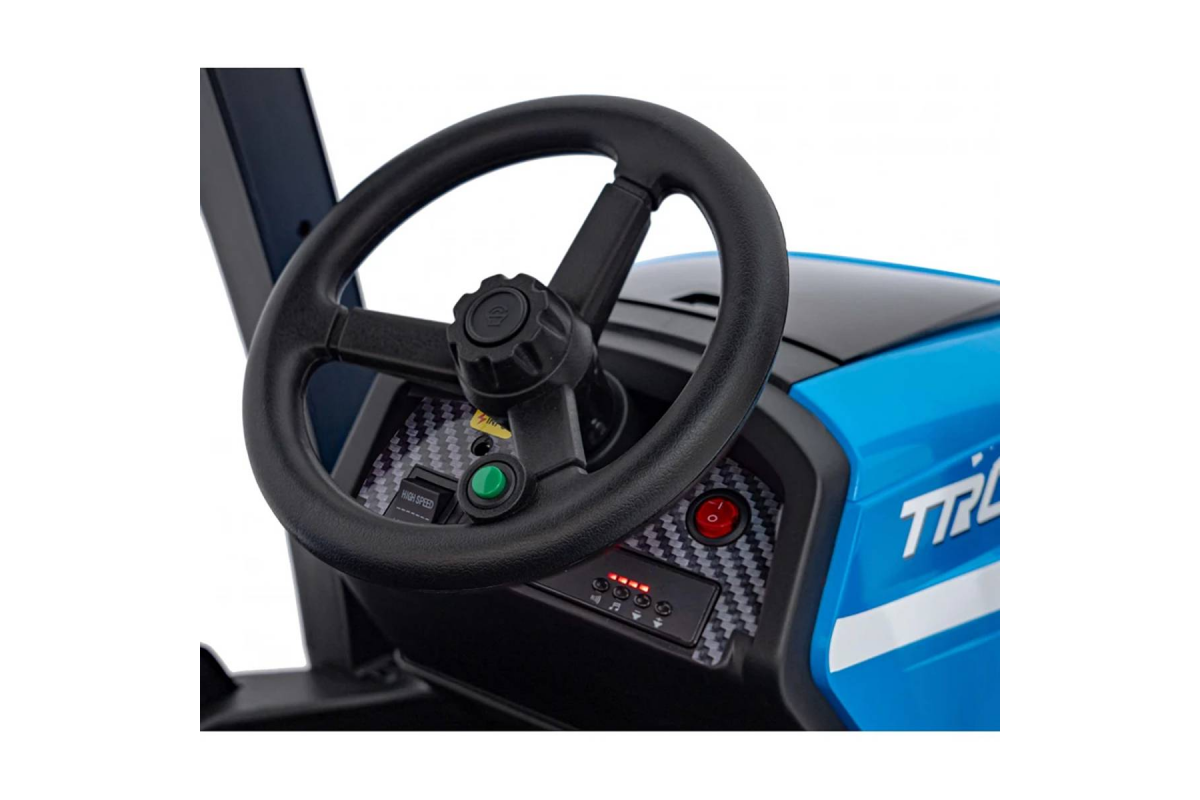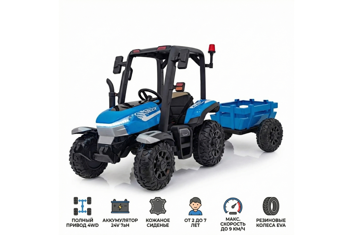 Детский электромобиль трактор с прицепом (синий, EVA, 4WD, пульт, 24V) - BLT-206C-4WD-24V-BLUE - это мощный и очень реалистичный детский трактор с крышей и прицепом. Модель комплектуется легкосъемным аккумулятором, EVA колеса с приводом на два задние колеса, мощные моторы по 200 ватт каждый, предназначен для ребенка от 2 до 7 лет, который любит большую сельскохозяйственную технику.