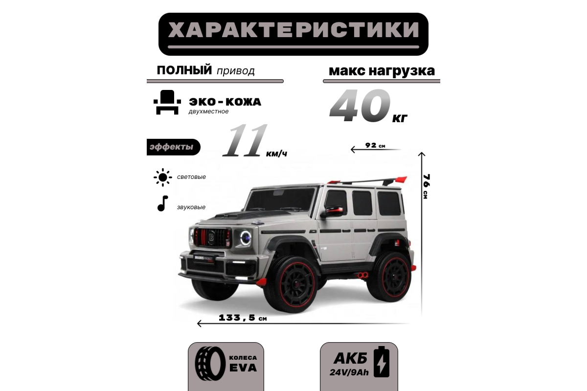 Световые эффекты: фары передние, задние фары, подсветка передней решетки (3 режима: вкл, аварийка, выкл.)