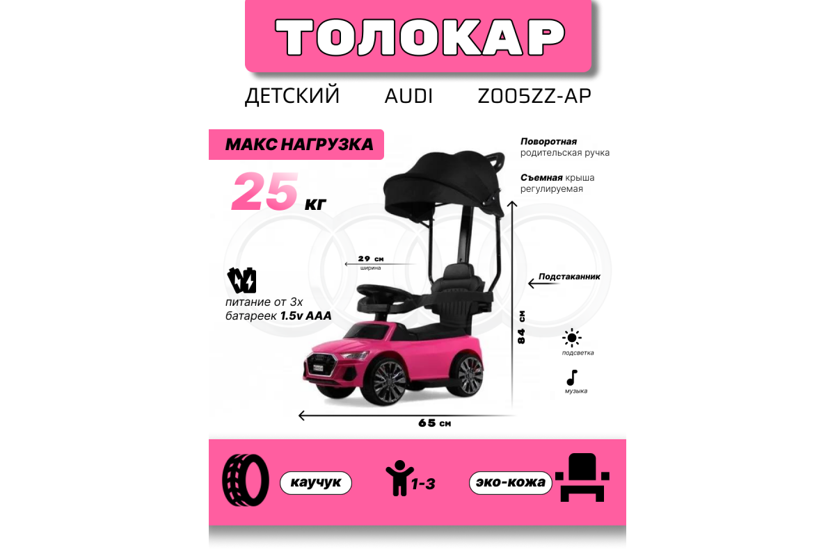 - Световые и звуковые эффекты:Музыкальный руль: звук клаксона/мелодии заводские (от батареек 3шт 1.5V AAA) Световые эффекты: светятся передние фары