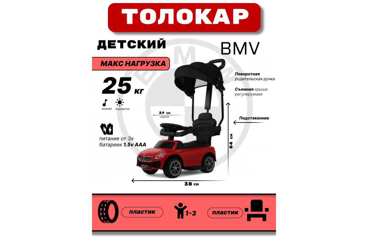 - Световые и звуковые эффекты:Музыкальный руль: звук клаксона/мелодии заводские (от батареек 3шт 1.5V AAA) Световые эффекты: светятся передние фары
