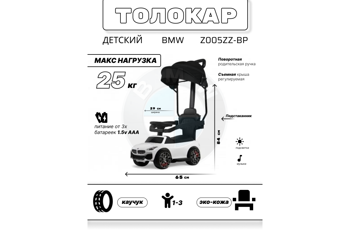 - Световые и звуковые эффекты:Музыкальный руль: звук клаксона/мелодии заводские (от батареек 3шт 1.5V AAA) Световые эффекты: светятся передние фары