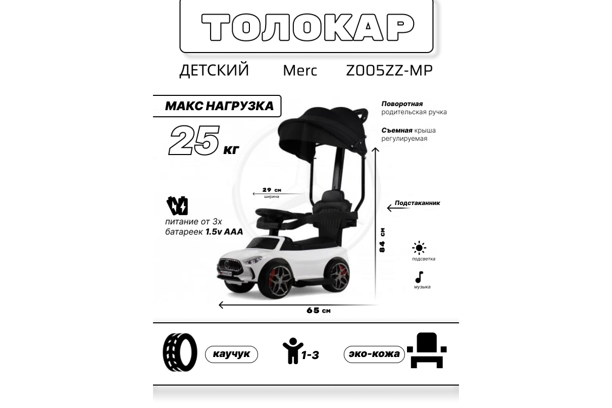 - Световые и звуковые эффекты:Музыкальный руль: звук клаксона/мелодии заводские (от батареек 3шт 1.5V AAA) Световые эффекты: светятся передние фары