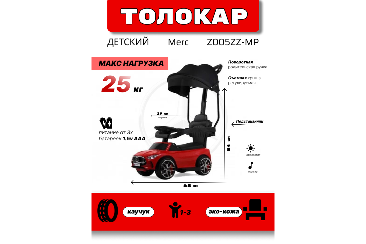 - Световые и звуковые эффекты:Музыкальный руль: звук клаксона/мелодии заводские (от батареек 3шт 1.5V AAA) Световые эффекты: светятся передние фары