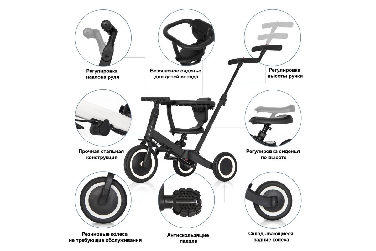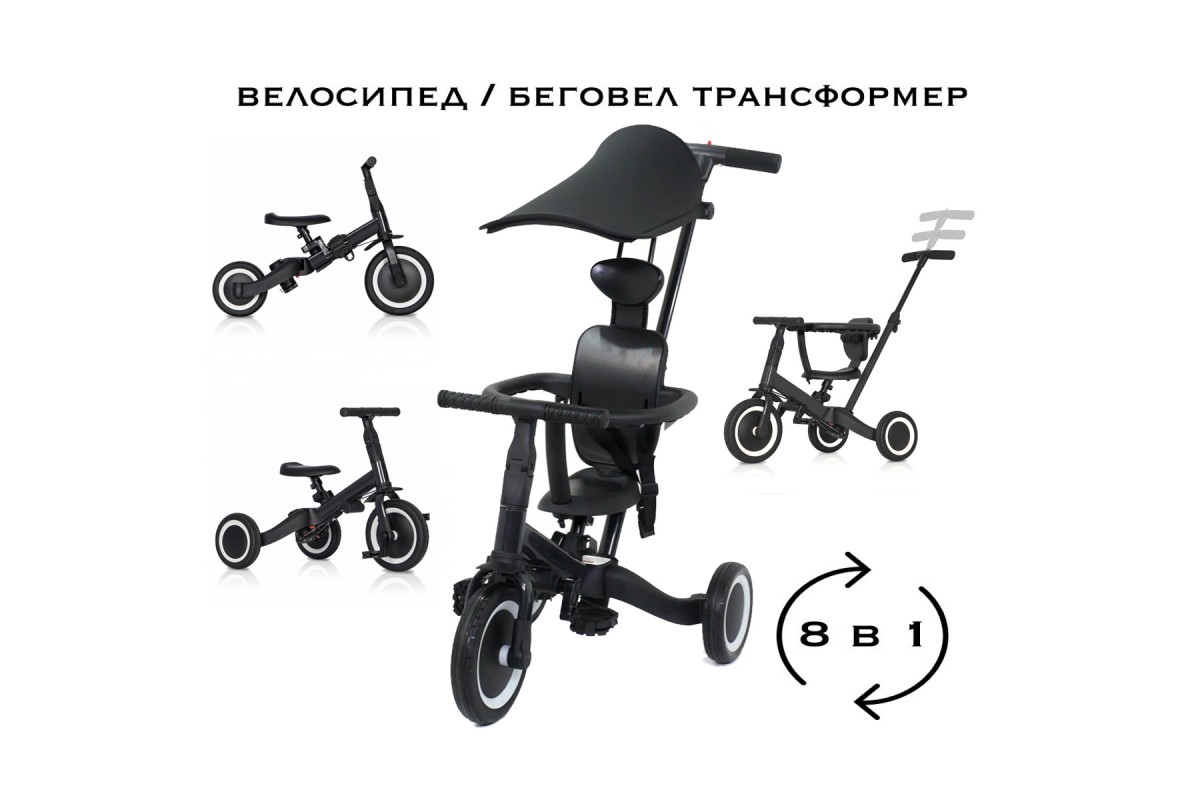 Детский беговел-велосипед 8в1 с крышей и ручкой, черный - TR008C-BLACK - это обновленная модель беговела TR008 с боковой поддержкой сиденья и защитным козырьком от солнца. TR008C - это удобный, универсальный и надежный беговел для детей от 1 до 5 лет, с возможностью становиться велосипедом!