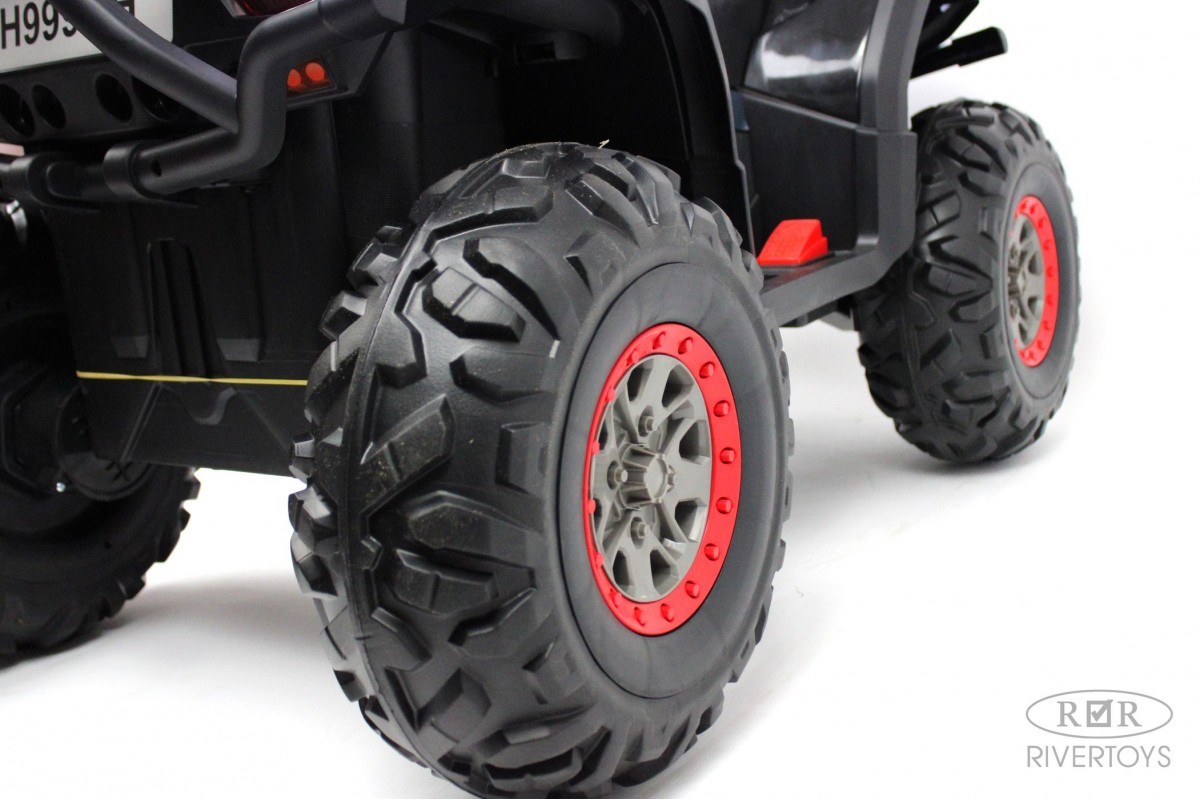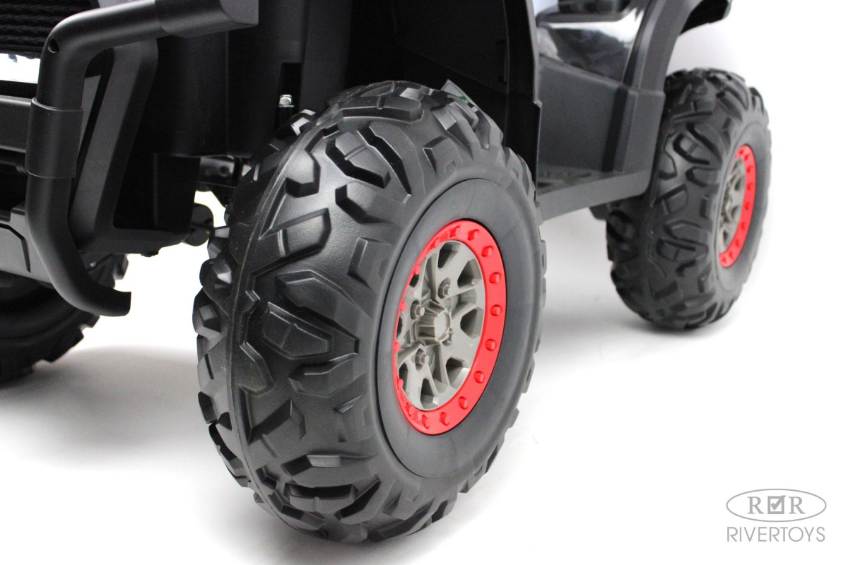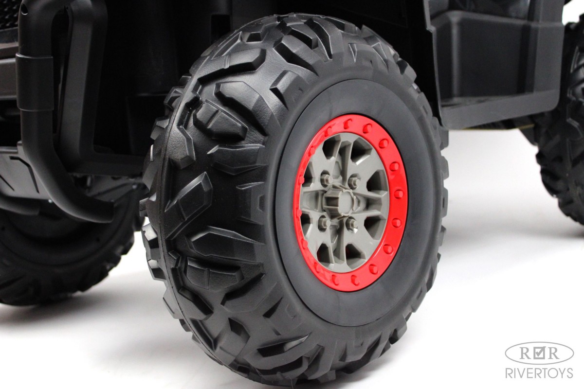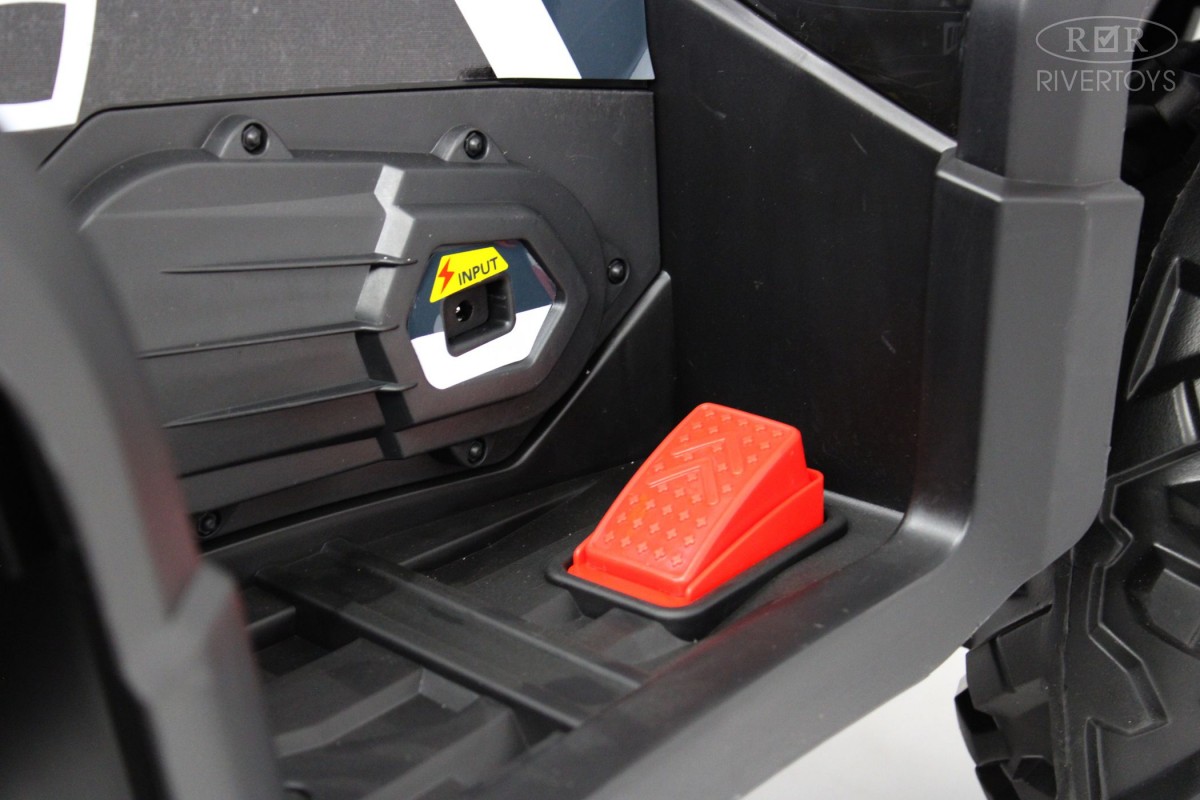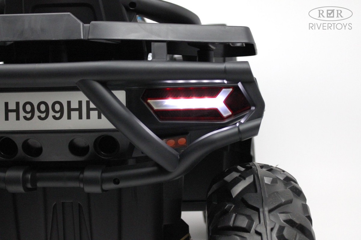 Отдельной кнопкой включается подсветка передних и задних фар. Хорошую проходимость обеспечивают большие резиновые колеса и высокий клиренс. На задних колесах установлены амортизаторы. Есть заводские мелодии. Запуск двигателя производится посредством ключа.