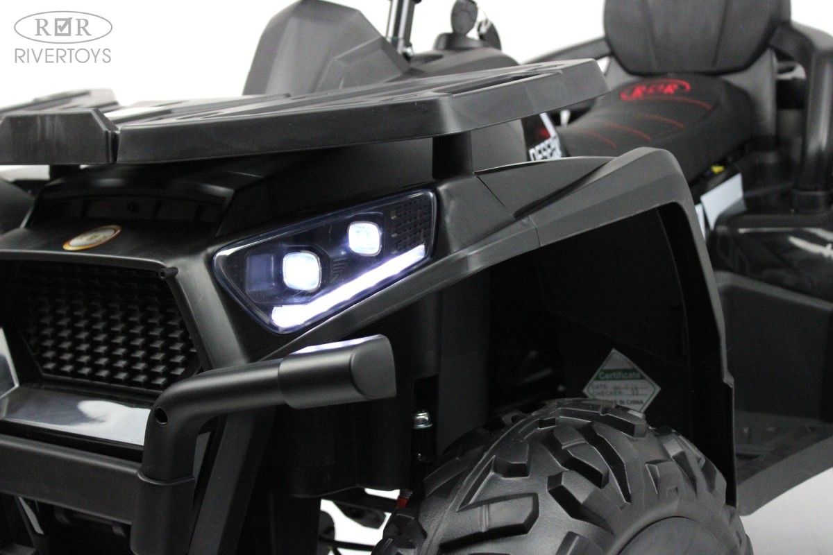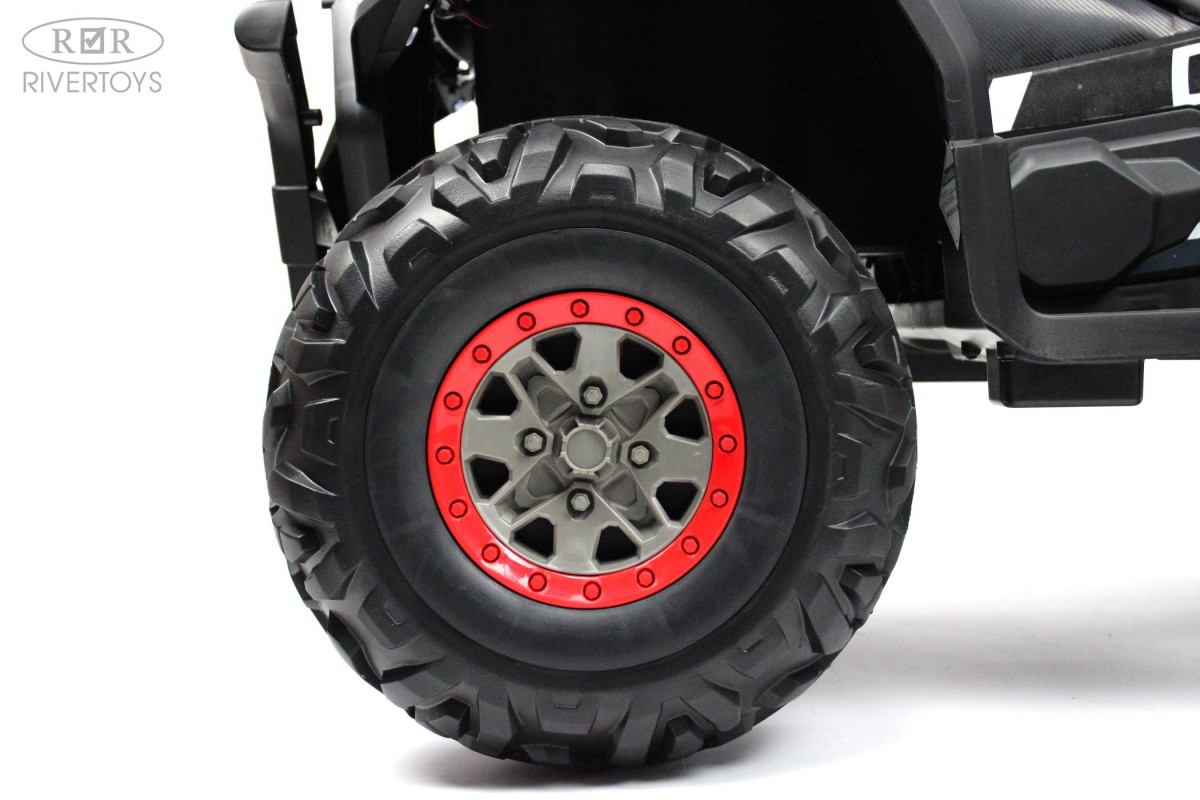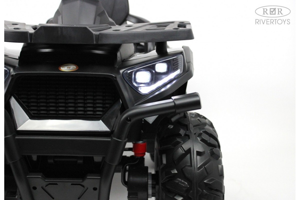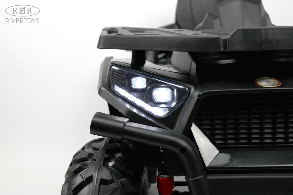 Отдельной кнопкой включается подсветка передних и задних фар. Хорошую проходимость обеспечивают большие резиновые колеса и высокий клиренс. На задних колесах установлены амортизаторы. Есть заводские мелодии. Запуск двигателя производится посредством ключа.