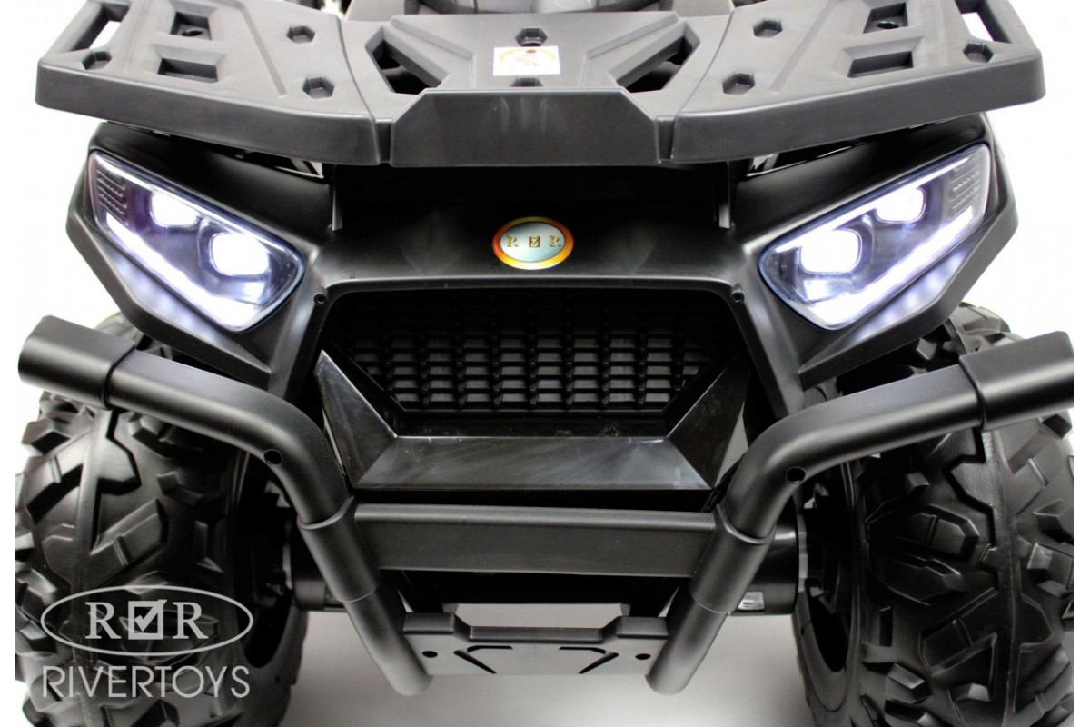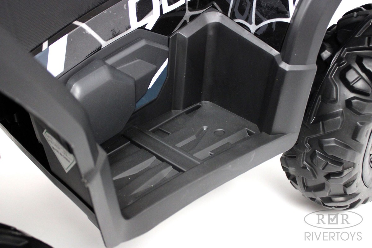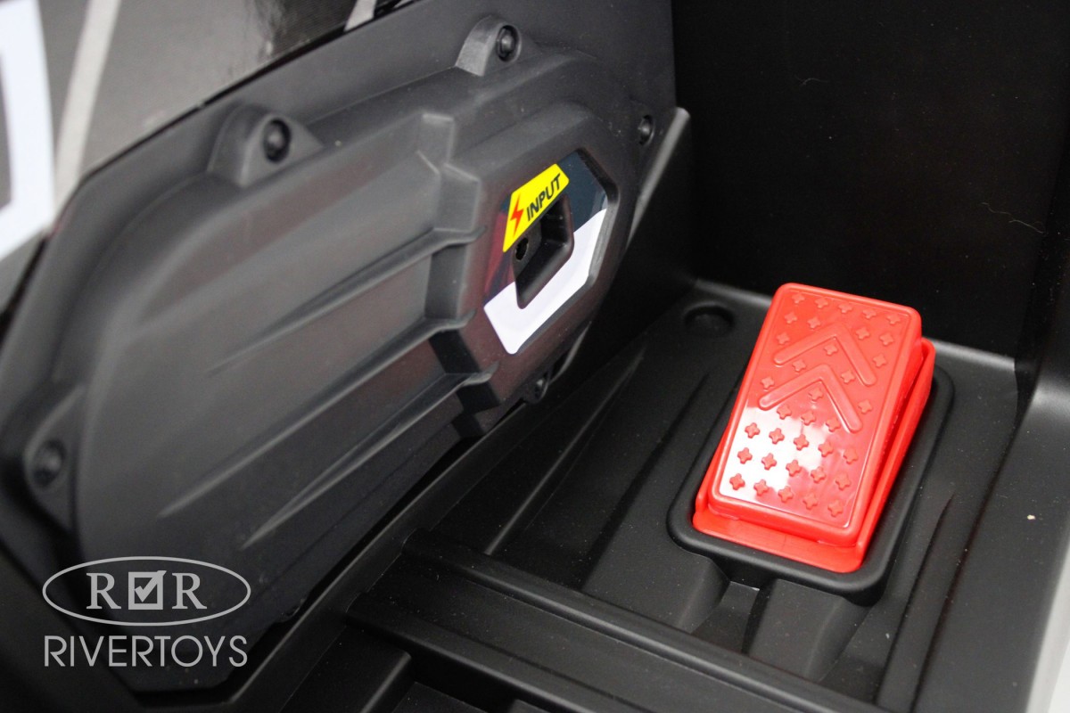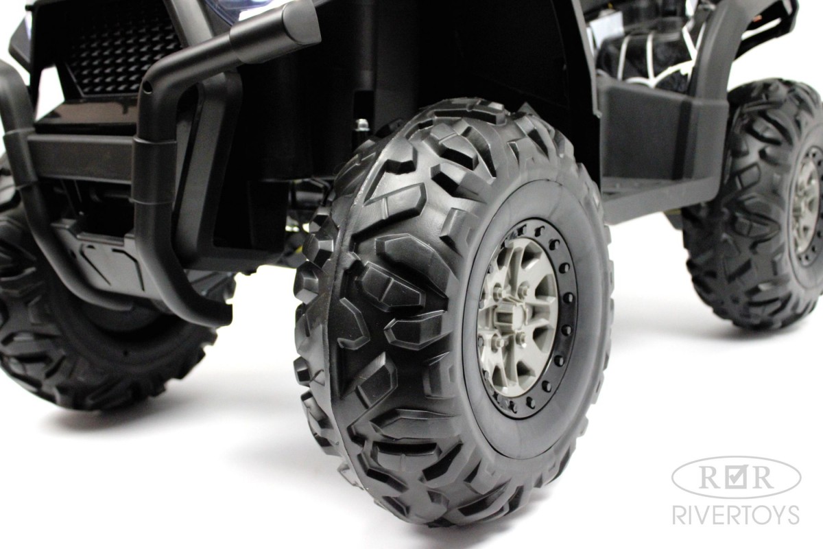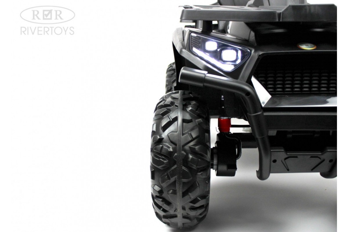 Отдельной кнопкой включается подсветка передних и задних фар. Хорошую проходимость обеспечивают большие резиновые колеса и высокий клиренс. На задних колесах установлены амортизаторы. Есть заводские мелодии. Запуск двигателя производится посредством ключа.