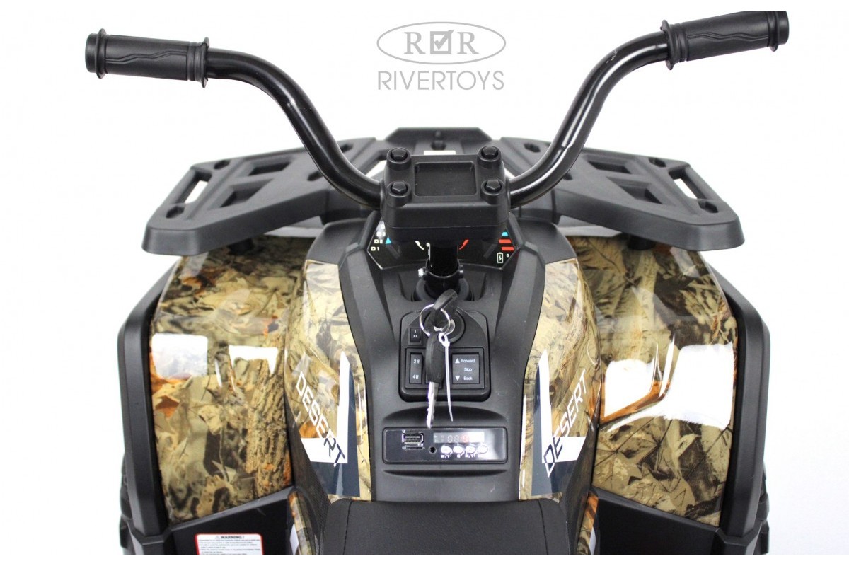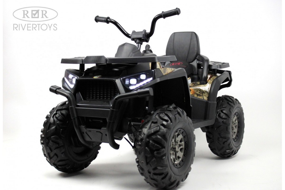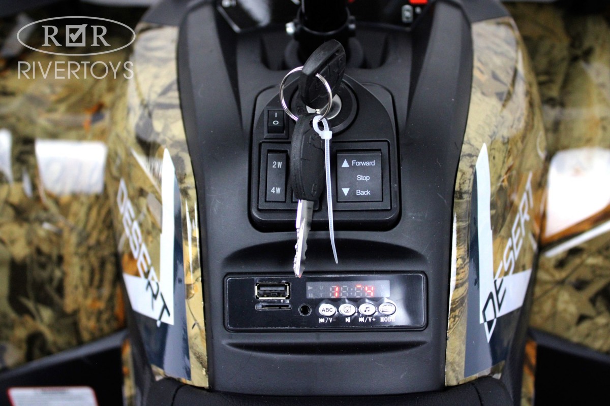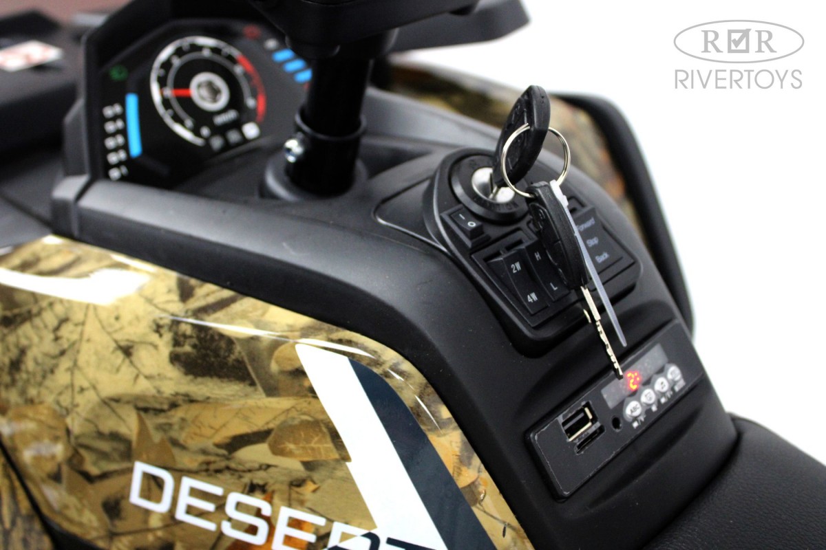 Отдельной кнопкой включается подсветка передних и задних фар. Хорошую проходимость обеспечивают большие резиновые колеса и высокий клиренс. На задних колесах установлены амортизаторы. Есть заводские мелодии. Запуск двигателя производится посредством ключа.